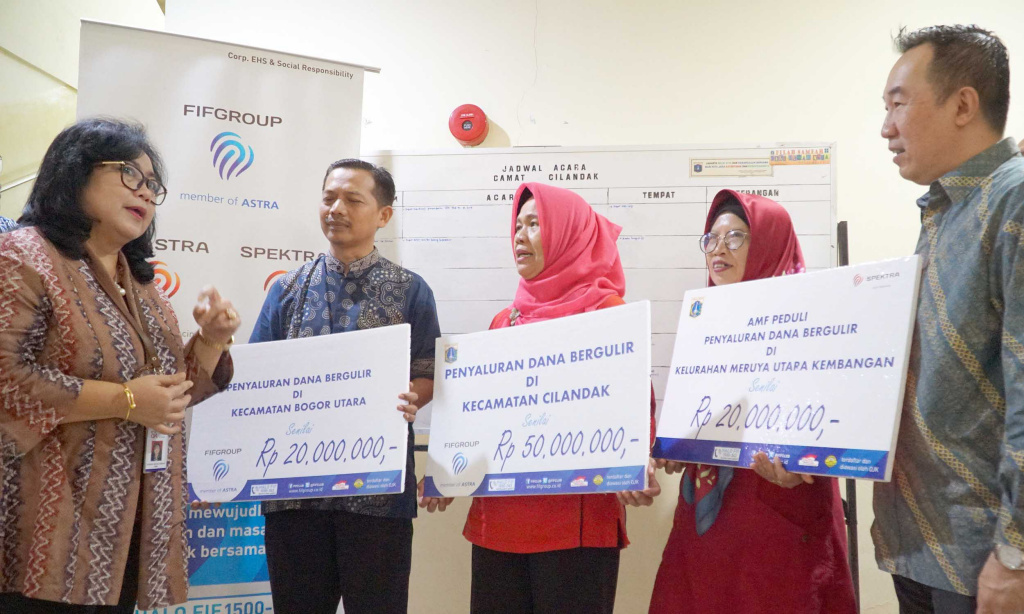 Kepala Departemen Literasi dan Inklusi Otoritas Jasa Keuangan (OJK) Sondang Martha Br Samosir (kiri) bersama Finance Director FIFGROUP Hugeng Gozali (kanan) berbincang dengan Tiga peserta perwakilan penerima bantuan dana bergulir dari berbagai kecamatan disela kegiatan dan pemberian dana bergulir serta pelatihan literasi keuangan di Jakarta, Jumat (8/3). AKTUAL/STR-Eko S Hilman