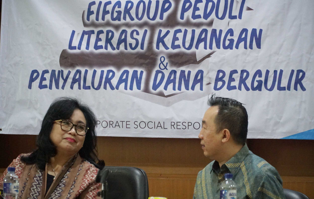 Kepala Departemen Literasi dan Inklusi Otoritas Jasa Keuangan (OJK) Sondang Martha Br Samosir (kiri) dan Finance Director FIFGROUP Hugeng Gozali (kanan) berbincang bincang disela kegiatan dan pemberian dana bergulir serta pelatihan literasi keuangan di Jakarta, Jumat (8/3). AKTUAL/STR-Eko S Hilman