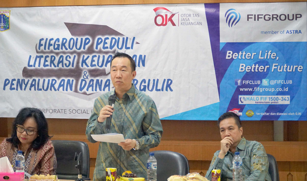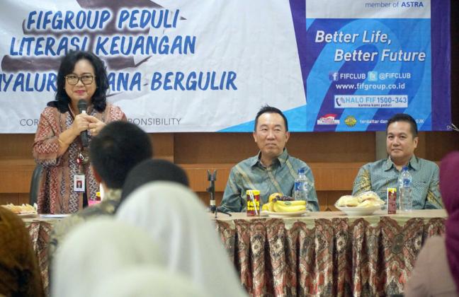 Finance Director FIFGROUP, Hugeng Gozali (kanan) didampingi Kepala Departemen Literasi dan Inklusi Otoritas Jasa Keuangan (OJK) Sondang Martha Br Samosir (kiri) dan President Director AMF Ardian Prasetya saat memberikan sambutan disela kegiatan dan pemberian dana bergulir serta pelatihan literasi keuangan di Jakarta, Jumat (8/3). AKTUAL/STR-Eko S Hilman