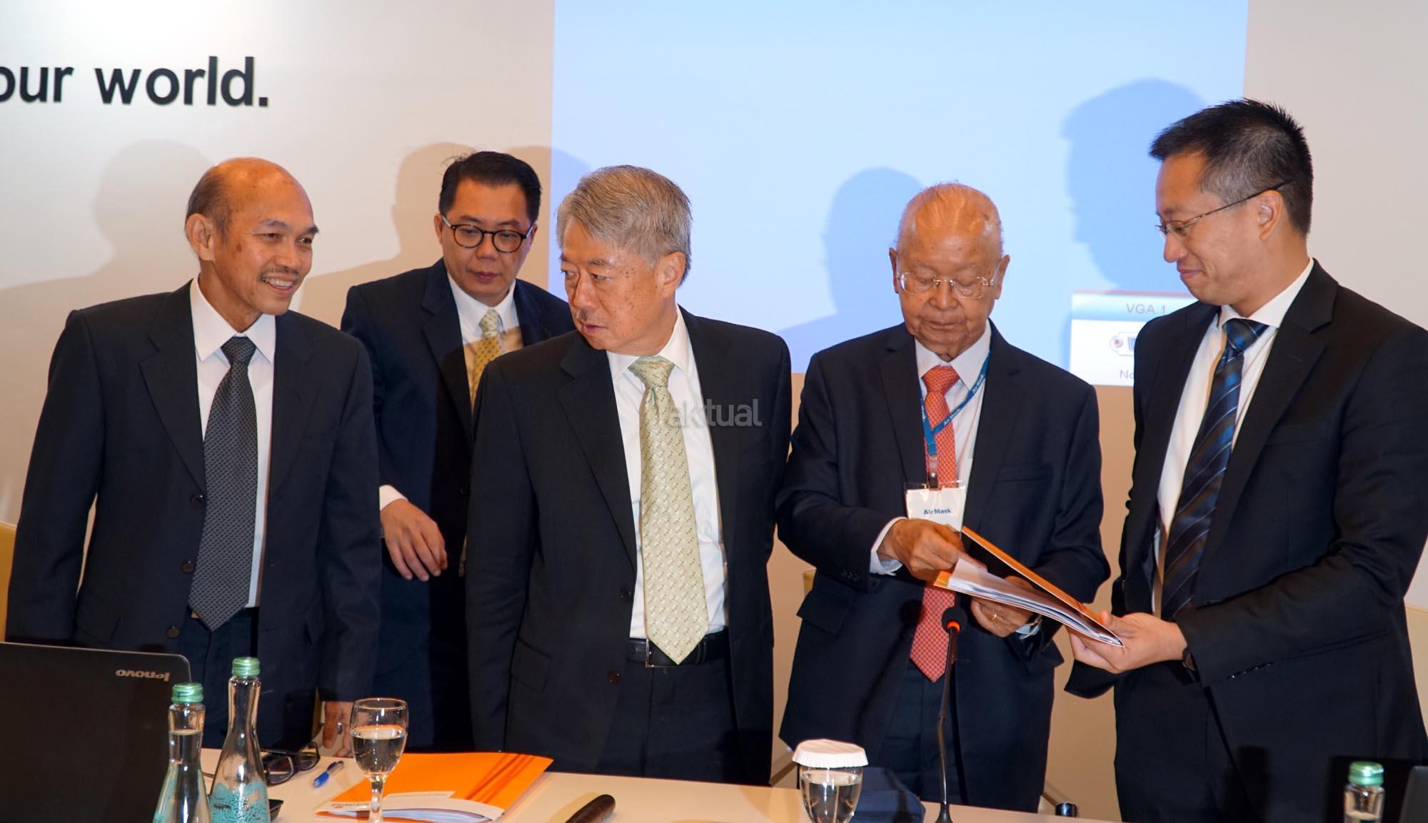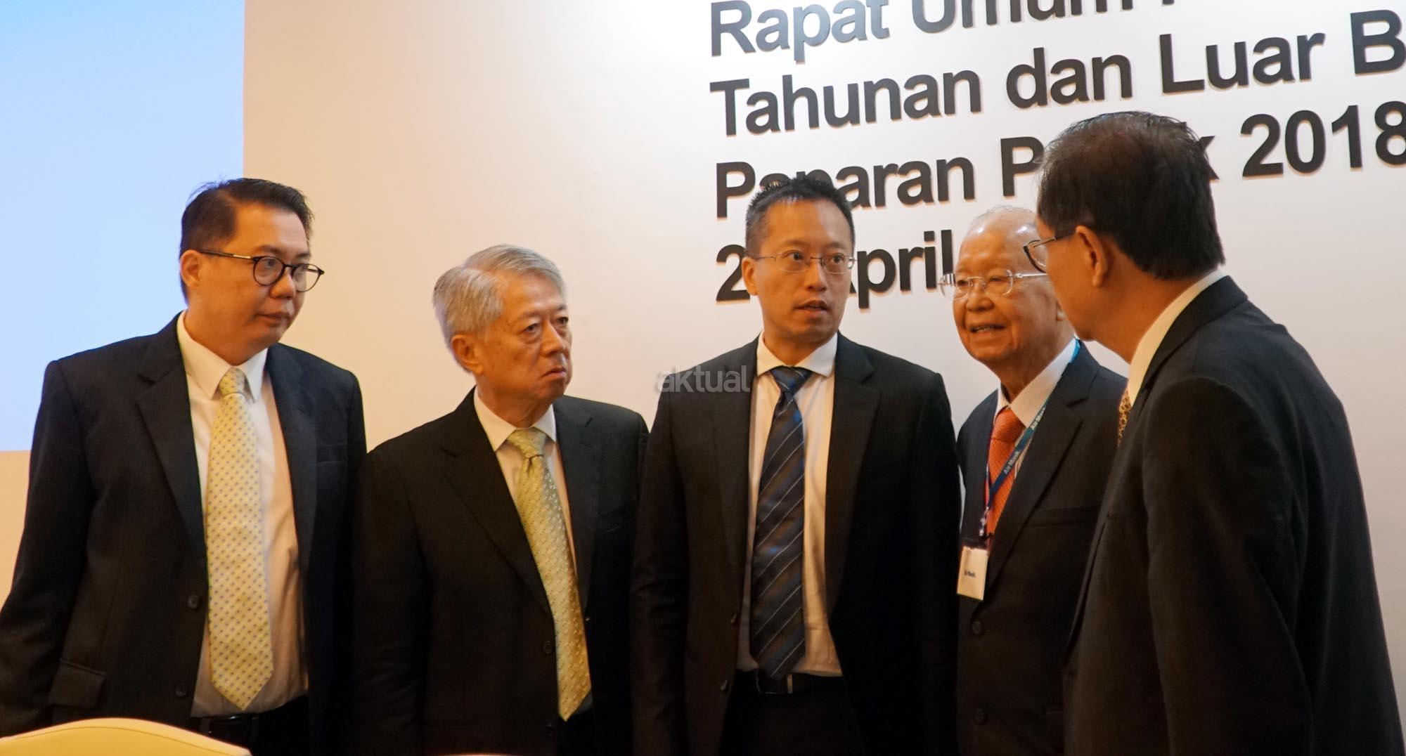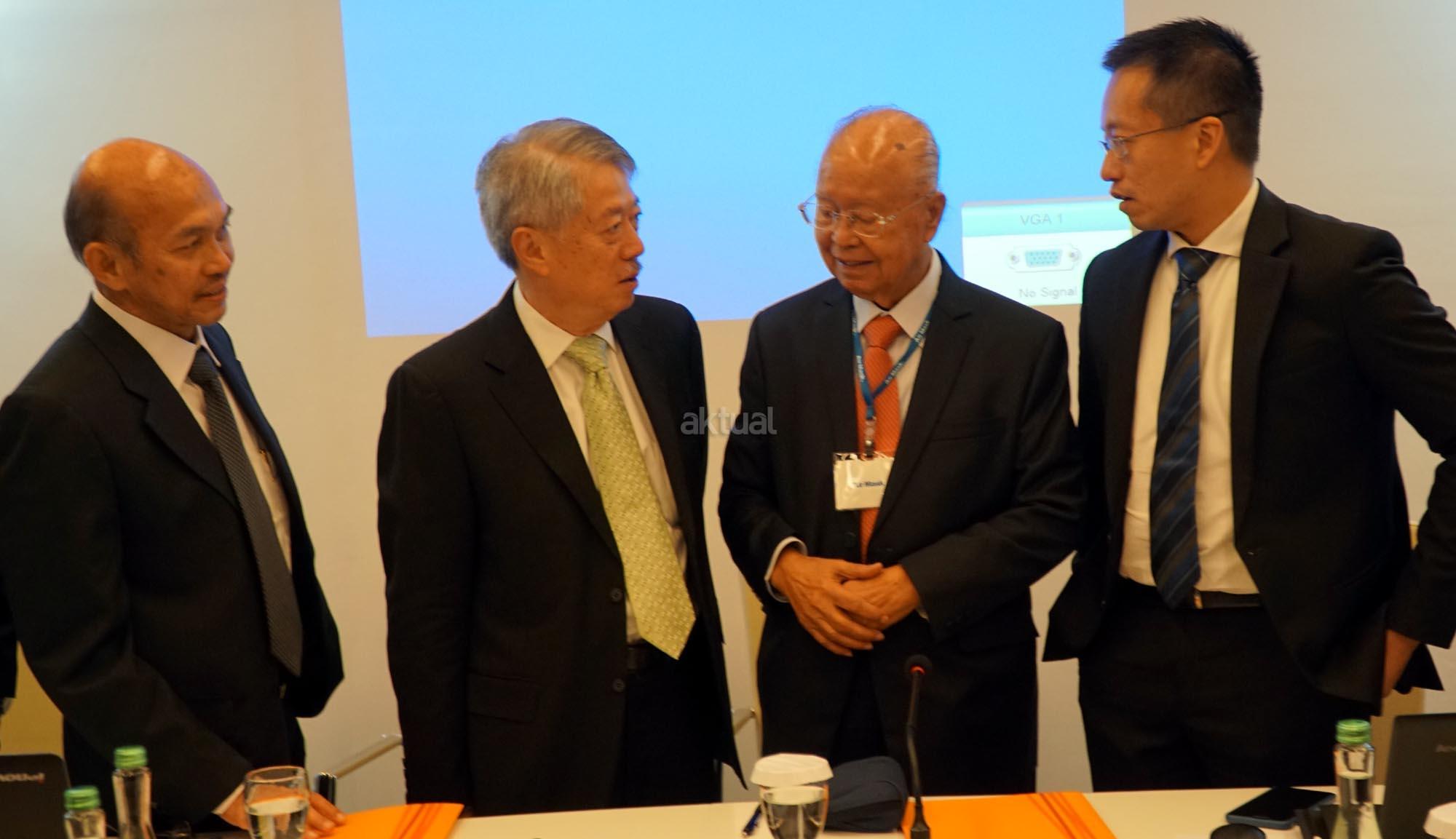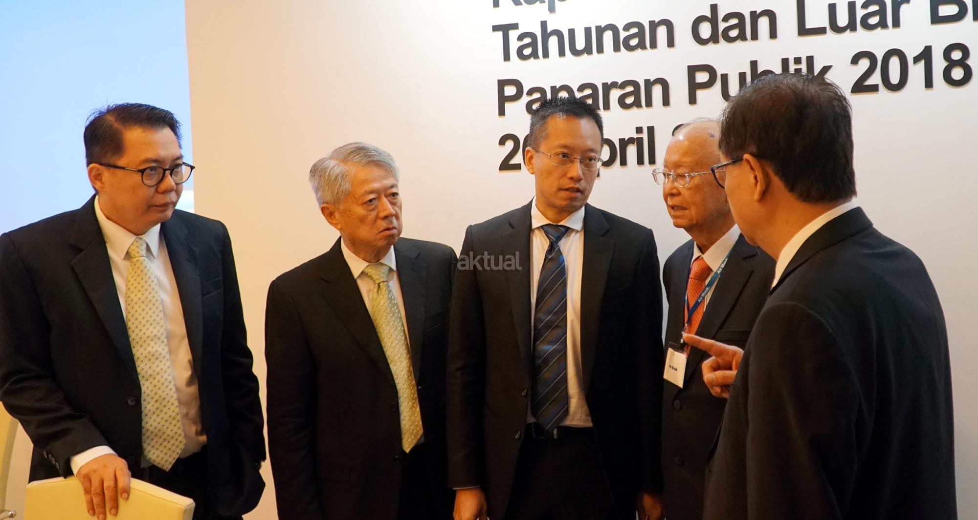 Dari kiri ke kanan, Direktur Pengelolaan Modal dan Investasi Archied Noto Pradono, Wakil Presiden Direktur dan COO Suhendro Prabowo, Presdir dan CEO Hendro S Gondokusumo, Komisaris Utama Cosmas Batubara, Direktur Eksekutif Utama Gondokusumo, Wakil Presdir dan COO Sinarto Darmawan berbincang saat Rapat Umum Pemegang Saham (RUPS) Tahunan di Jakarta, Jumat (20/4). PT Intiland Development Tbk (DILD) ingin fokus melakukan ekspansi bisnis pada tahun ini, dengan berencana meluncurkan dua proyek baru dan merilis pengembangan baru di proyek eksisting. Oleh karena itu, perseroan memutuskan tidak akan membagikan dividen dari hasil laba tahun buku 2017. AKTUAL/Eko S Hilman