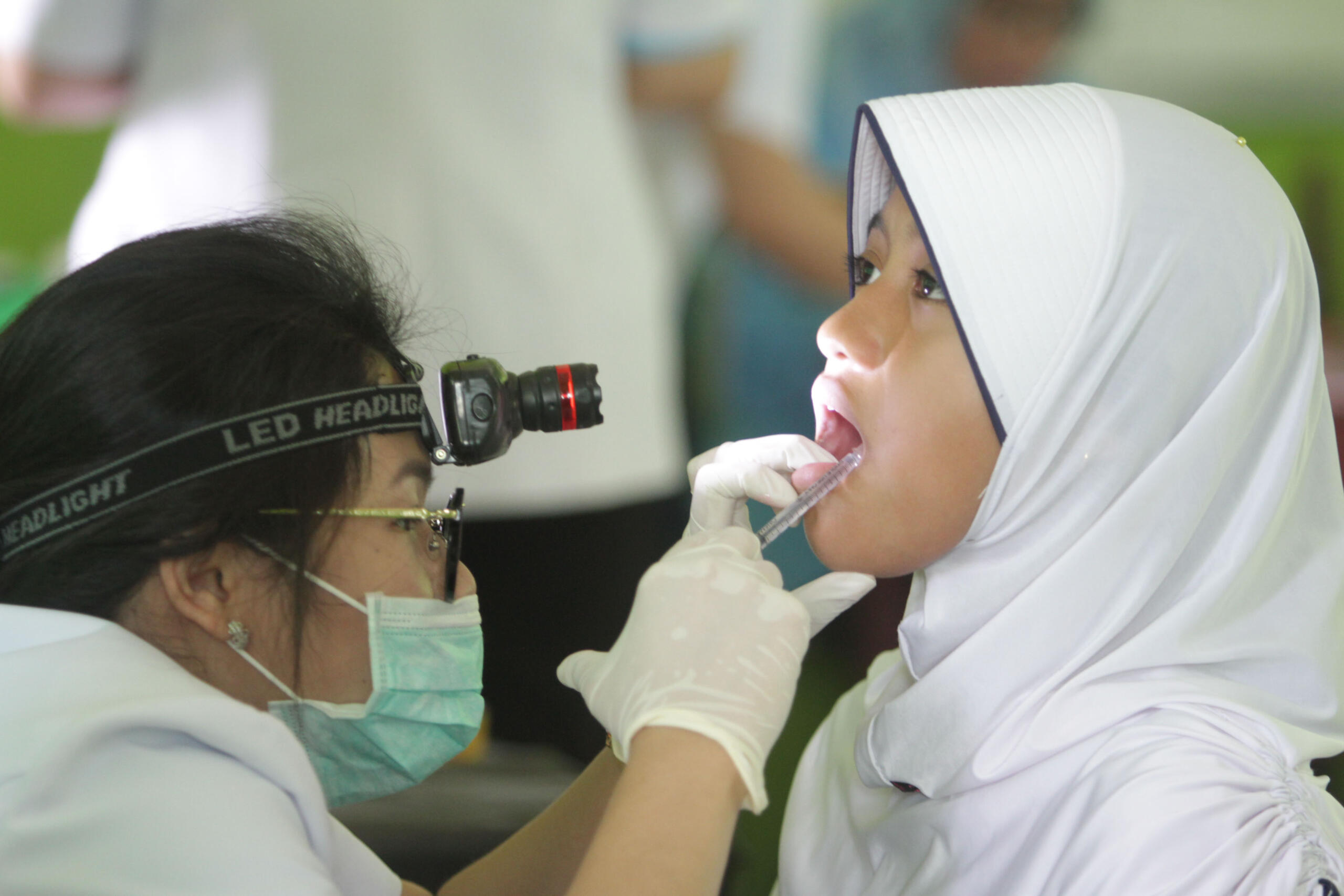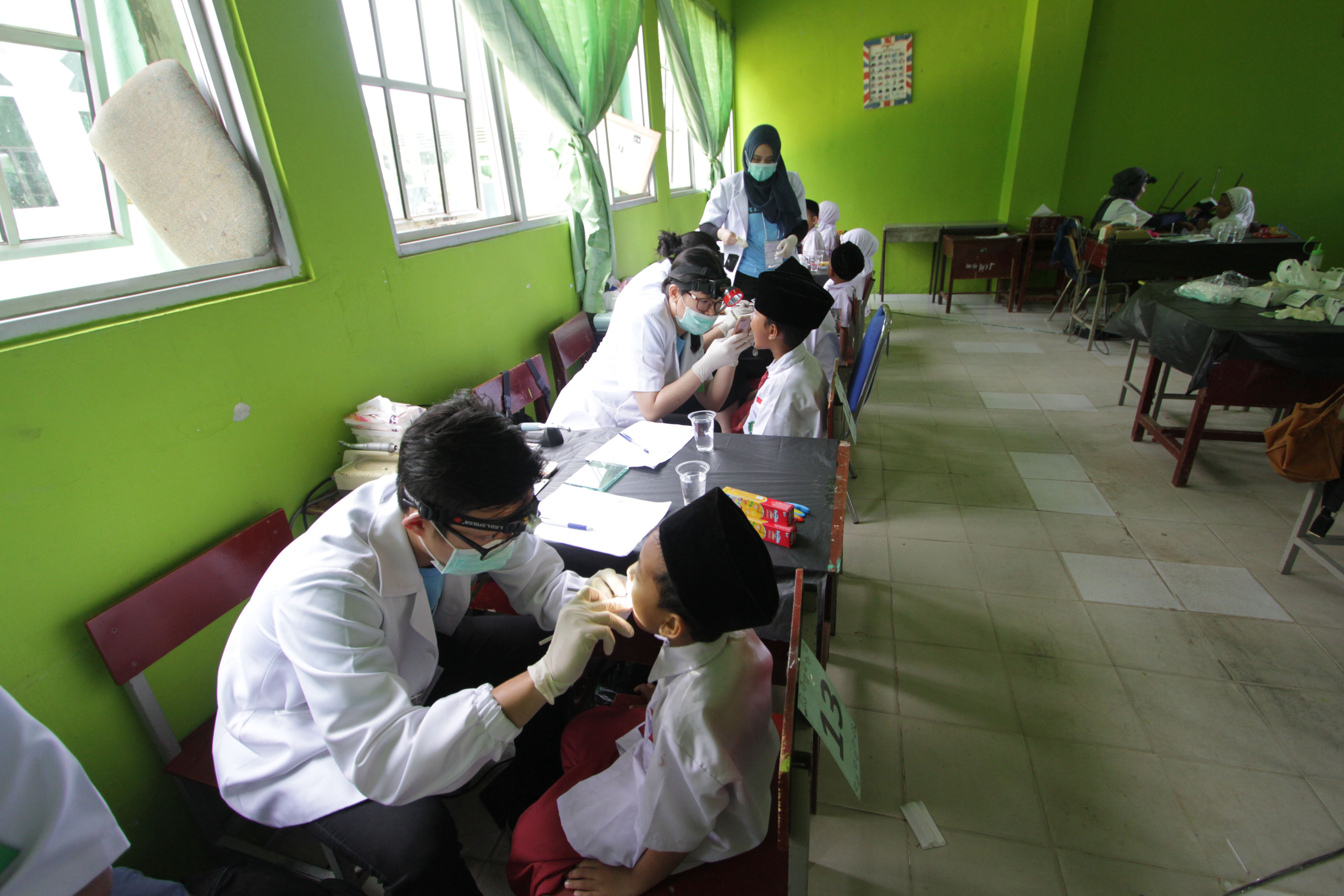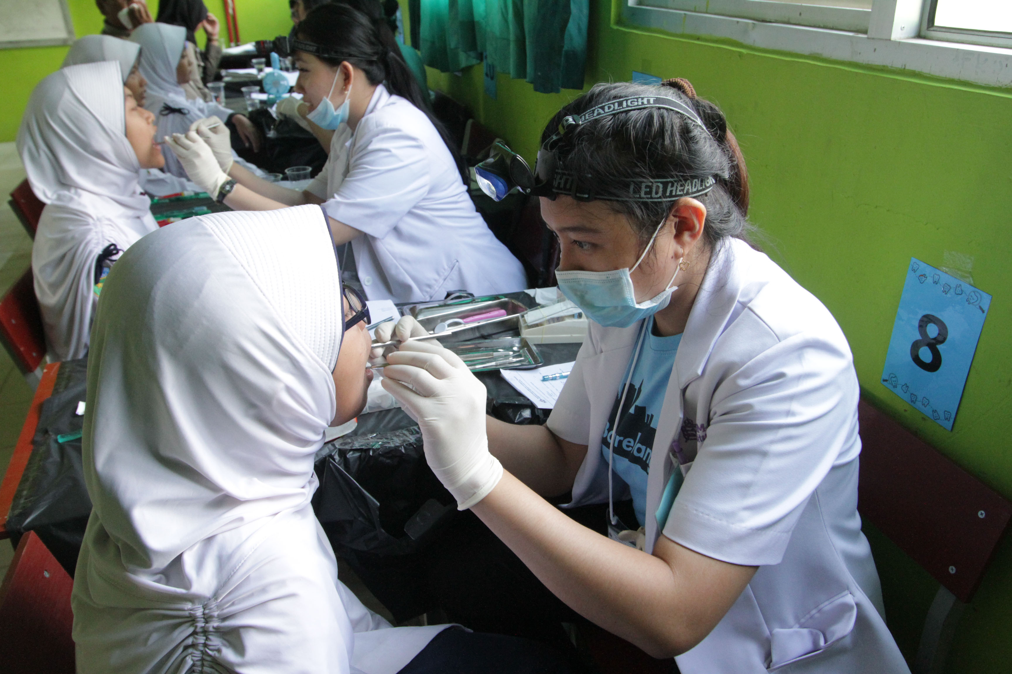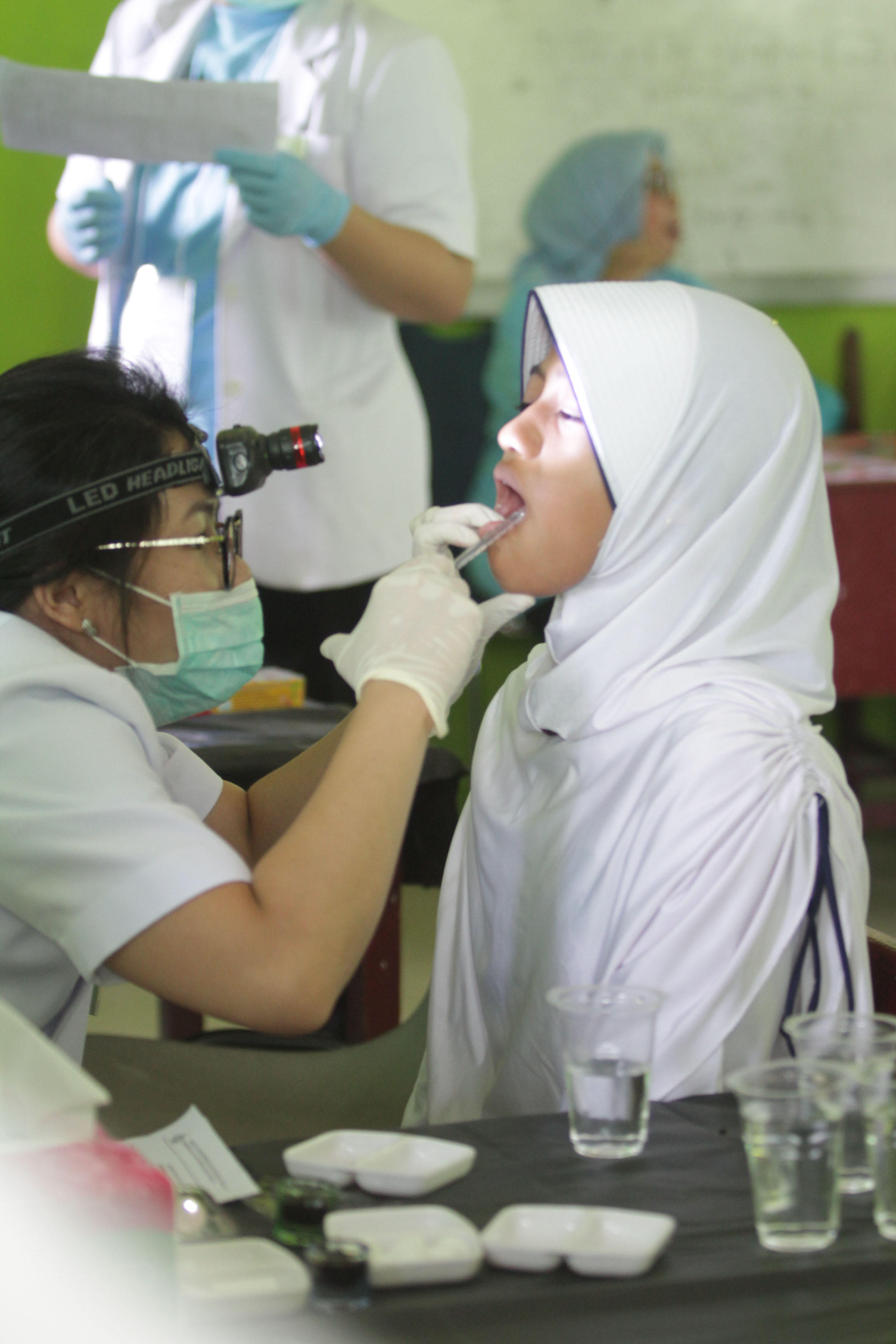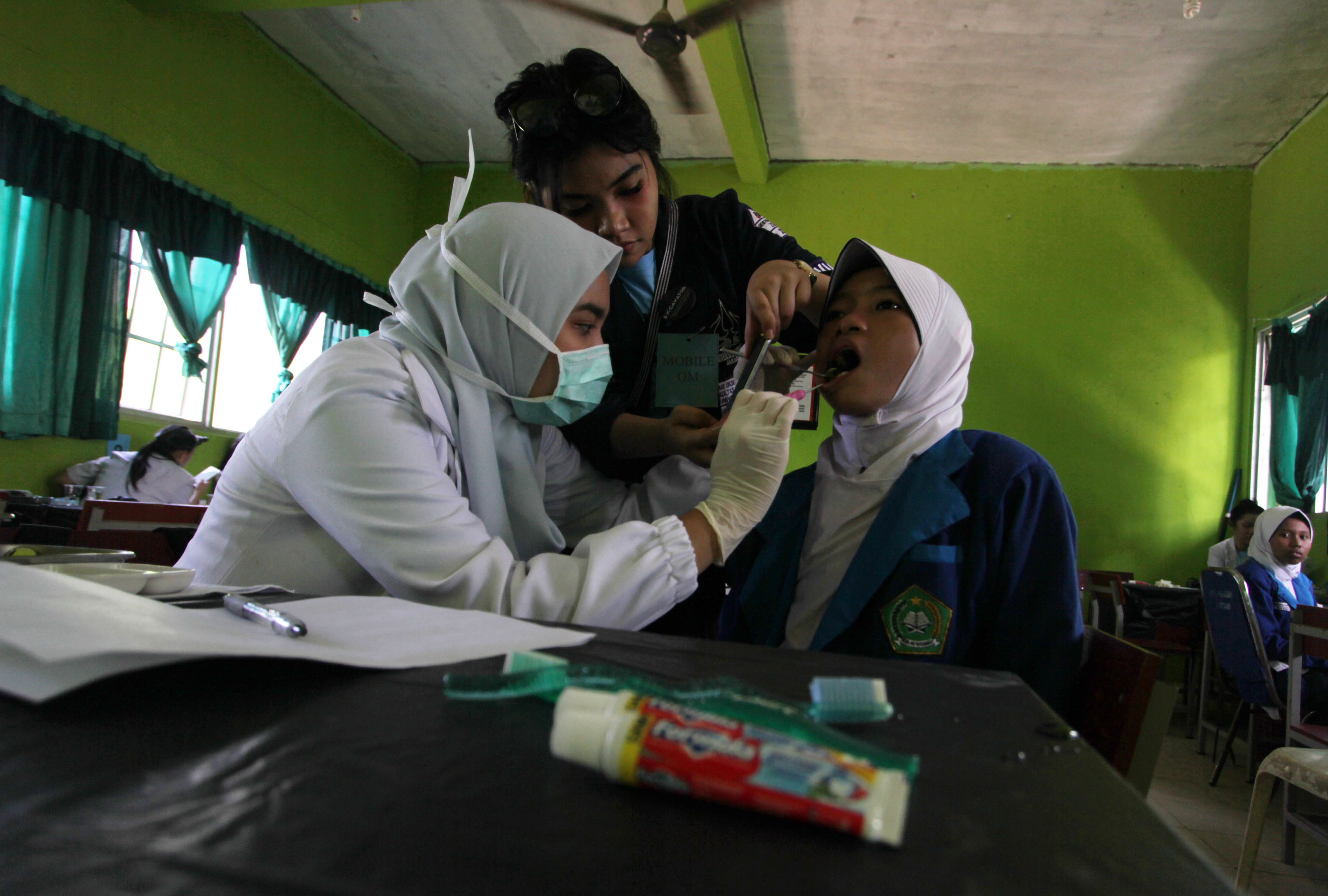 Siswa tengah diperiksa gigi dalam rangkaian kegiatan Formula Untuk Indonesia di Mts Negeri 1, Batam, Kepri, Selasa (7/8). Formula Untuk Indonesia menggelar kegiatan pemeriksaan dan pengobatan gigi gratis bagi siswa sekolah dan masyarakat di Batam bersama FKG Trisakti dalam rangka memperingati HUT OT ke 70Sebanyak 3.5000 warga ikut daftar dalam kegiatan tersebut. AKTUAL/HO