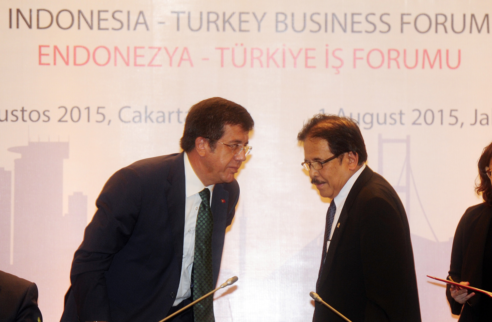 Menko Perekonomian Sofyan Djalil (kanan) berbincang dengan Menko Perekonomian Turki Nihat Zeybekci (kiri) pada pertemuan Forum Bisnis Indonesia-Turki di Jakarta, Sabtu (1/8). Forum bisnis Indonesia-Turki yang dihadiri pengusaha kedua negara itu membahas tentang perdagangan, investasi dan teknologi antara keduabelah pihak. ANTARA FOTO/Wahyu Putro A/pd/15