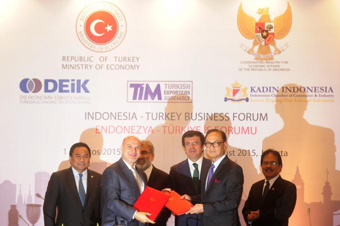 Ketua Kadin Indonesia Suryo Bambang Sulisto (kedua kanan) bertukar naskah kerjasama dengan Ketua Kadin Turki Omer Cihad Vardan (kedua kiri) disaksikan Menko Perekonomian Sofyan Djalil (kanan), Mendag Rachmad Gobel (kiri), Menko Perekonomian Turki Nihat Zeybekci (ketiga kanan) dan Menteri Energi Turki Taner Yildiz disela pertemuan Forum Bisnis Indonesia-Turki di Jakarta, Sabtu (1/8). Forum bisnis Indonesia-Turki yang dihadiri pengusaha kedua negara itu membahas tentang perdagangan, investasi dan teknologi antara keduabelah pihak. ANTARA FOTO/Wahyu Putro A/15