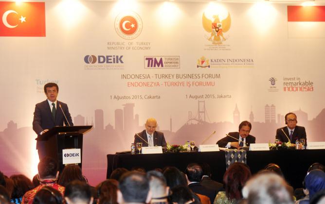Menko Perekonomian Turki Nihat Zeybekci (kiri) menyampaikan paparan disaksikan Menko Perekonomian Sofyan Djalil (kedua kanan), Ketua Kadin Indonesia Suryo Bambang Sulisto (kanan) dan Ketua Kadin Turki Omer Cihad Vardan (kiri) disaksikan Menko Perekonomian Sofyan Djalil (kanan) pada pertemuan Forum Bisnis Indonesia-Turki di Jakarta, Sabtu (1/8). Forum bisnis Indonesia-Turki yang dihadiri pengusaha kedua negara itu membahas tentang perdagangan, investasi dan teknologi antara keduabelah pihak. ANTARA FOTO/Wahyu Putro A/pd/15