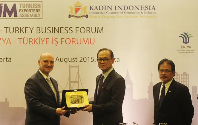 Ketua Kadin Indonesia Suryo Bambang Sulisto (tengah) menerima cinderamata dari Ketua Kadin Turki Omer Cihad Vardan (kiri) disaksikan Menko Perekonomian Sofyan Djalil (kanan) pada pertemuan Forum Bisnis Indonesia-Turki di Jakarta, Sabtu (1/8). Forum bisnis Indonesia-Turki yang dihadiri pengusaha kedua negara itu membahas tentang perdagangan, investasi dan teknologi antara keduabelah pihak. ANTARA FOTO/Wahyu Putro A/pd/15