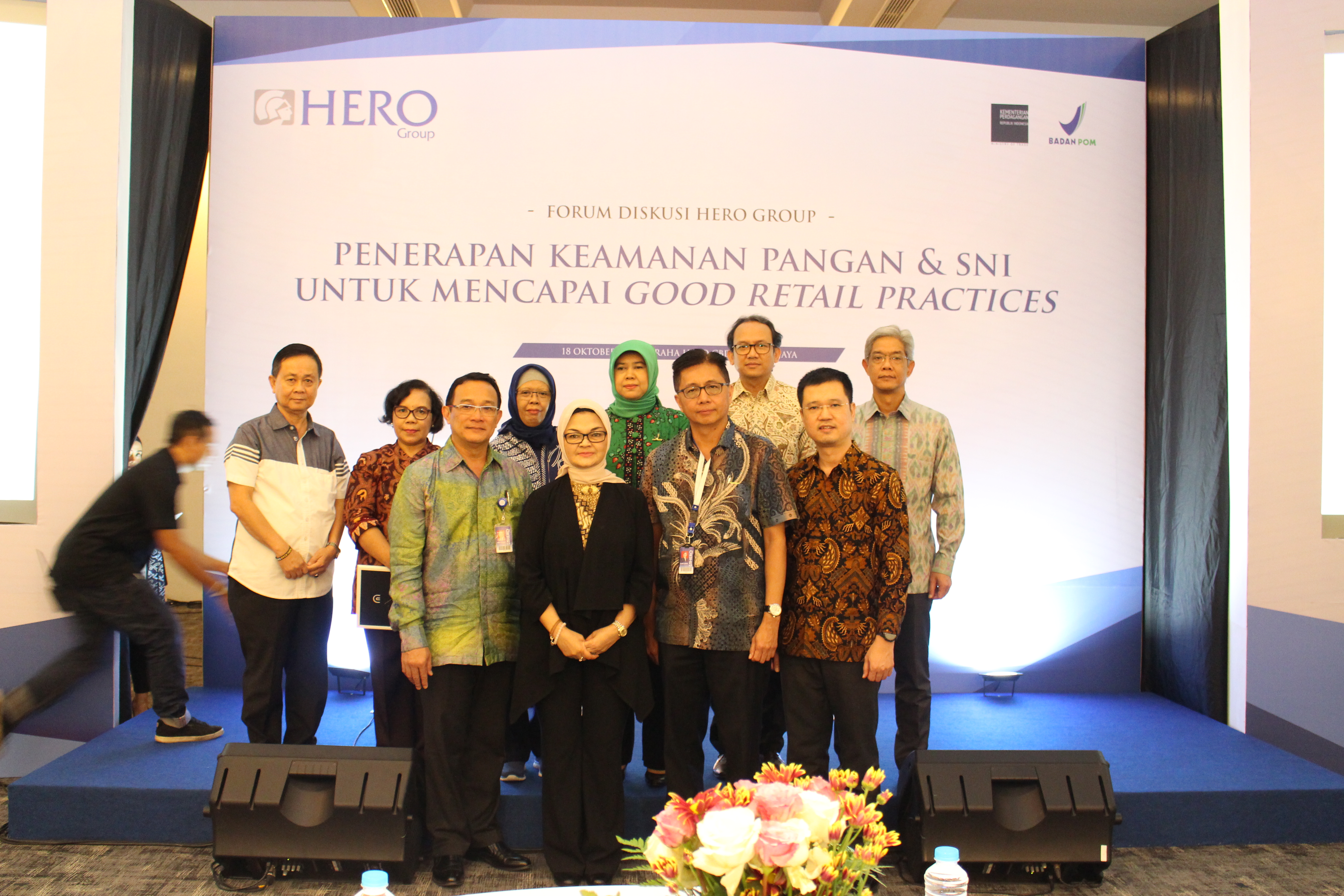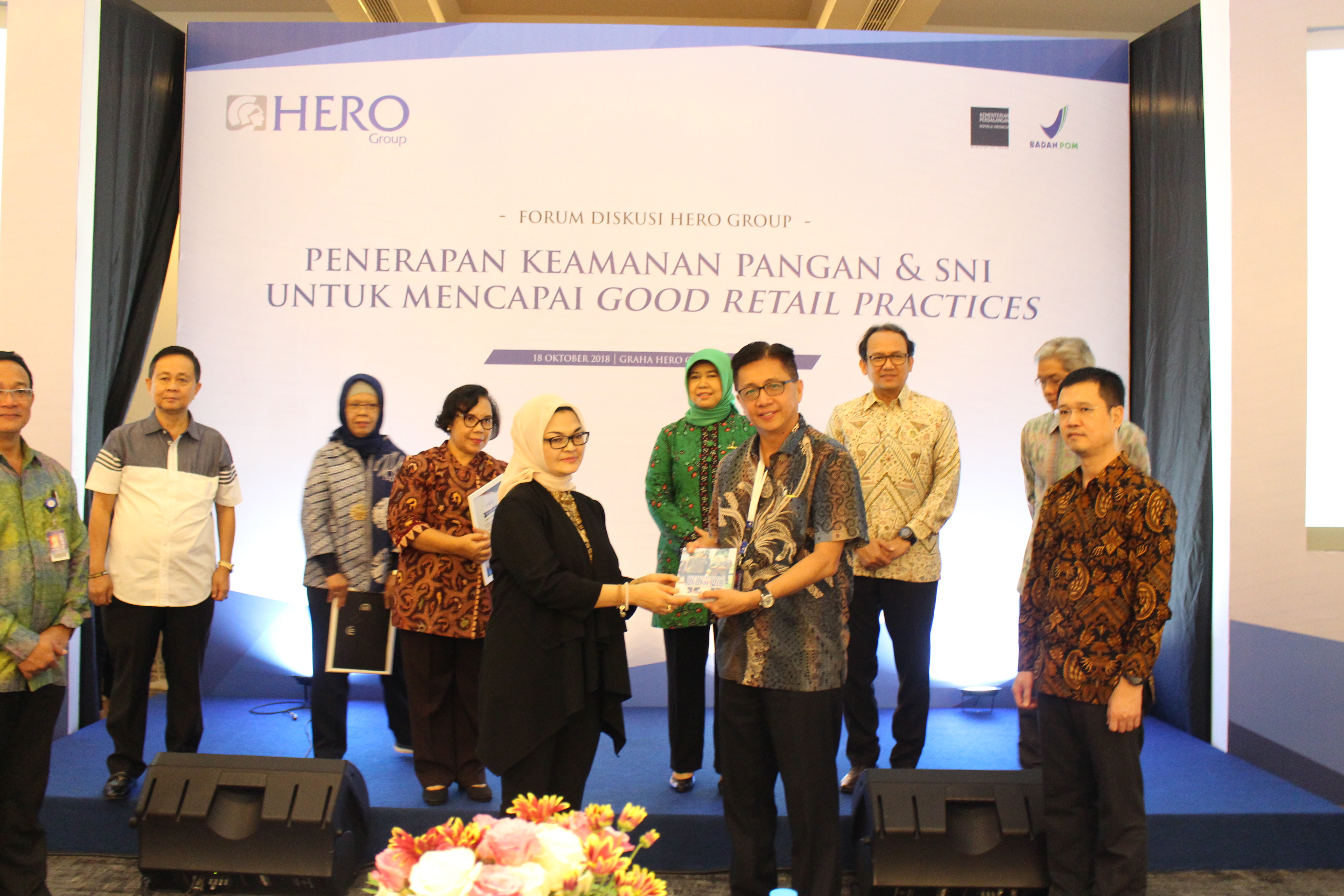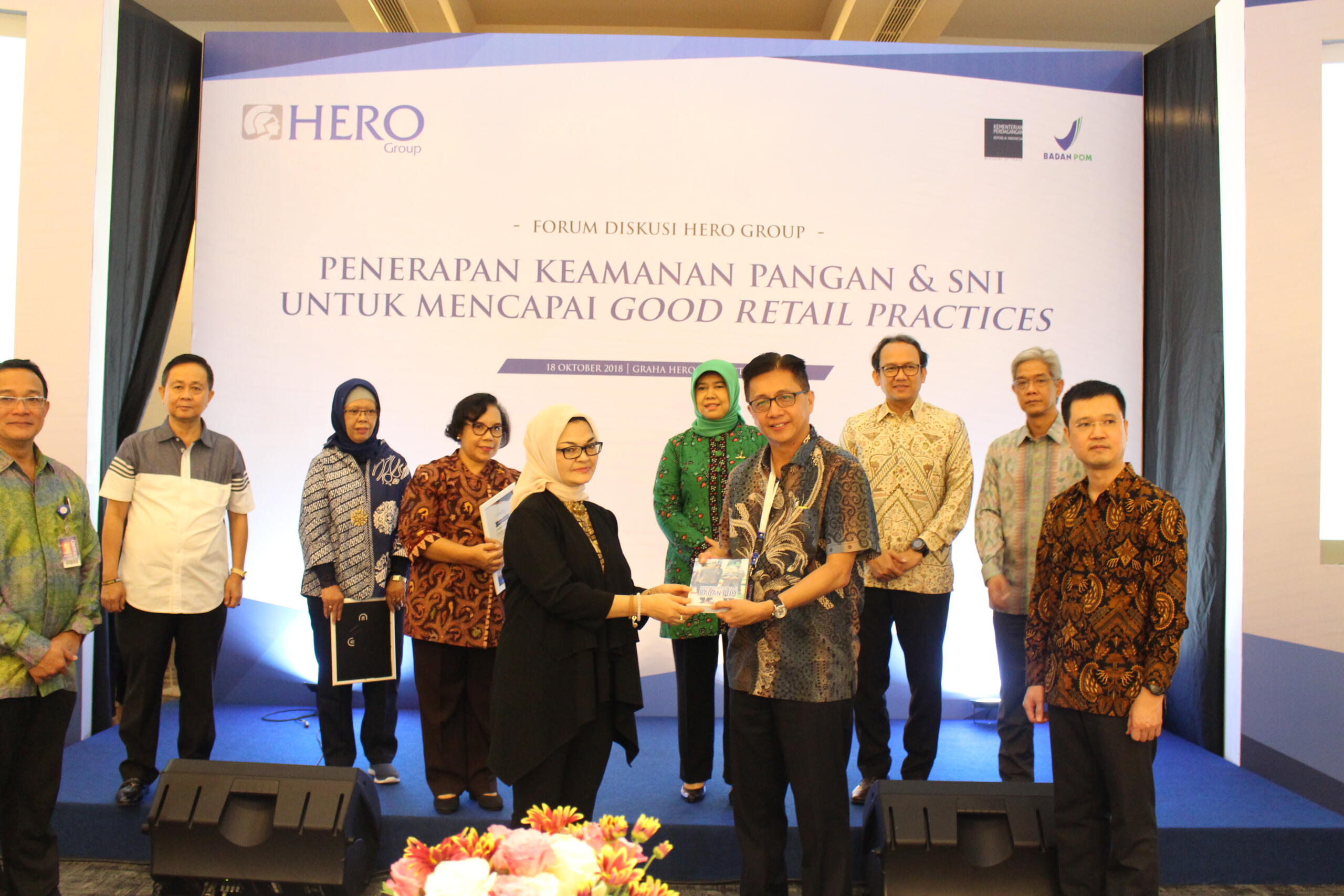 Presiden Komisaris PT Hero Supermarket Tbk (HERO Group) Ipung Kurnia foto bersama Direktur PT Hero Supermarket Tbk Hadrianus Wahyu Trikusumo, GM Corporate Affairs PT Hero Supermarket Tbk Tony Mampuk, Kepala BPOM Penny K. Lukito, Direktur Pengawasan Pangan Risiko Tinggi dan Teknologi Baru BPOM Tetty Helfery Sihombing saat acara Forum Diskusi HERO Group bersama BPOM dan Kementerian Perdagangan, dengan tema: “Penerapan Keamanan Pangan dan SNI untuk Mencapai Good Retail Practices” di Graha Hero CBD Bintaro Jaya, Tangerang Selatan, Kamis (18/10/2018). Diskusi ini dilakukan sebagai salah satu upaya Hero Group untuk menjaga keamanan produk dan patuh terhadap regulasi pemerintah yang berlaku sehingga kualitas dan keamanan produk di toko-toko Hero Group tetap terjaga dan selalu dipercaya pelanggan. Kegiatan ini selanjutnya akan dilaksanakan di 6 kota lain, yakni Jakarta, Lampung, Surabaya, Semarang, Makassar, dan Banjarmasin. Dimana pada kegiatan tersebut akan melibatkan Store Manager Giant dan Hero Supermarket dari berbagai wilayah di Indonesia. AKTUAL/Eko S Hilman