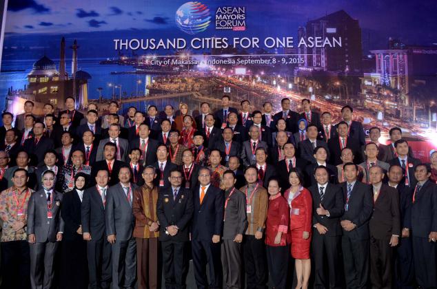 Sejumlah walikota berfoto bersama saat ASEAN Mayors Forum (AMF) 2015 di Four Points Convention Sheraton Hotel, Makassar, Sulawesi Selatan, Selasa (8/9). Pertemuan AMF 2015 membahas investasi dan membangun sumber daya manusia untuk persiapan Masyarakat Ekonomi ASEAN 2015. ANTARA FOTO/Sahrul Manda Tikupadang/aww/15.