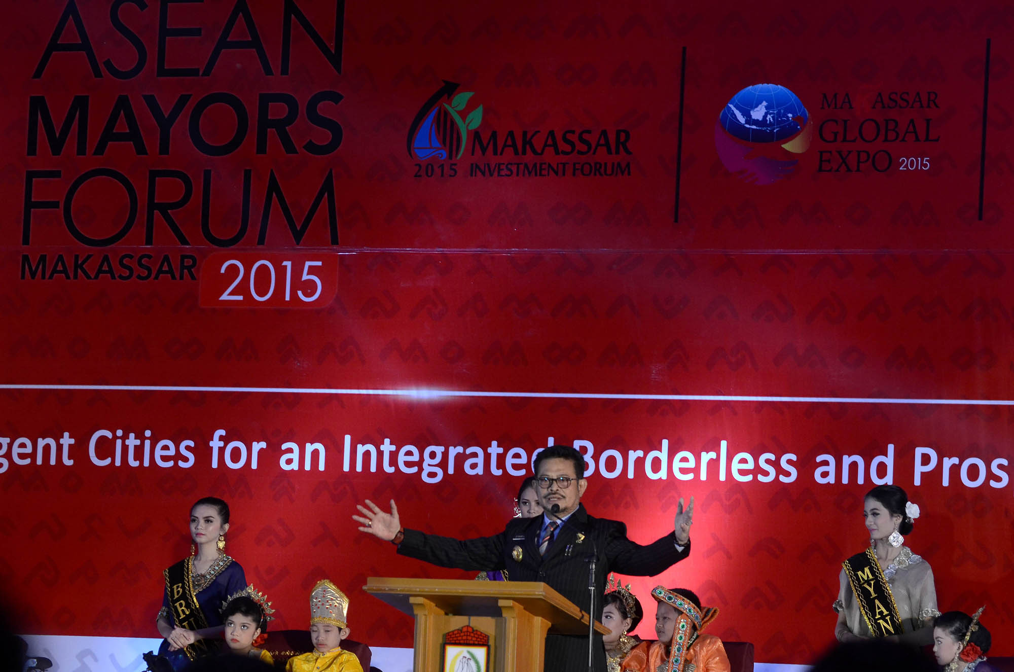 Gubernur Sulawesi Selatan Syahrul Yasin Limpo menyampaikan pidato sekaligus membuka ASEAN Mayors Forum (AMF) 2015 di Four Points Convention Sheraton Hotel, Makassar, Sulawesi Selatan, Selasa (8/9). Pertemuan AMF 2015 tersebut membahas investasi dan membangun sumber daya manusia untuk persiapan Masyarakat Ekonomi ASEAN 2015. ANTARA FOTO/Sahrul Manda Tikupadang/aww/15.