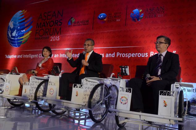 Walikota Makassar Moh Ramdhan Pomanto (tengah), Sekretaris Umum United Cities and Local Government Asia-Pacific (UCLG ASPAC) Bernadia Irawati Tjandradewi (kiri), dan Ketua Makassar Investment Forum, Brnardus Djonoputro (kanan) memberikan keterangan pers di Four Points Convention Sheraton Hotel, Makassar, Sulawesi Selatan, Selasa (8/9). Pertemuan ASEAN Mayor Forum 2015 tersebut membahas investasi dan membangun sumber daya manusia untuk persiapan Masyarakat Ekonomi ASEAN 2015. ANTARA FOTO/Sahrul Manda Tikupadang/aww/15.