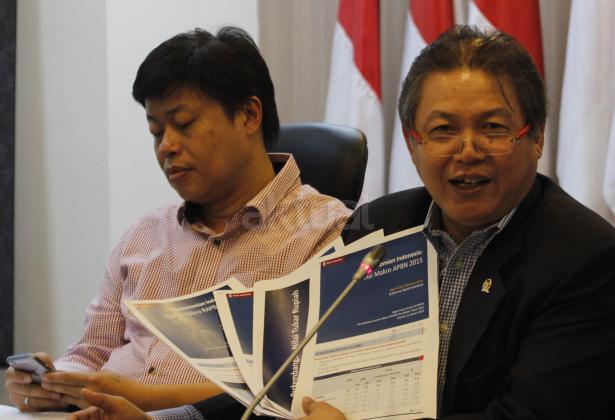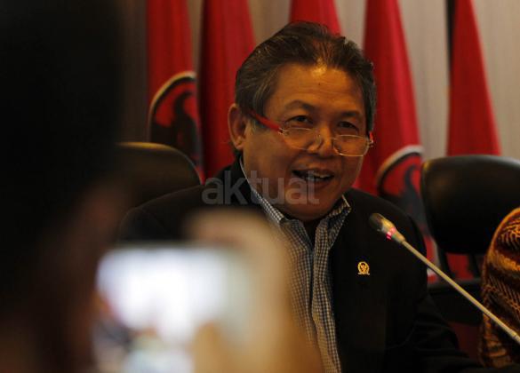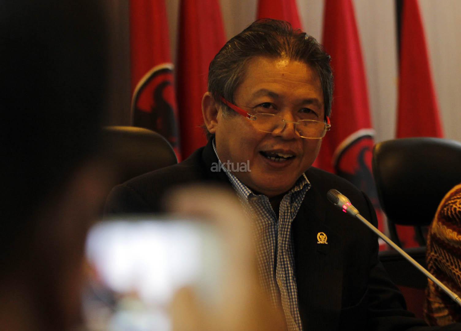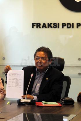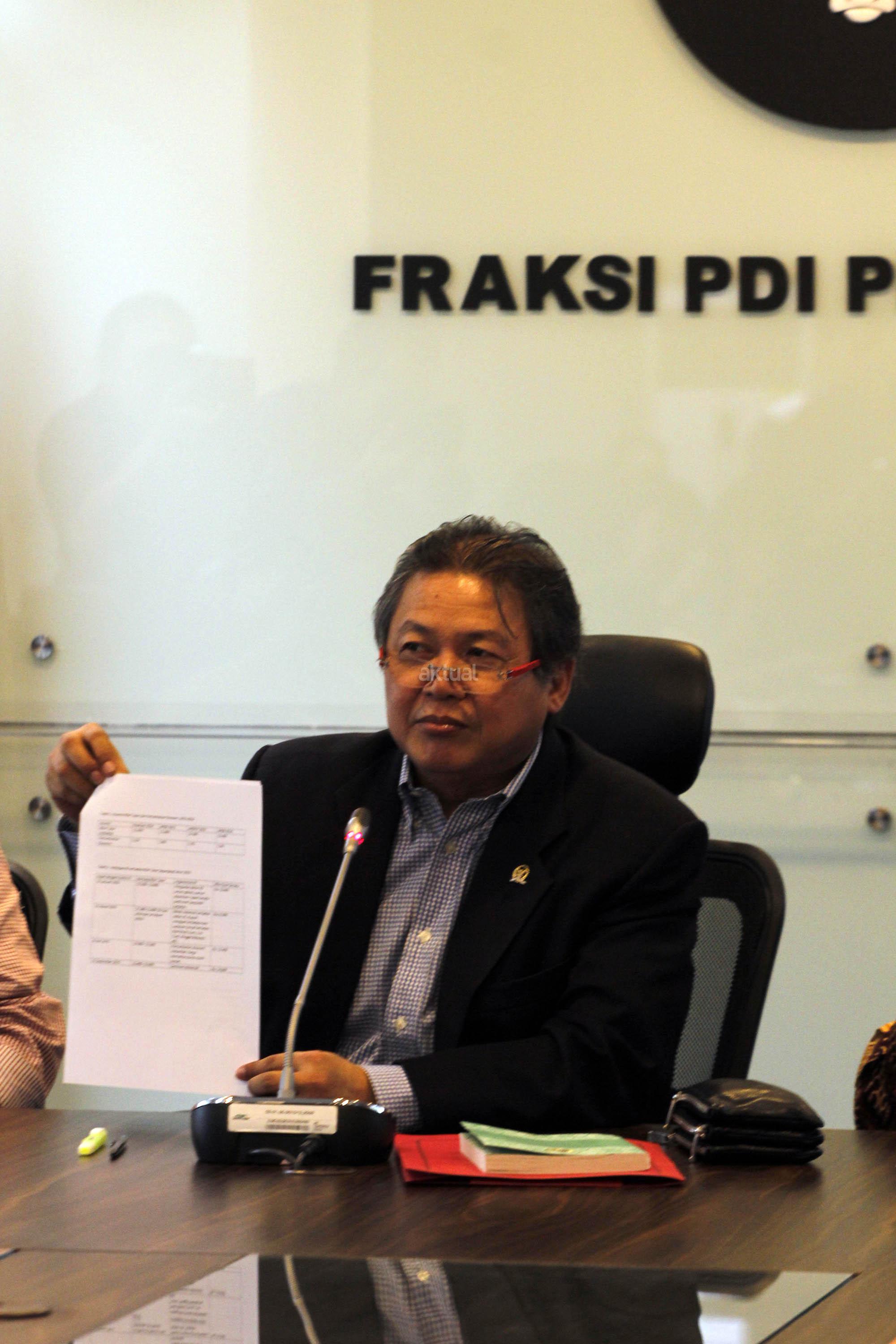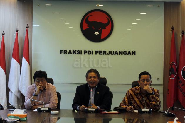 Anggota Komisi XI DPR Fraksi PDIP Hendrawan Supratikno (tengah), Bendahara Fraksi PDIP DPR Alex Lukman (kanan) dan Anggota Komisi VI DPR Fraksi PDIP Juliari Batubara memberikan keterangan pers terkait pelemahan rupiah di ruang Fraksi PDIP, Gedung Parlemen, Senayan, Jakarta, Selasa (29/9/2015). Fraksi PDIP menilai berkali-kali antisipasi Bank Indonesia (BI) untuk mengatasi pelemahan rupiah meleset. Oleh karena itu, Fraksi PDIP mendesak pimpinan DPR untuk segera mengadakan pertemuan konsultasi dengan pimpinan BPK dan meminta BPK melakukan pemeriksaan kinerja dan pemeriksaan dengan tujuan tertentu terhadap BI.