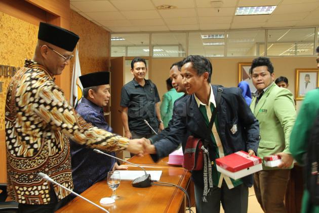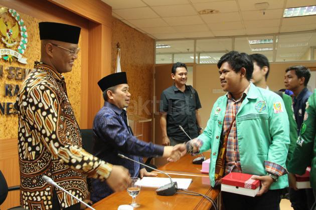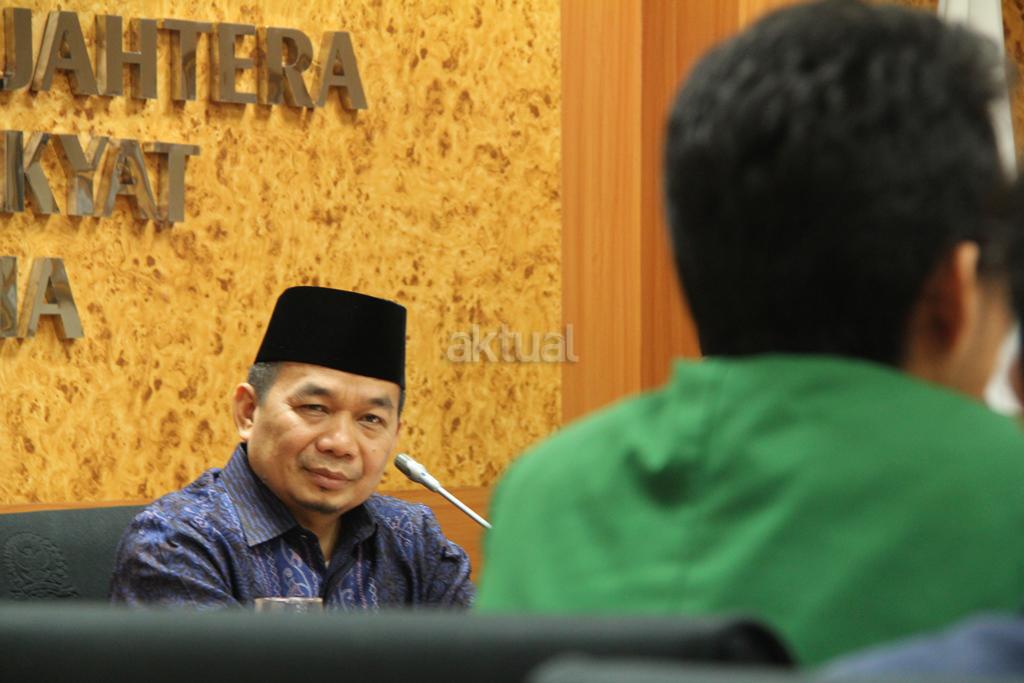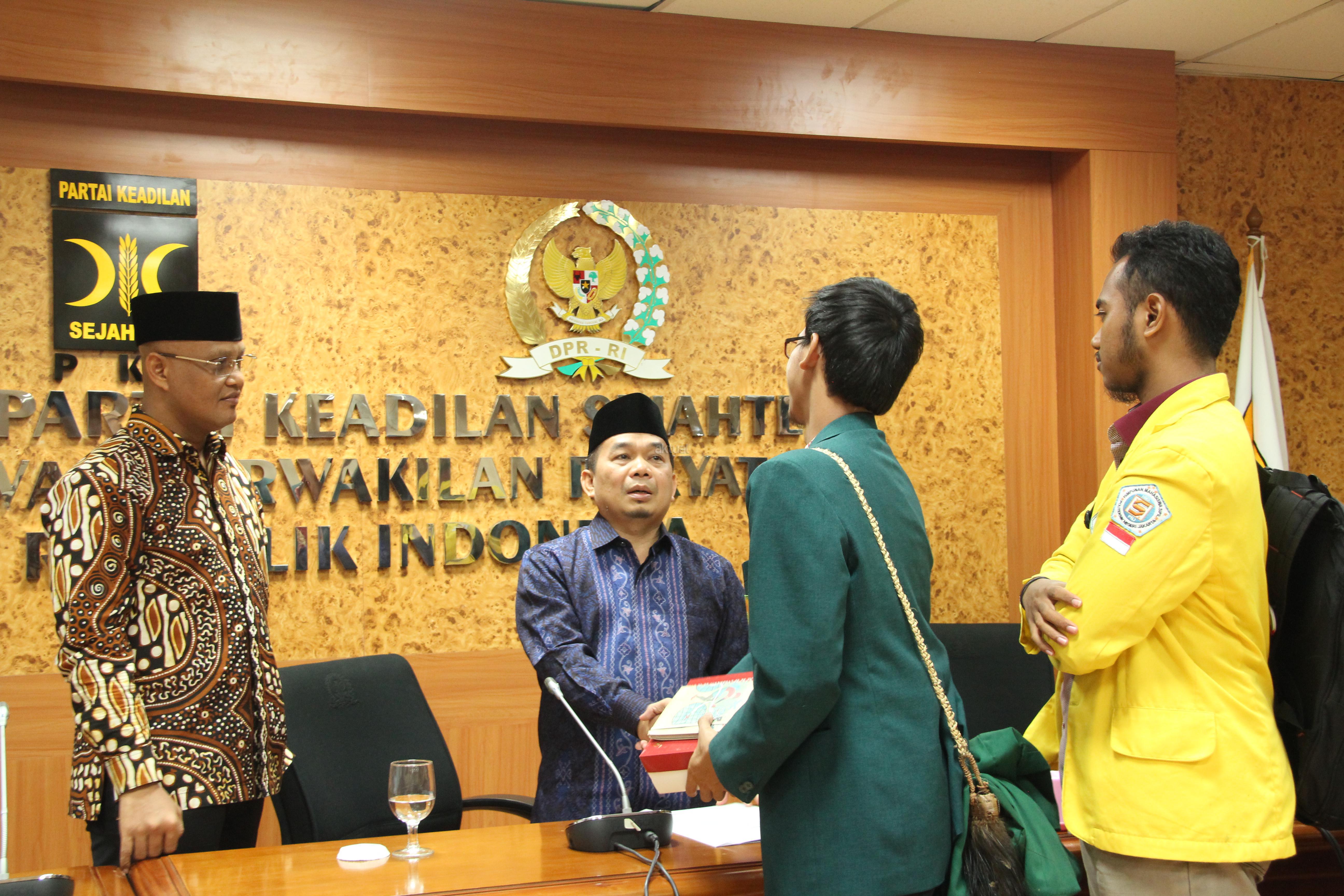 Ketua Fraksi PKS DPR RI Jazuli Juwaini (kedua kiri) didampingi Sekretaris Fraksi Sukamta dan Koordinator Tenaga Ahli Fraksi Ahmad Rukyat (kiri) menerima pengurus BEM Seluruh Indonesia (BEM SI) di kantor Fraksi PKS, Gedung DPR, Komplek Senayan, Jakarta, Selasa (23/2). Dalam pertemuan tersebut BEM SI dan Fraksi PKS menolak Revisi UU KPK Nomor 30 tahun 2002. Fraksi PKS tidak hanya menolak, bahkan setelah rapat konsultasi antara Pimpinan DPR dan Presiden yang memutuskan menunda Revisi UU KPK, PKS meminta mencabut saja itu RUU di Baleg. Sekarang presiden minta tunda pembahasannya. Daripada DPR jadi permainan publik, mending cabut saja dari prolegnas. Selesai masalahnya. AKTUA/HO