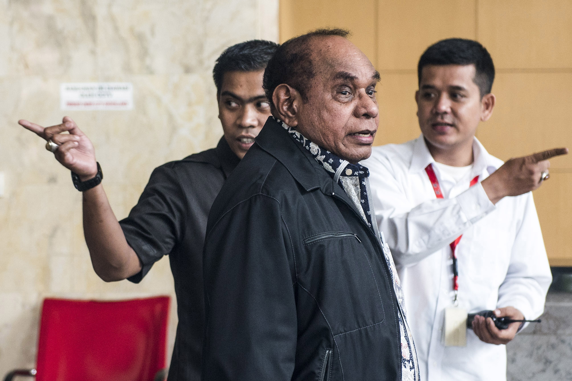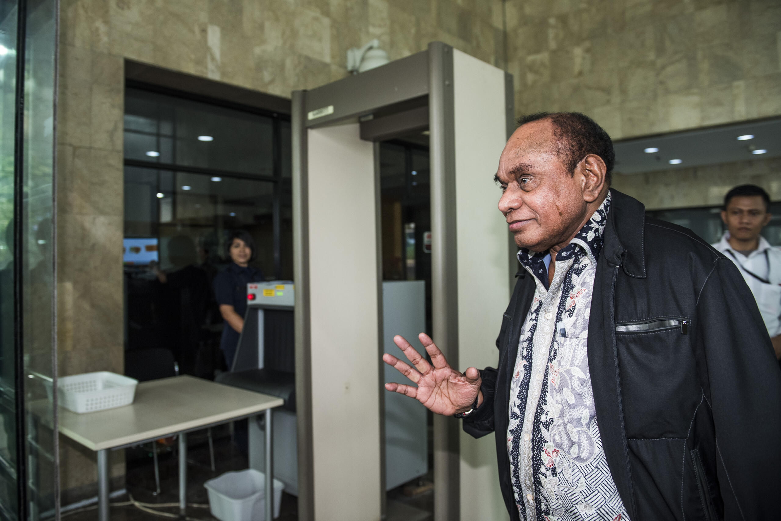 Mantan Menteri Perhubungan Freddy Numberi berjalan keluar seusai menjalani pemeriksaan di gedung KPK, Jakarta, Selasa (15/3). Freddy Numberi diperiksa KPK sebagai saksi terkait kasus Tindak Pidana Korupsi pembangunan balai pendidikan dan pelatihan ilmu pelayaran Sorong tahap III pada Pusat Pengembangan SDM Perhubungan Laut (PPSDML) Badan Pengembangan SDM di Kementerian Perhubungan TA 2011. ANTARA FOTO/M Agung Rajasa/aww/16.