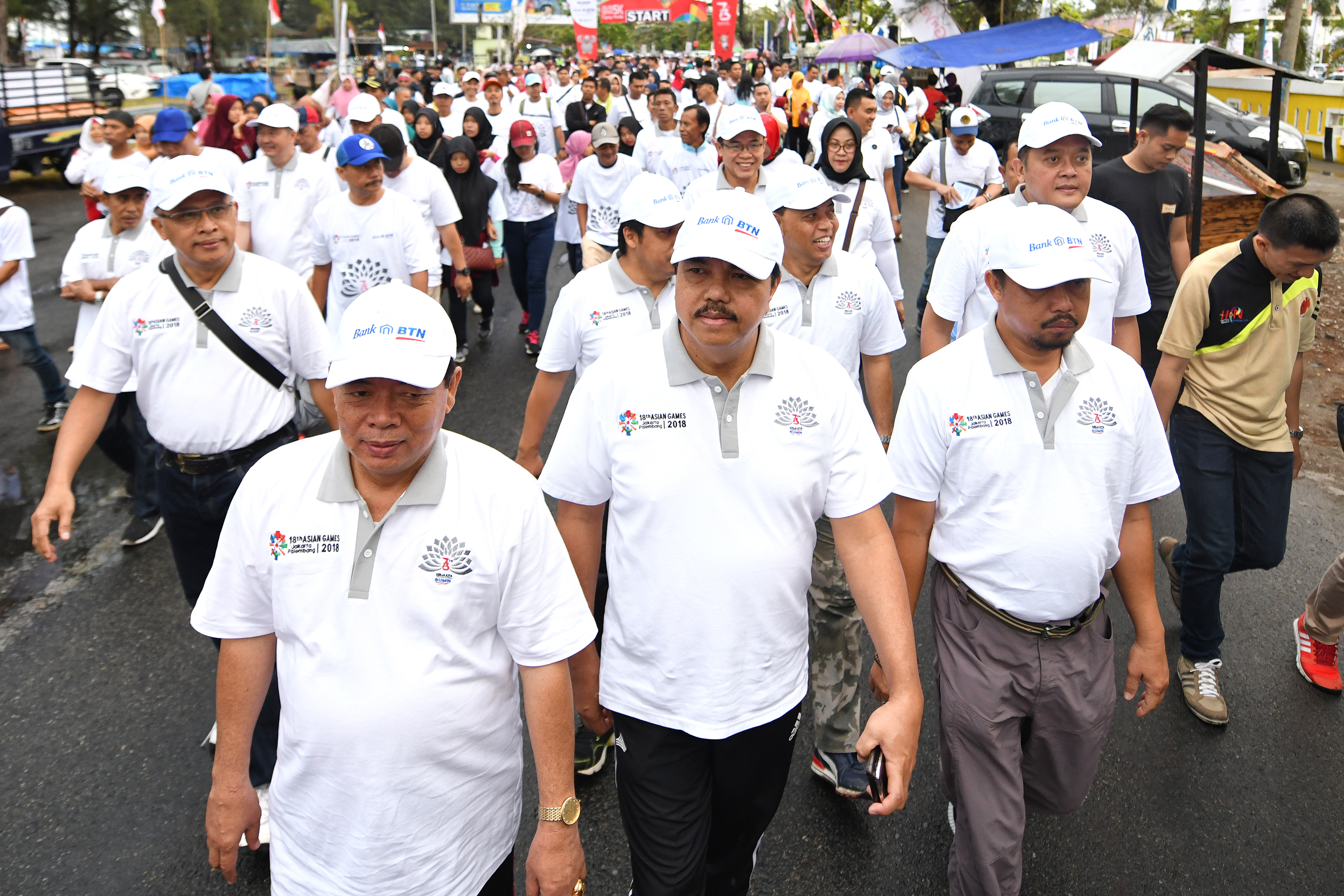 Direktur Konsumer Banking BTN Budi Satria bersama Plt Walikota Bengkulu, Budiman Ismaun membuka start jalan santai (fun walk) di Pantai Panjang Bengkulu, Sabtu (18/8). Kegiatan Fun Walk ini merupakan acara puncak program BUMN Hadir Untuk Negeri di bengkulu yang dikoordinir oleh bank BTN diikuti lebih dari 5.000 peserta dari masyarakat setempat. Pada acara ini BTN juga menyiapkan pasar murah menjual 500 paket sembako untuk masyarakat kurang mampu dengan harga per paket Rp.25.000 atau lebih murah dibanding harga pasar Rp.100.000 berisi beras, minyak goreng dan gula pasir. Hasil penjualan paket sembako dikembalikan BTN ke masyarakat untuk disumbangkan ke rumah-rumah ibadah yang ada di Bengkulu. AKTUAL/Pool