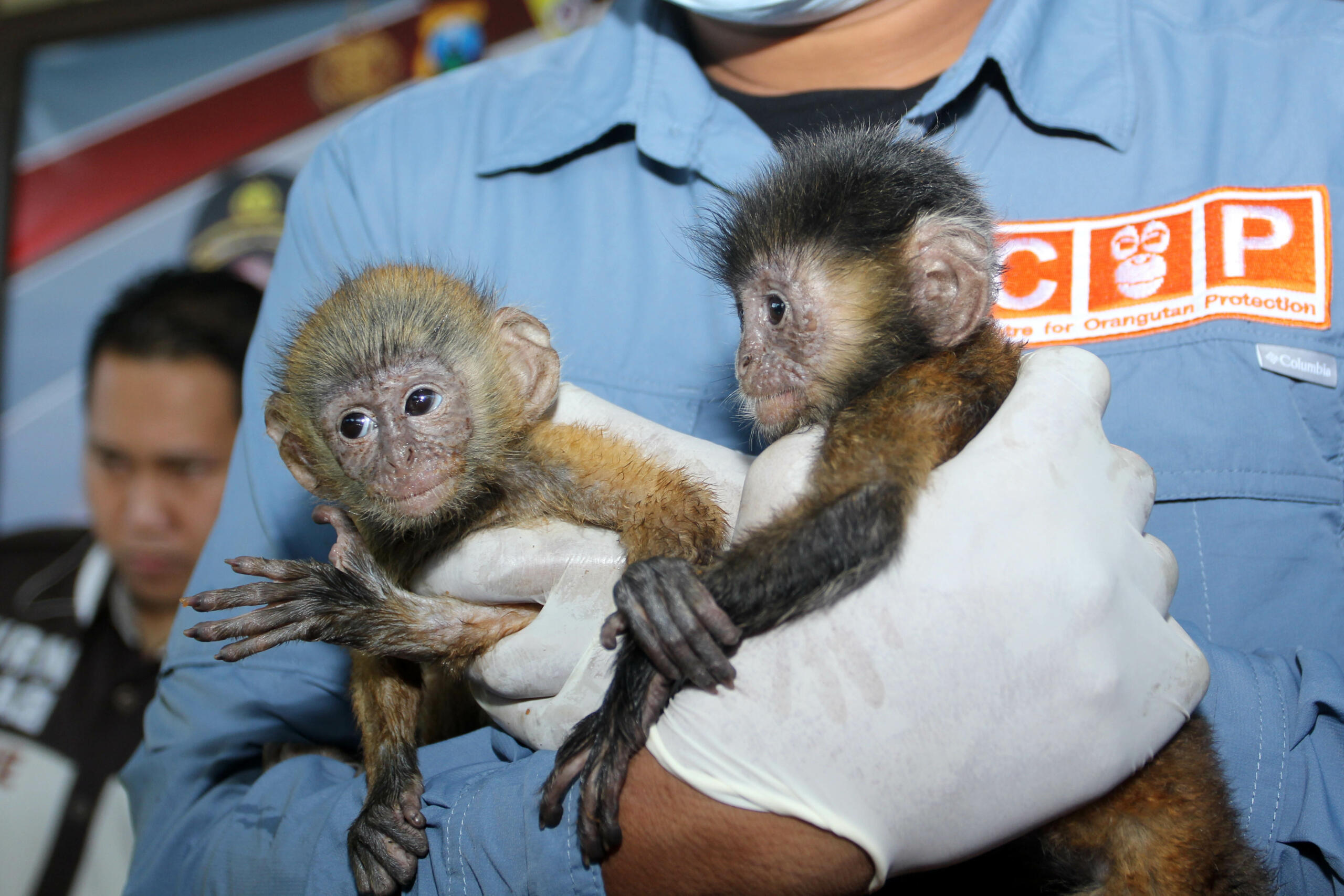 Petugas menunjukkan dua ekor Lutung Jawa (Trachypithecus auratus) saat rilis tangkapan penjualan satwa dilindungi di Mapolres, Banyuwangi, Jawa Timur, Rabu (25/5). Kepolisian Resort Banyuwangi berhasil gagalkan penjualan empat ekor Lutung Jawa yang merupakan satwa dilindungi, yang selanjutnya bayi lutung tersebut akan dirawat di Pusat Rehabilitasi Lutung Jawa atau Javan Langur Center (JLC) di Batu, Malang sebelum dilepasliarkan. ANTARA FOTO/ Budi Candra Setya/ama/16.
