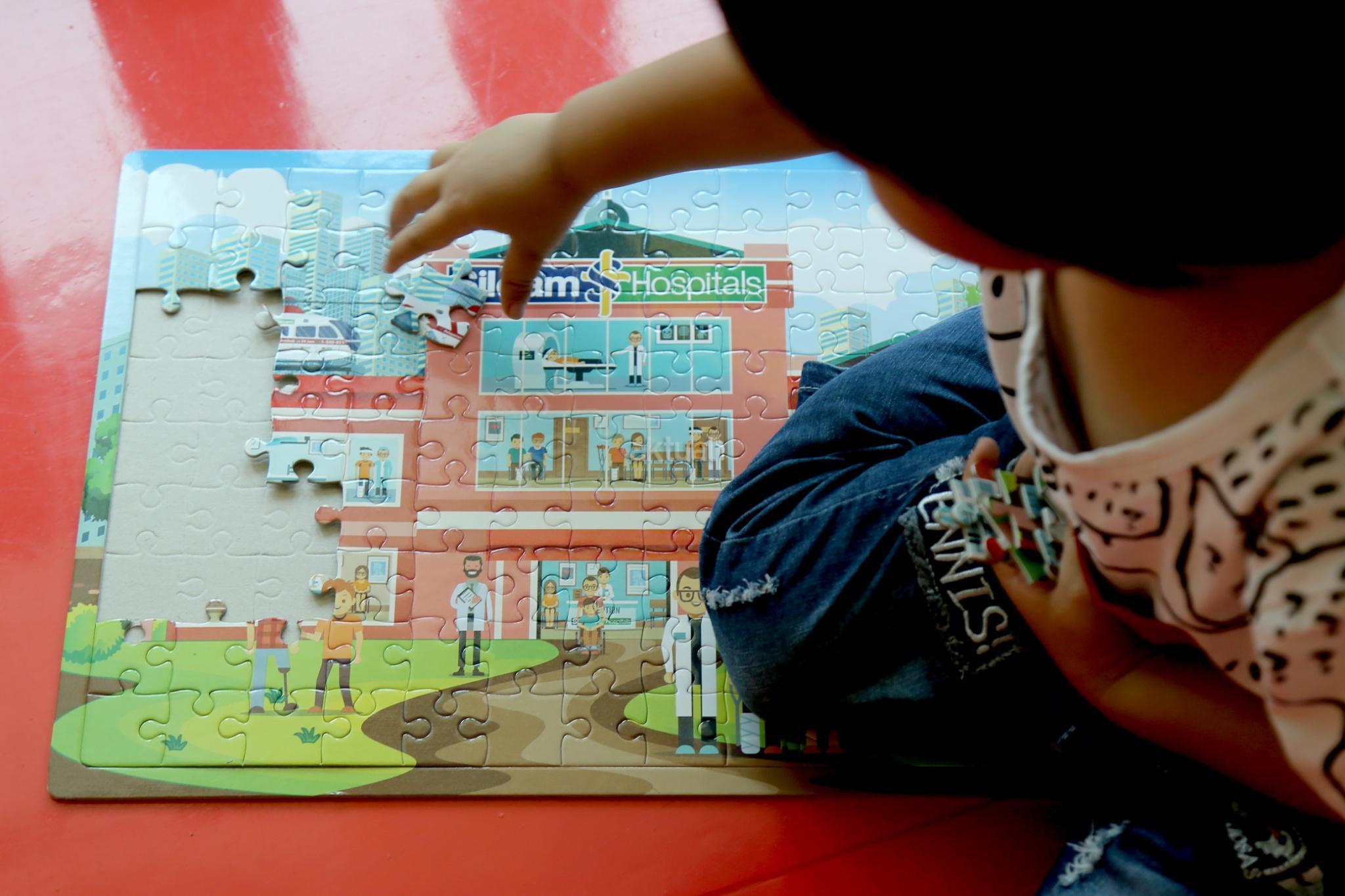 Seorang anak bermain puzzle didampingi orangtuanya di PlayLand Siloam Hospital, Jalan Duren Tiga, Jakarta Selatan, Sabtu (22/7). Dalam memperingati Hari Anak Nasional sebagai salah satu kegiatan yang menarik perhatian untuk pasien anak Siloam membagikan puzzle di tiap-tiap unit rumah sakit Siloam. Permainan sejenis puzzle ini sendiri memiliki dampak yang baik, yaitu merangsang rasa bahagia. Selain itu anak dapat berpikir lebih fokus, membangun keterampilan persepsi visual, serta menjadi lebih perhatian akan detail. Kordinasi mata dan sensor motorikpun bekerja sehingga bisa mengalihkan rasa sakit atau kesadaran akan kondisi tubuh yang belum pulih. AKTUAL/Tino Oktaviano