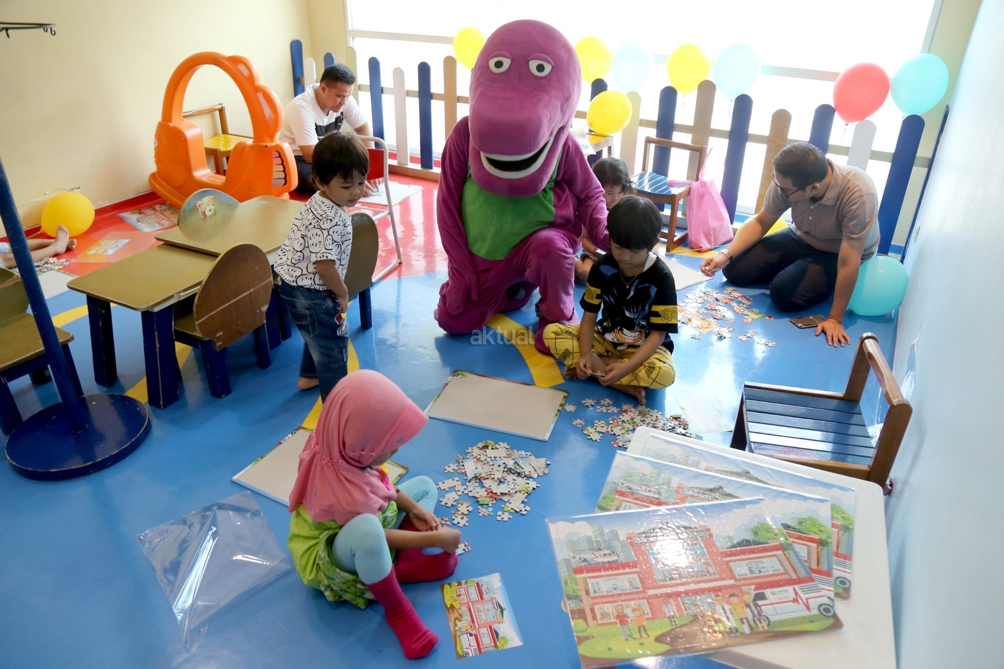 Tokoh kartun Barney memberikan mainan puzzle kepada seorang anak di PlayLand Siloam Hospital, Jalan Duren Tiga, Jakarta Selatan, Sabtu (22/7). Dalam memperingati Hari Anak Nasional sebagai salah satu kegiatan yang menarik perhatian untuk pasien anak Siloam membagikan puzzle di tiap-tiap unit rumah sakit Siloam. Permainan sejenis puzzle ini sendiri memiliki dampak yang baik, yaitu merangsang rasa bahagia. Selain itu anak dapat berpikir lebih fokus, membangun keterampilan persepsi visual, serta menjadi lebih perhatian akan detail. Kordinasi mata dan sensor motorikpun bekerja sehingga bisa mengalihkan rasa sakit atau kesadaran akan kondisi tubuh yang belum pulih. AKTUAL/Tino Oktaviano