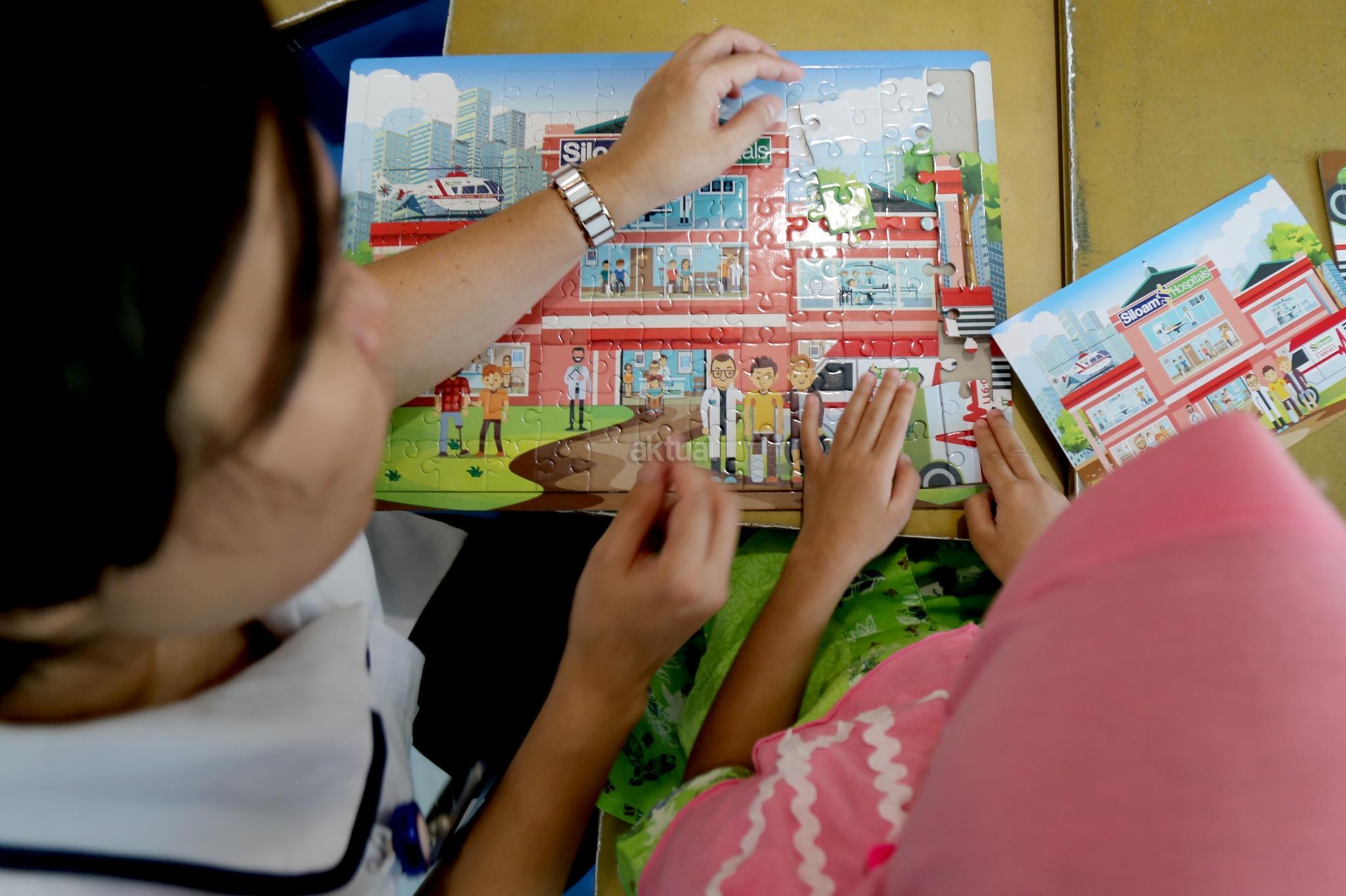 Seorang suster menemani anak bermain puzzle di PlayLand Siloam Hospital, Jalan Duren Tiga, Jakarta Selatan, Sabtu (22/7). Dalam memperingati Hari Anak Nasional sebagai salah satu kegiatan yang menarik perhatian untuk pasien anak Siloam membagikan puzzle di tiap-tiap unit rumah sakit Siloam. Permainan sejenis puzzle ini sendiri memiliki dampak yang baik, yaitu merangsang rasa bahagia. Selain itu anak dapat berpikir lebih fokus, membangun keterampilan persepsi visual, serta menjadi lebih perhatian akan detail. Kordinasi mata dan sensor motorikpun bekerja sehingga bisa mengalihkan rasa sakit atau kesadaran akan kondisi tubuh yang belum pulih. AKTUAL/Tino Oktaviano