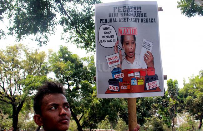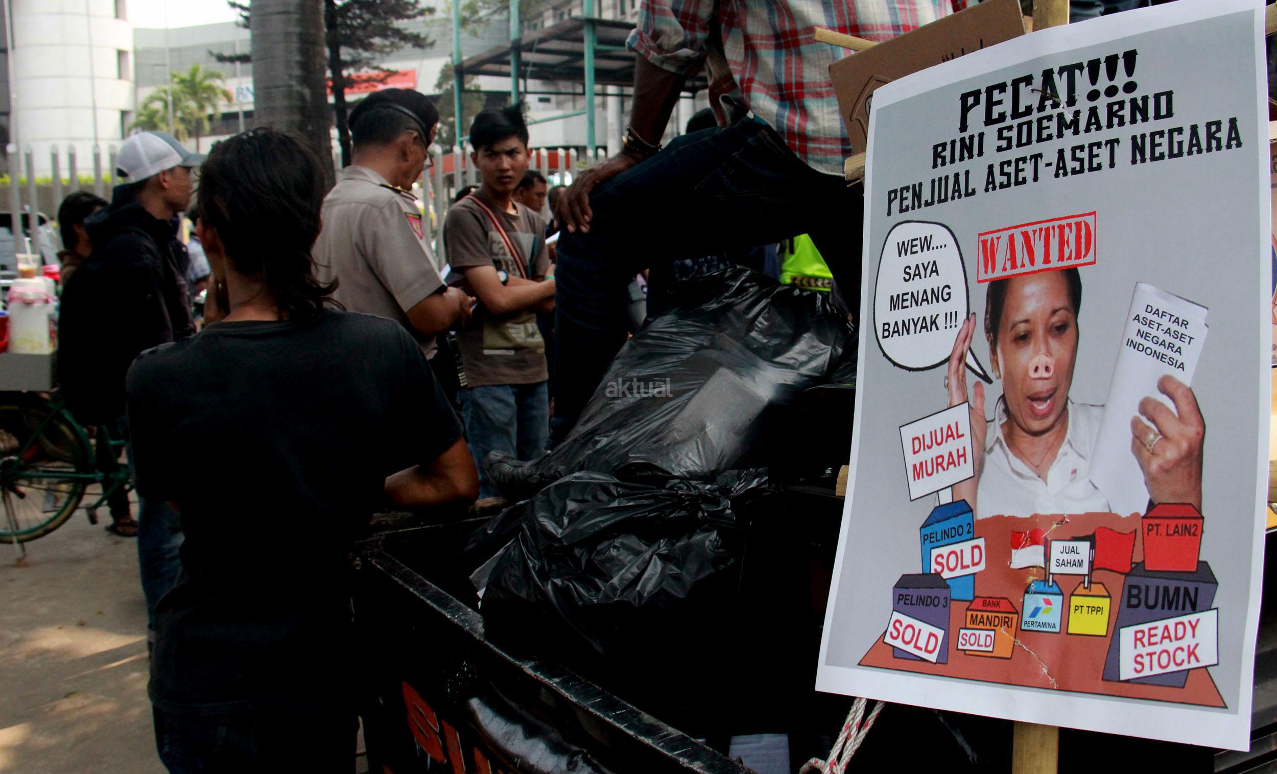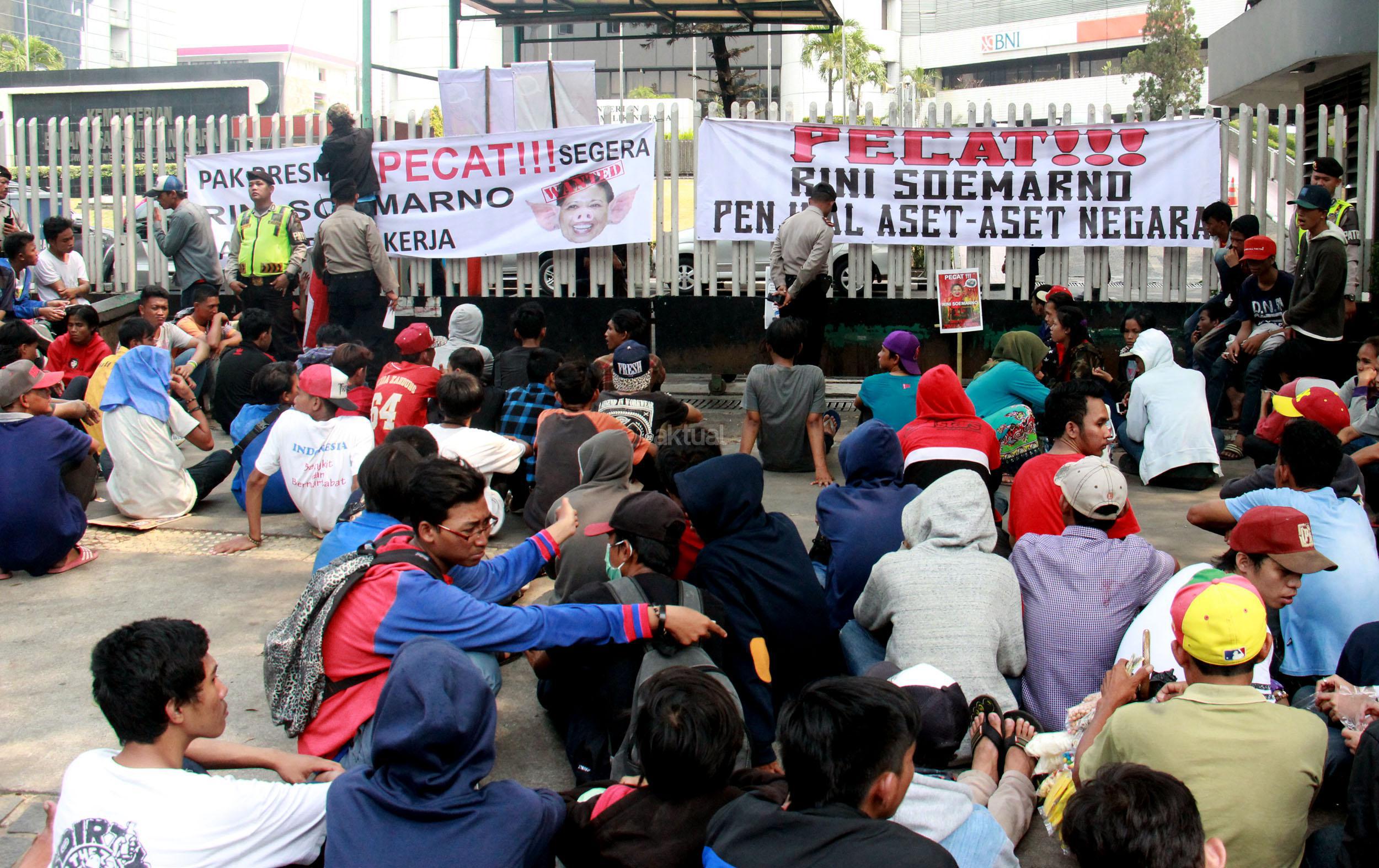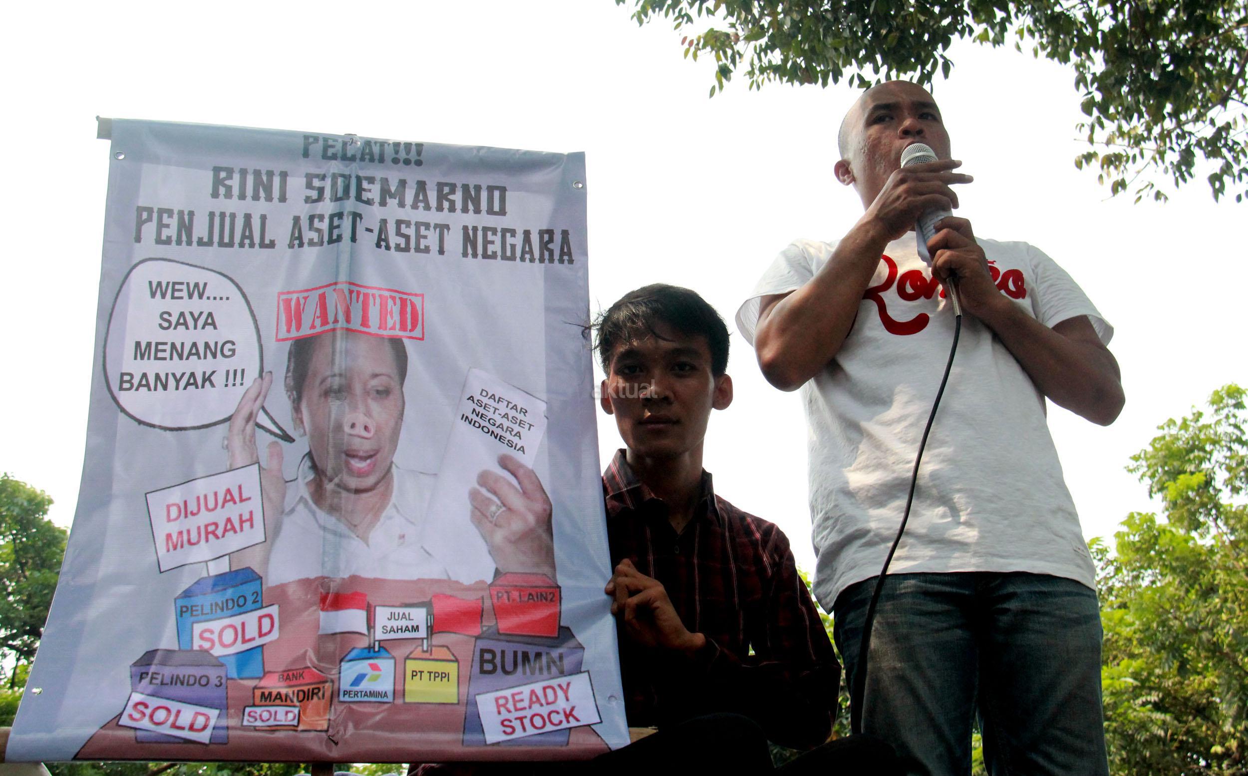 Ratusan massa dari berbagai elemen organisasi yang tergabung dalam Gerekan Penyelamat Aset Bangsa (GANAS) melakukan aksi pendudukan di kantor Kementrian Badan Usaha Milik Negara (BUMN), di Jakarta, Kamis (22/10/2015). Dalam aksi pendudukan kantor Kementrian BUMN GANAS meminta untuk Menteri BUMN Rini Soemarno segera legowo mundur dari Menteri BUMN atau dipaksa untuk turun