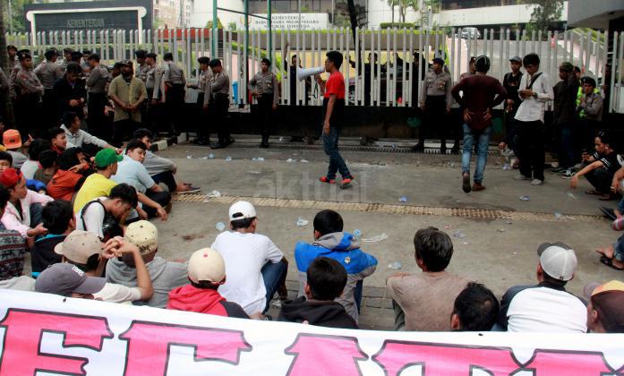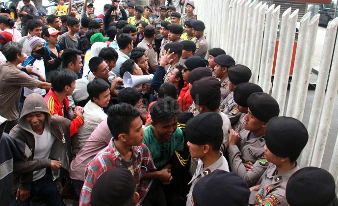 Massa GANAS sempat memaksa untuk menerobos pagar kantor Kementrian BUMN untuk menyeret keluar Menteri BUMN Rini Soemarno tapi dihadang oleh pihak Kepolisian, Jakarta, Jumat (23/10/2015). Dalam aksi kali ini GANAS memainkan theaterikal yang berhasil menyeret Menteri BUMN Rini Soemarno keluar dari kantornya dan mengingkatnya dengan rantai.