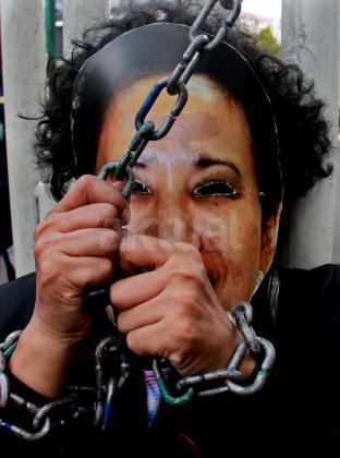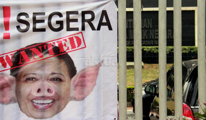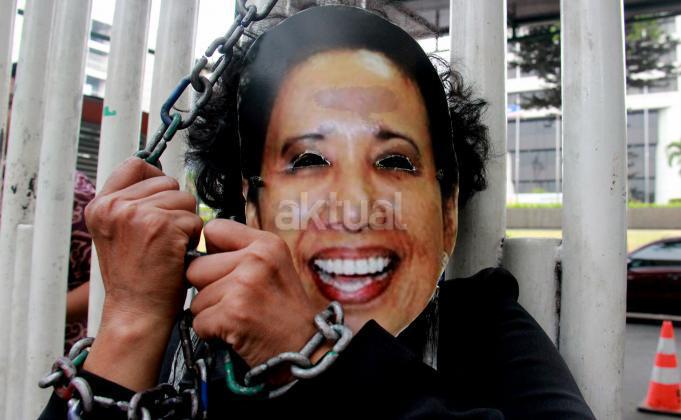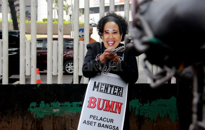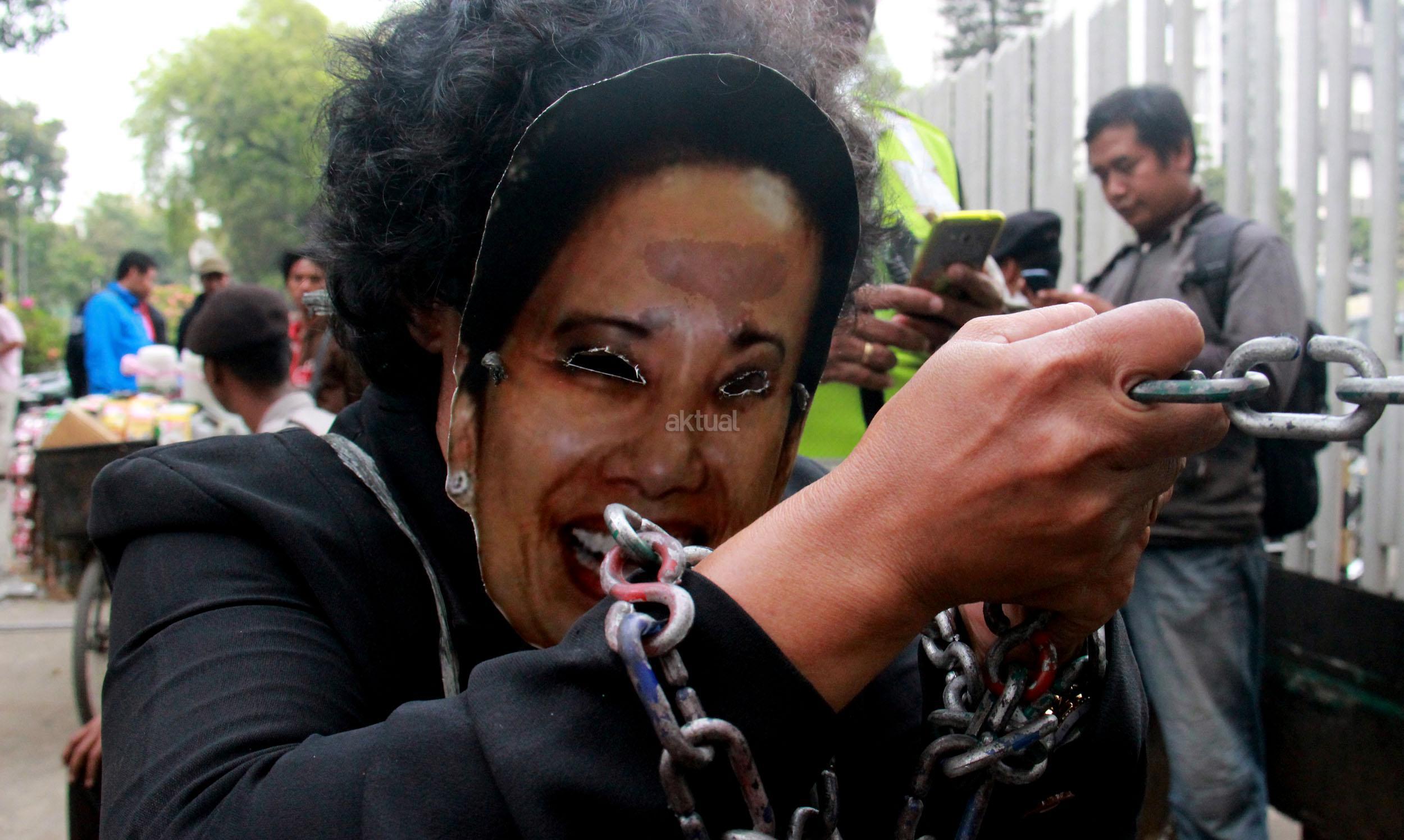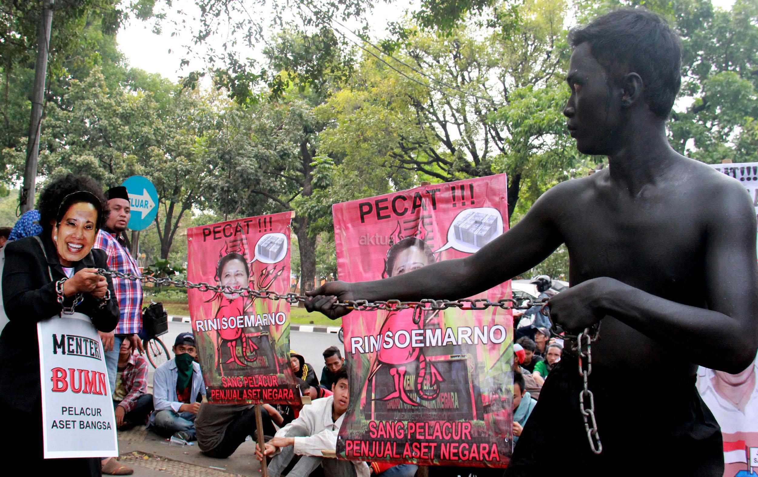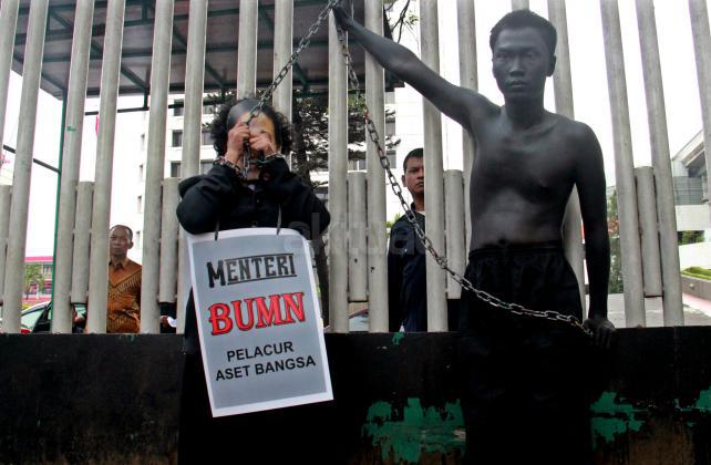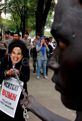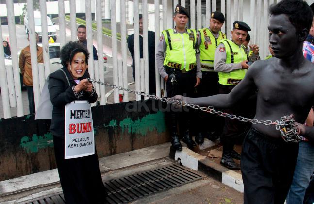 Terlihat seorang massa GANAS yang memainkan theaterikal berhasil menyeret paksa Menteri BUMN Rini Soemarno untuk keluar dari kantor Kementrian BUMN dan di ikat dengan rantai, Jakarta, Jumat (23/10/2015). GANAS menilai bahwa dalam 1 tahun kepimpinan Rini Soemarno di Kementrian BUMN hanya mampu merampok dan menjual aset-aset Negara keperusahaan asing dan melakukan persekongkolan jahat dengan para saudagar dan taipan untuk merampok BUMN dan menjual aest -aset bangsa.