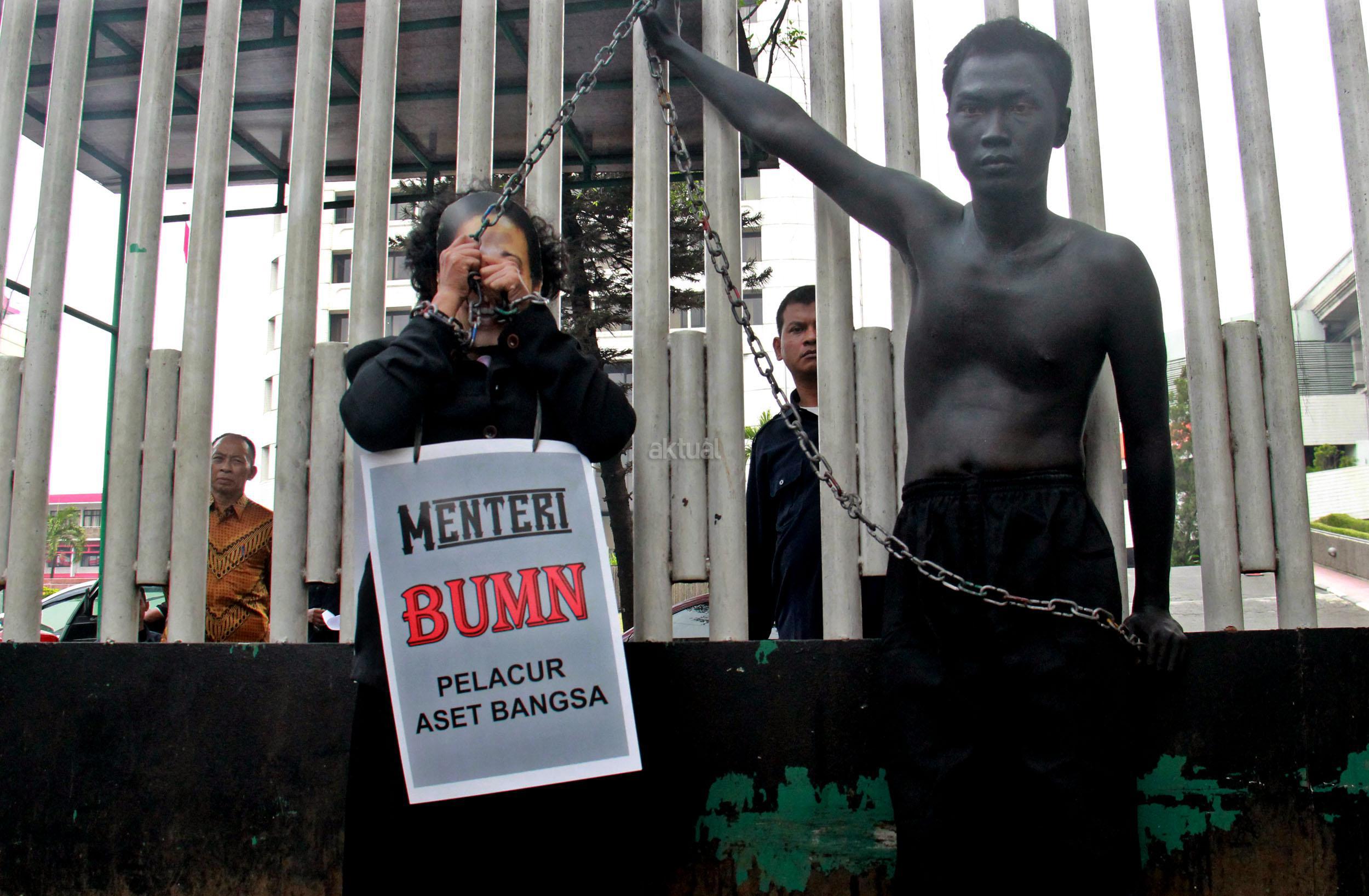 Terlihat dua orang massa GANAS memainkan theaterikal yang dimana Menteri BUMN Rini Soemarno ditarik paksa keluar dari kantor Kementrian BUMN dan di ikat dengan rantai, Jakarta, Jumat (23/10/2015). GANAS menilai bahwa dalam 1 tahun kepimpinan Rini Soemarno di Kementrian BUMN hanya mampu merampok dan menjual aset-aset Negara keperusahaan asing dan melakukan persekongkolan jahat dengan para saudagar dan taipan untuk merampok BUMN dan menjual aest -aset bangsa.