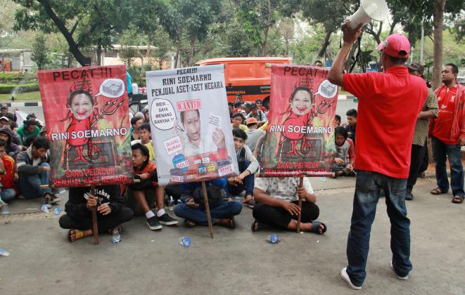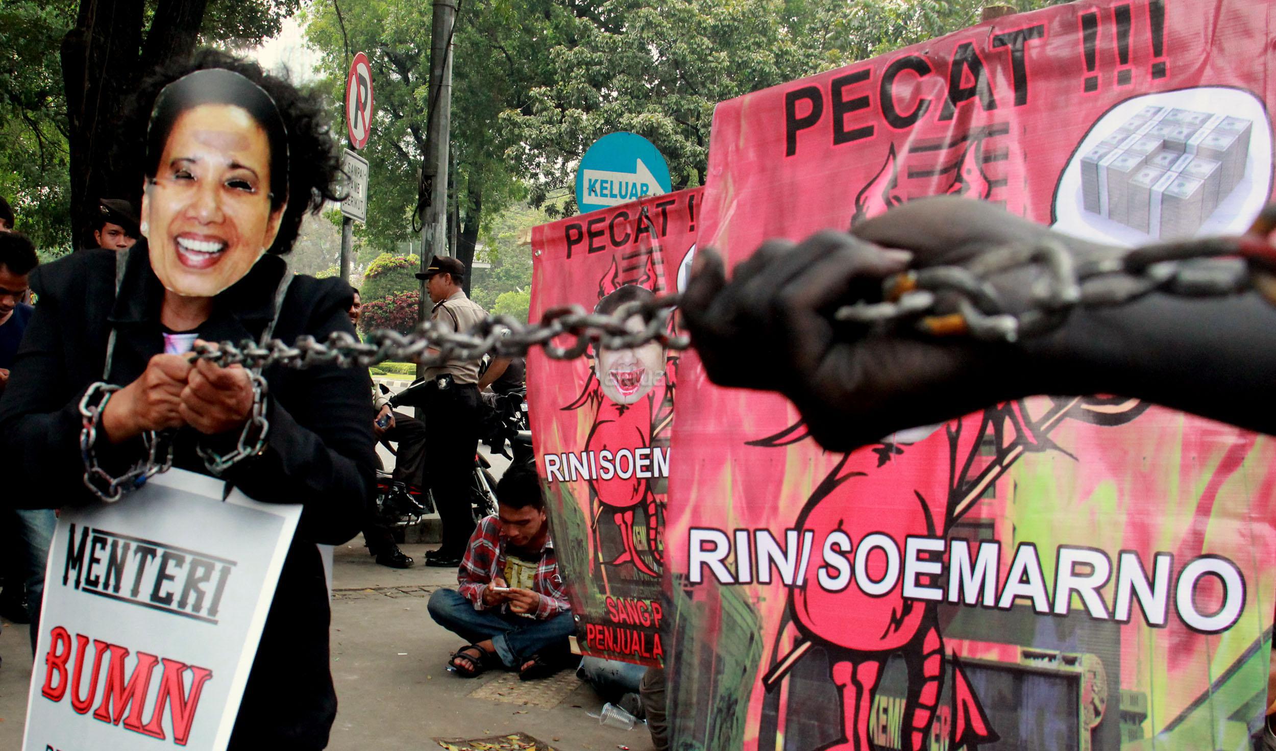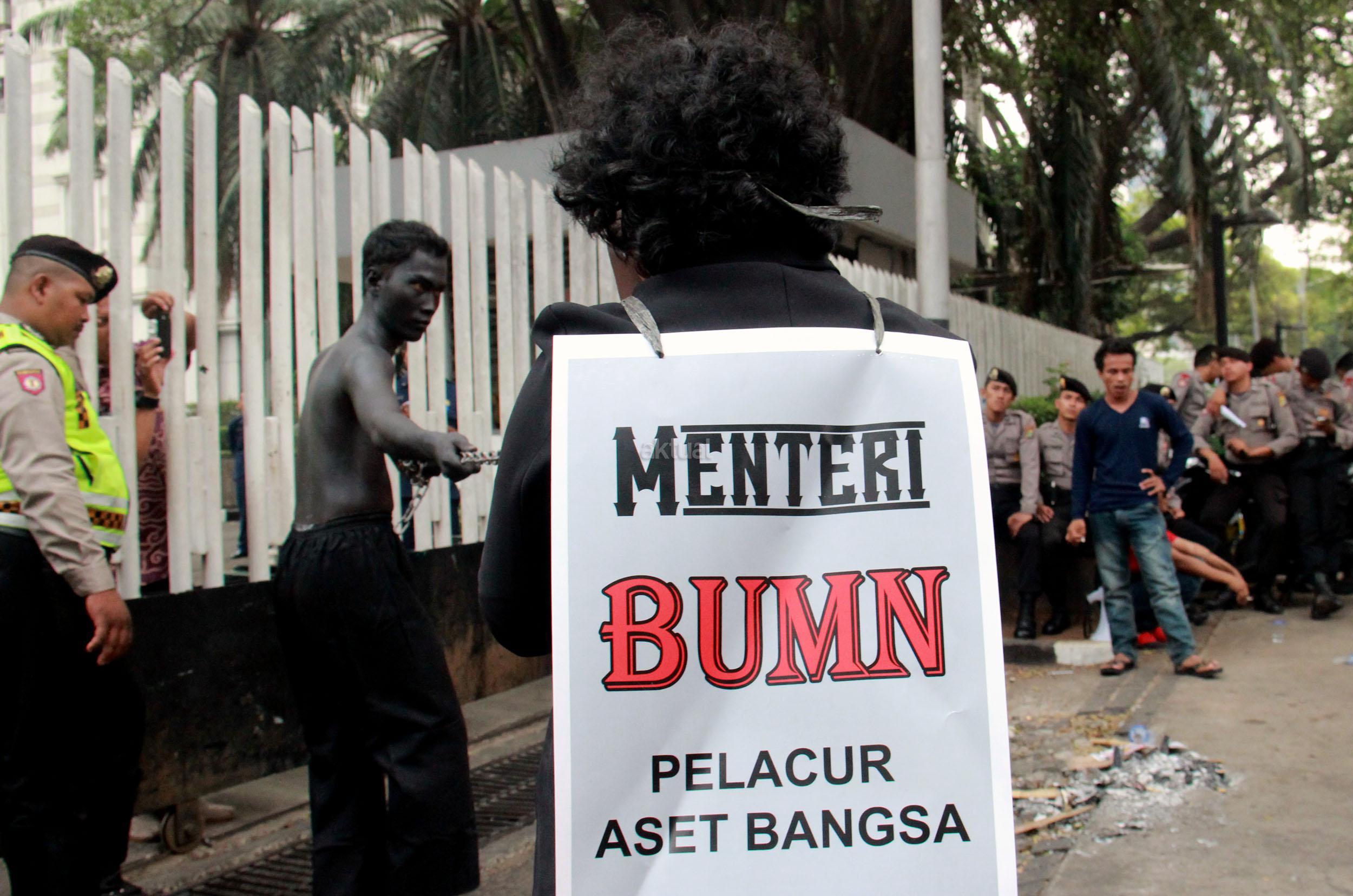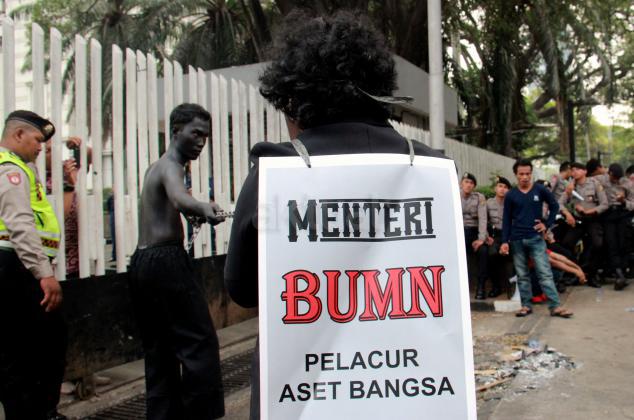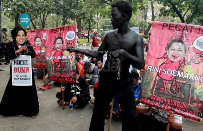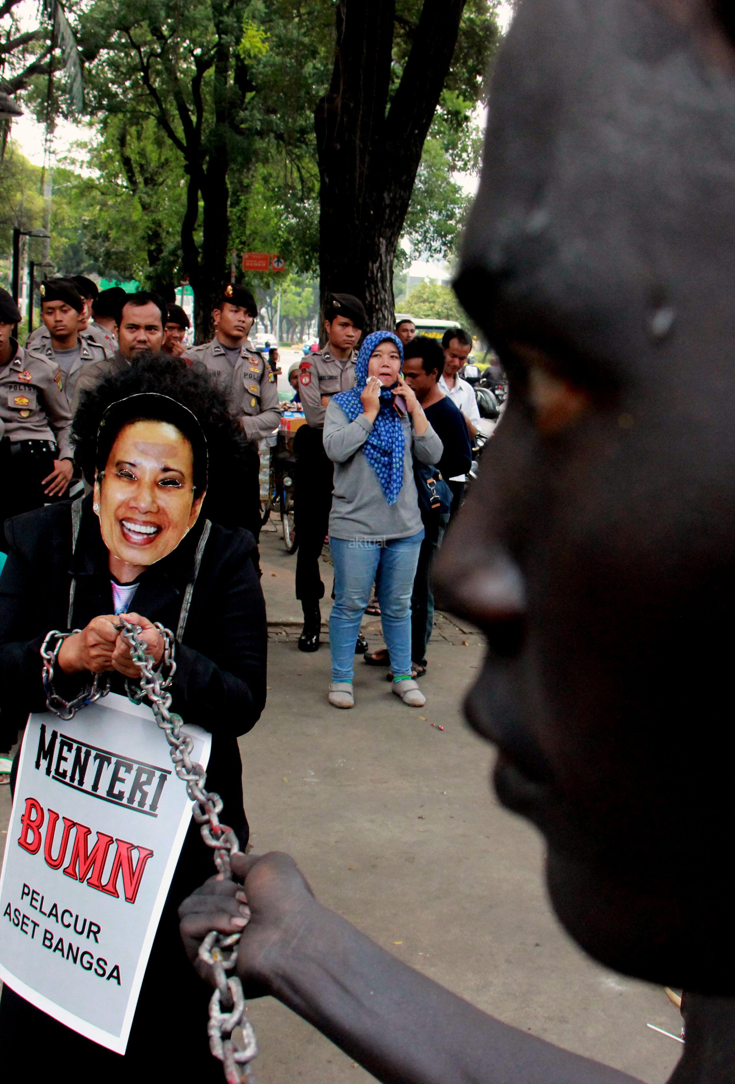 Ratusan massa organisasi dari berbagai elemen yang tergabung dalam Gerekan Penyelamat Aset Bangsa (GANAS) kembali melakukan aksi pendudukan kantor Kementrian BUMN untuk memaksa keluar Menteri BUMN Rini Soemarno, Jakarta, Jumat (23/10/2015). Dalam aksi kali ini GANAS memainkan theaterikal yang berhasil menyeret Menteri BUMN Rini Soemarno keluar dari kantornya dan mengingkatnya dengan rantai.