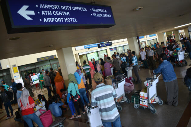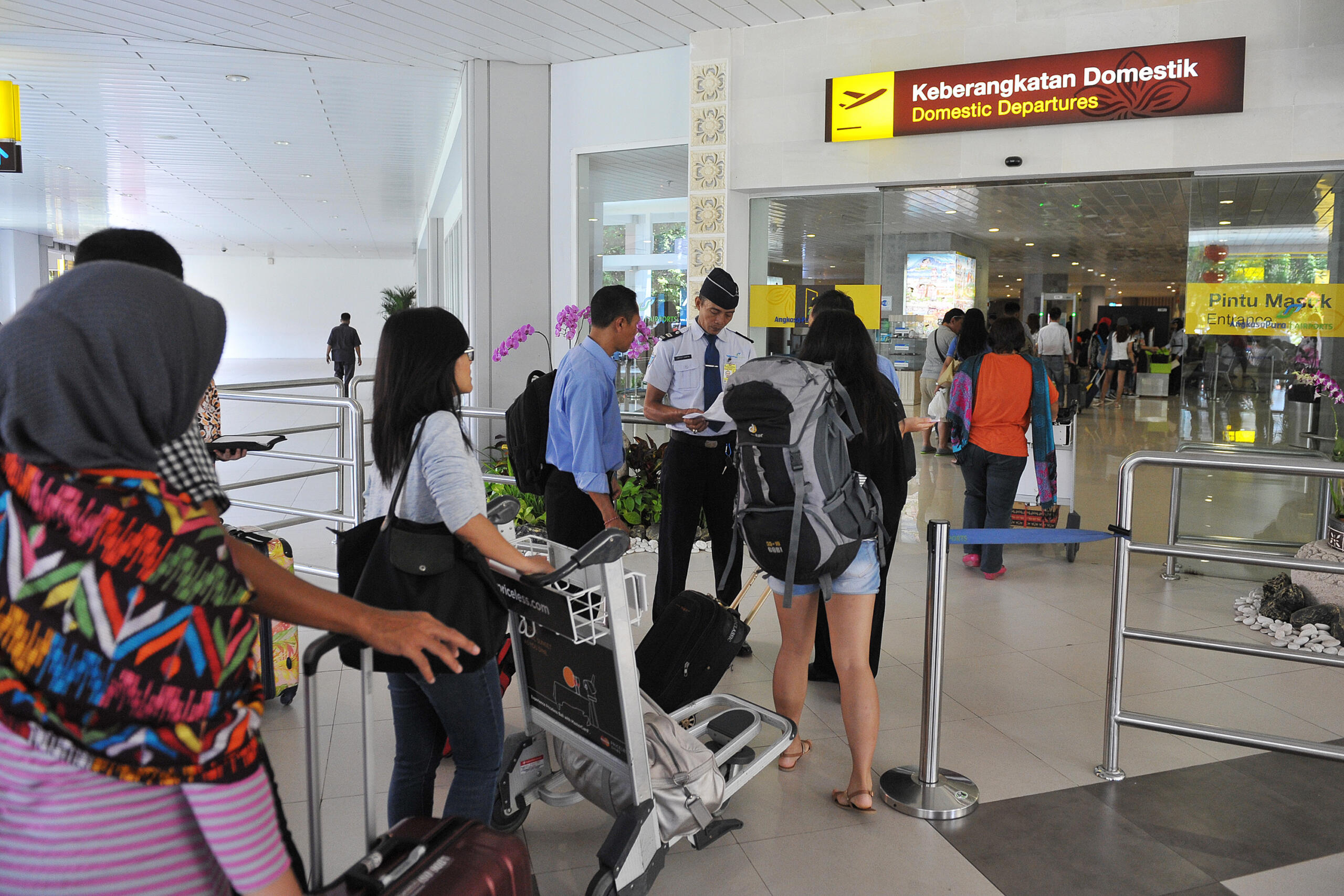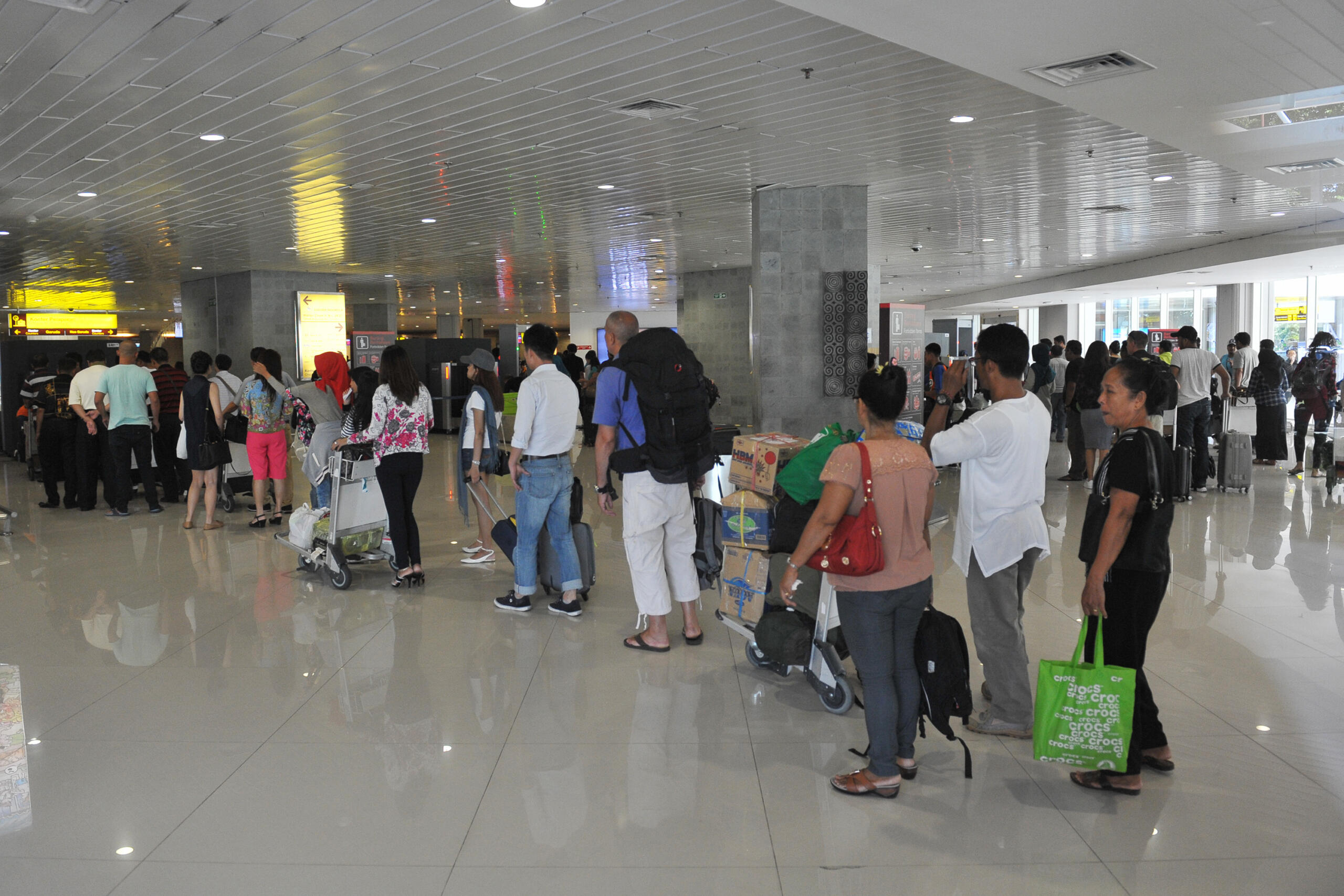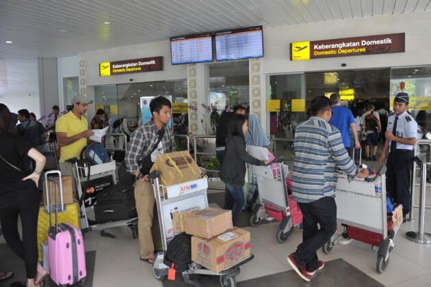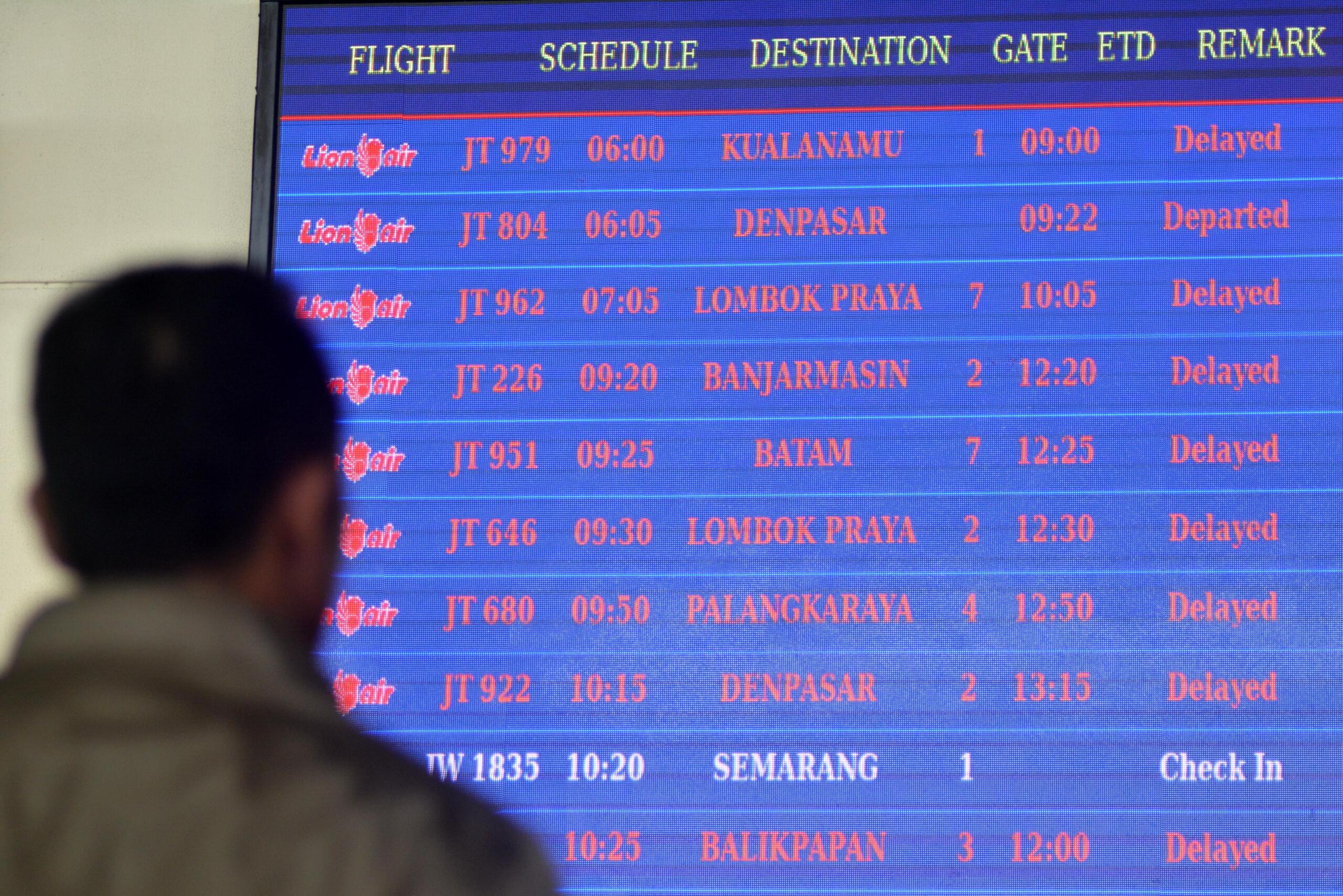 Petugas bandara mengawasi penumpang yang antre di terminal keberangkatan domestik Bandara I Gusti Ngurah Rai, Denpasar, Selasa (10/5). Sebanyak 12 penerbangan maskapai Lion Air dari dan ke Denpasar mengalami gangguan opersional sejak pukul 06.45 Wita sehingga mengakibatkan terjadinya penumpukan dan antrean penumpang. ANTARA FOTO/Nyoman Budhiana/foc/16.