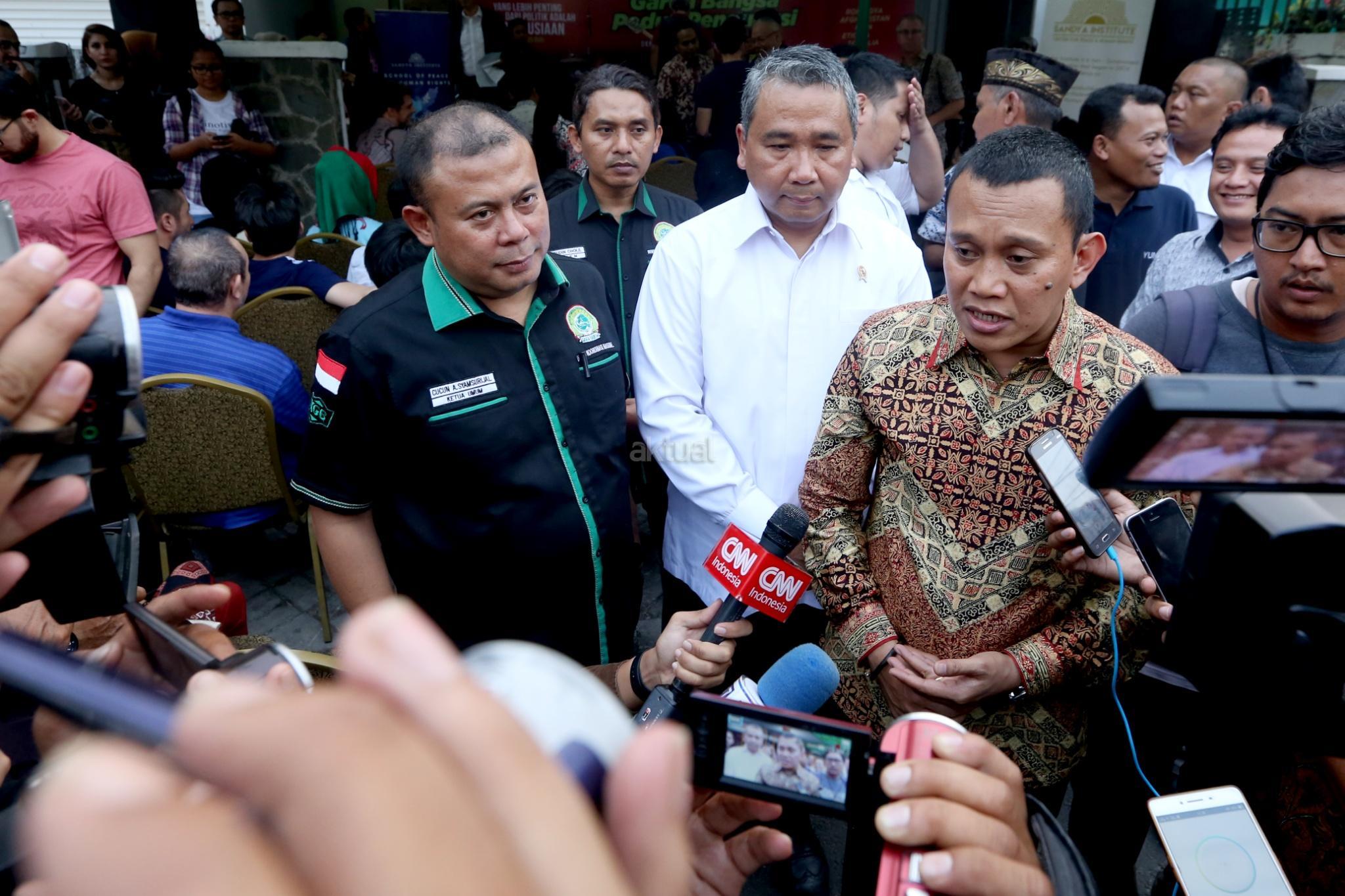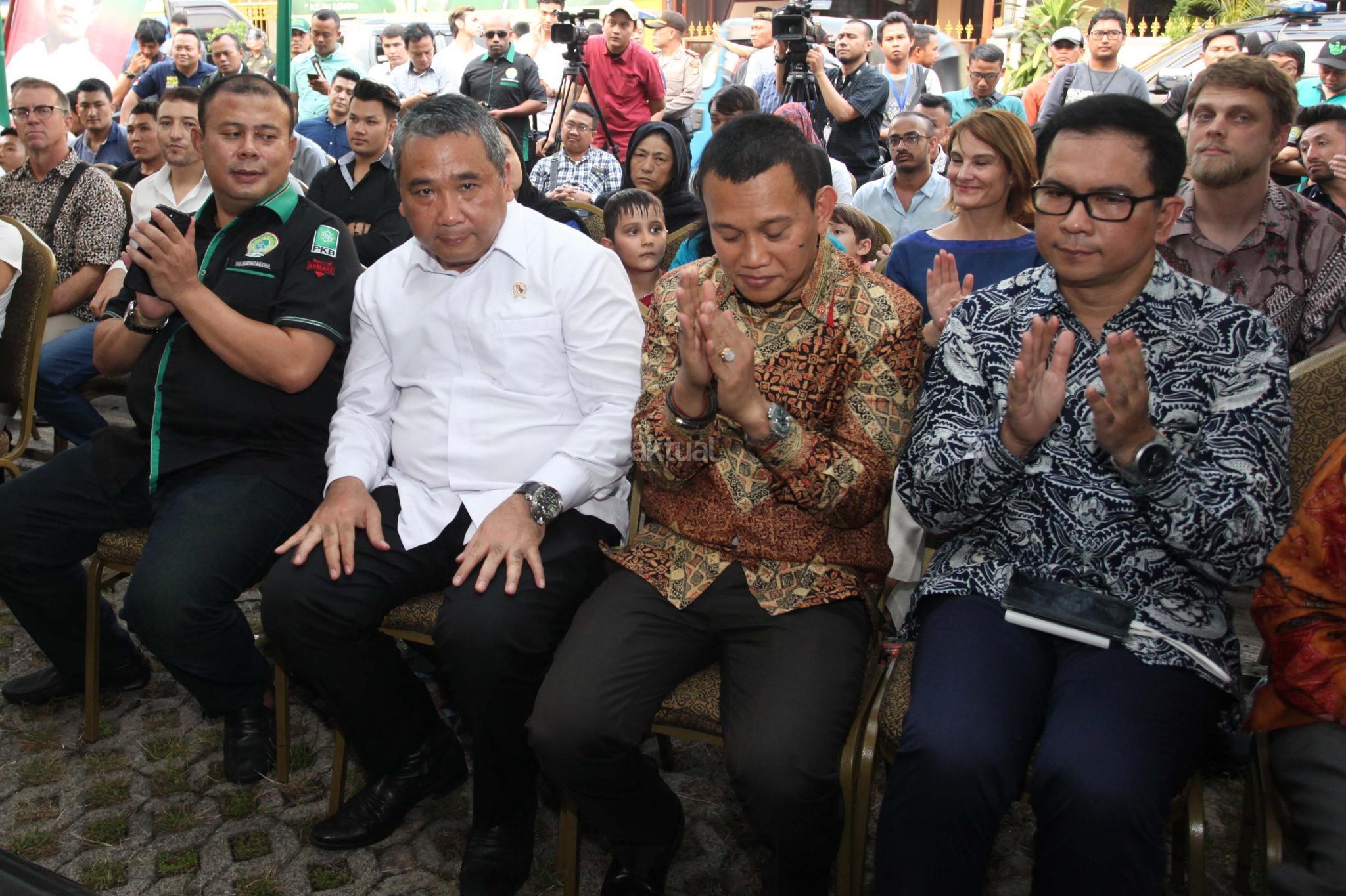 Menteri Desa, Pembangunan Daerah Tertinggal dan Transmigrasi, Eko Putro Sandjojo bersama Sekertaris Jenderal Partai Kebangkitan Bangsa (PKB) Abdul Kadir Karding dan Ketua Umum Garda Bangsa Cucun Syamsurijal saat acara berbagai Negara yang ada di Indonesia saat acara Penggalangan dana untuk Pengungsi Rohingnya, Jakarta, Selasa (12/9). Acara tersebut bentuk simpatik terhadap kekerasan yang melanda etnis Rohingnya di Myanmar dan dihadiri Sejumlah artis dan pengungsi dari berbagai Negara yang ada di Indonesia. AKTUAL/Tino Oktaviano