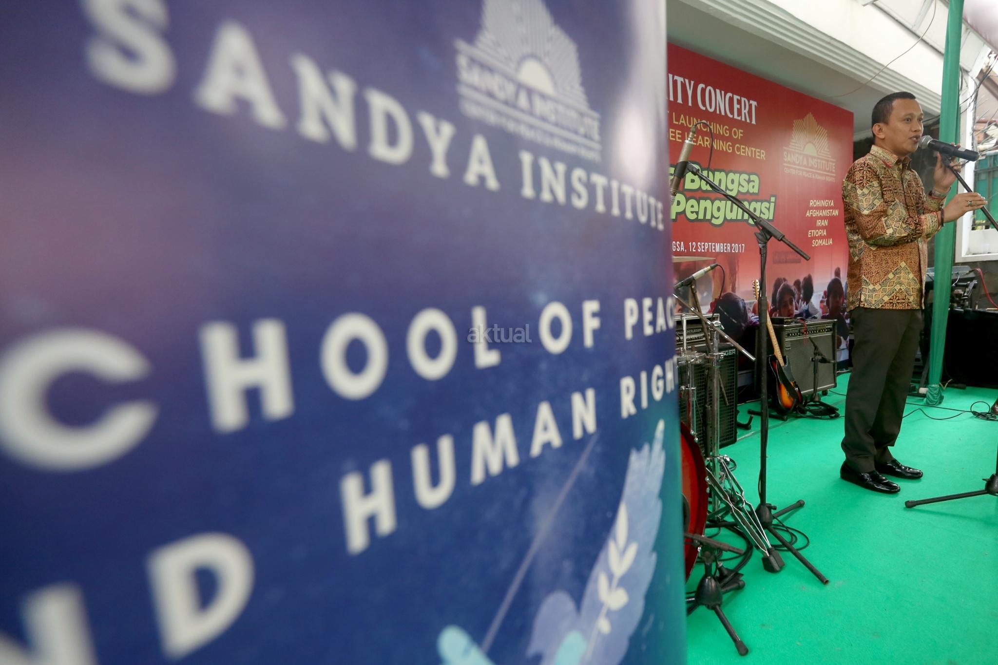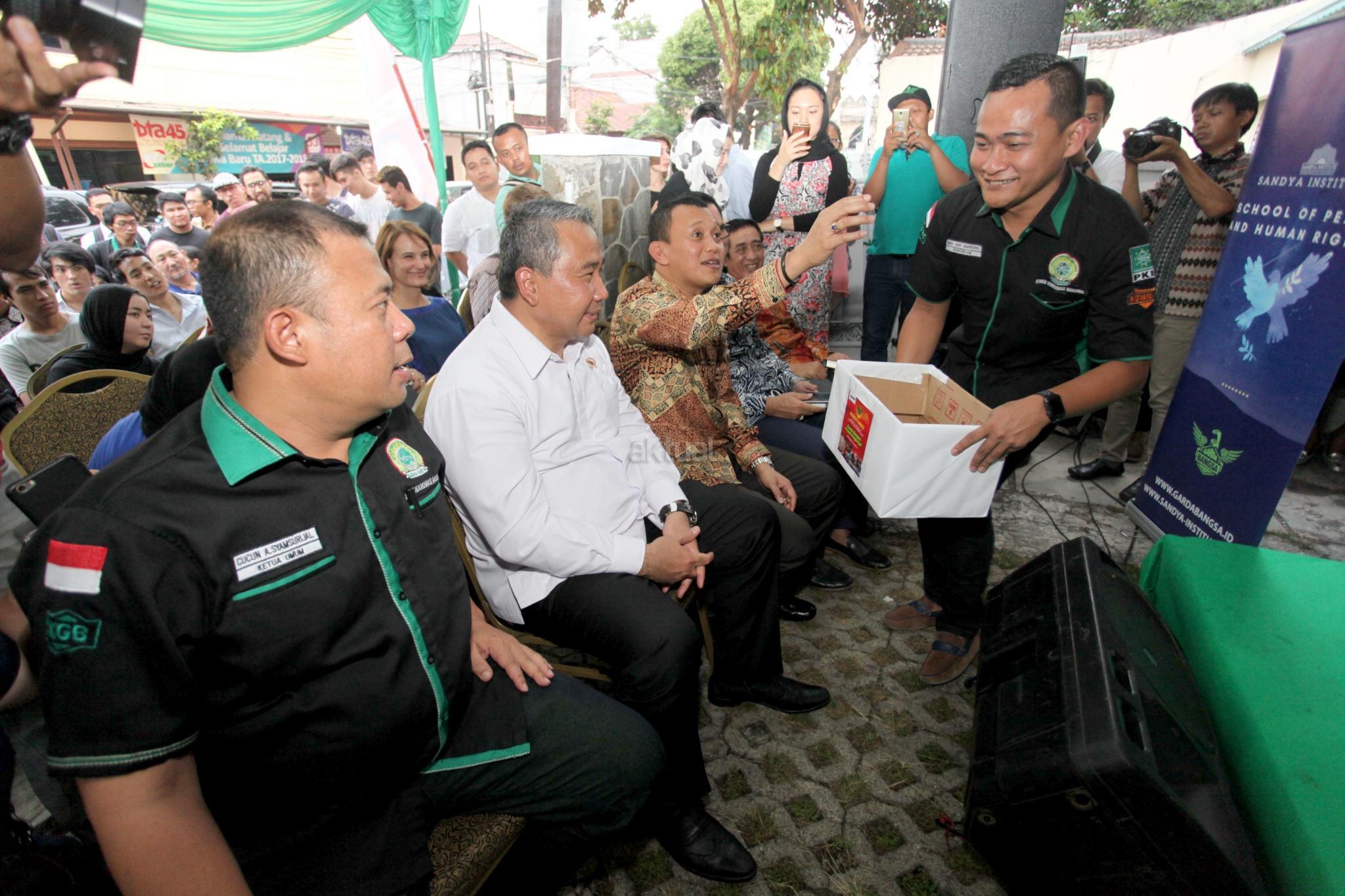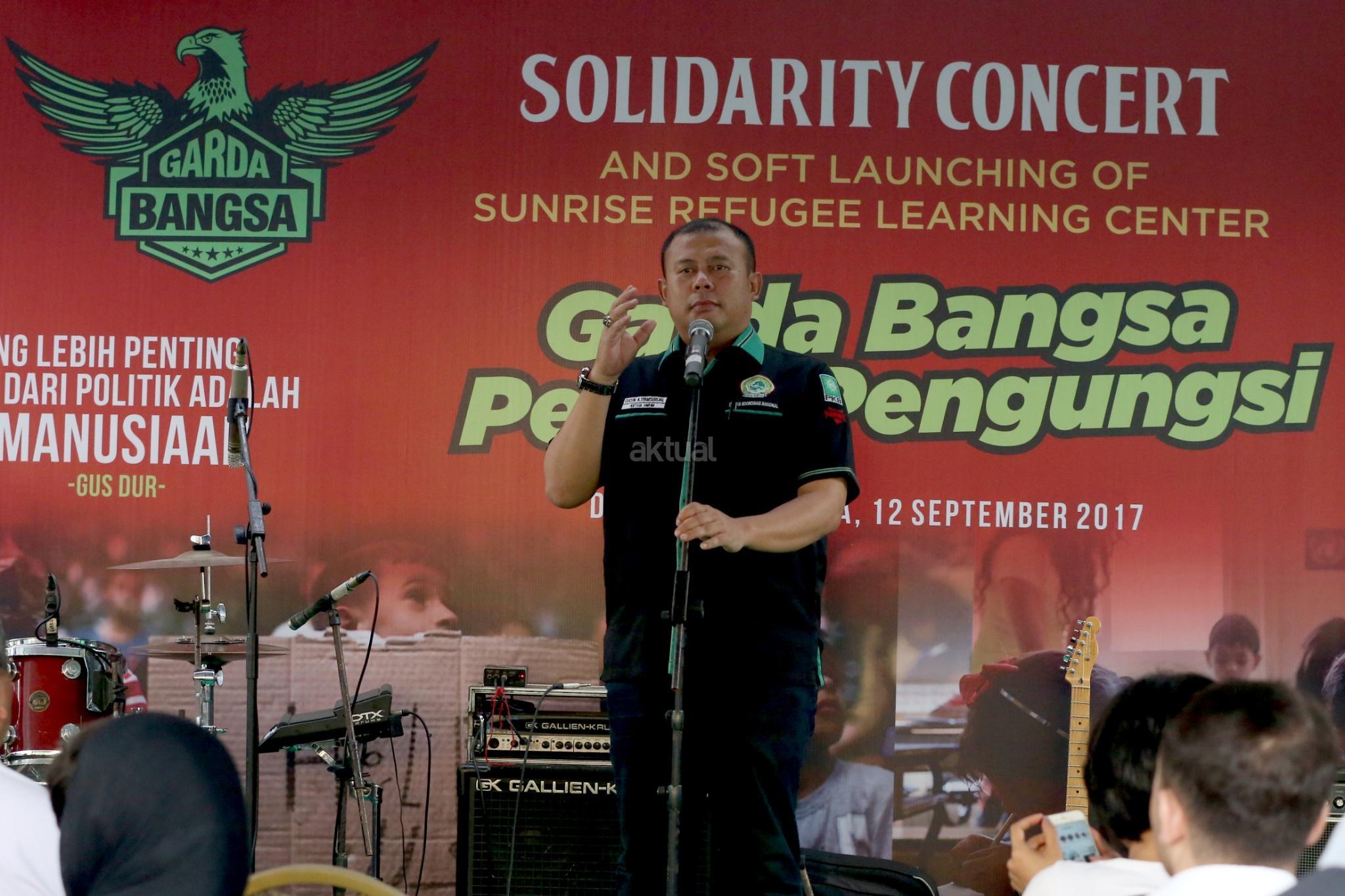 Ketua Umum Garda Bangsa Cucun Syamsurijal memberikan sambutan saat menghadiri acara Penggalangan dana untuk Pengungsi Rohingnya, Jakarta Selasa (12/9). Acara tersebut bentuk simpatik terhadap kekerasan yang melanda etnis Rohingnya di Myanmar dan dihadiri Sejumlah artis dan pengungsi dari berbagai Negara yang ada di Indonesia. AKTUAL/Tino Oktaviano