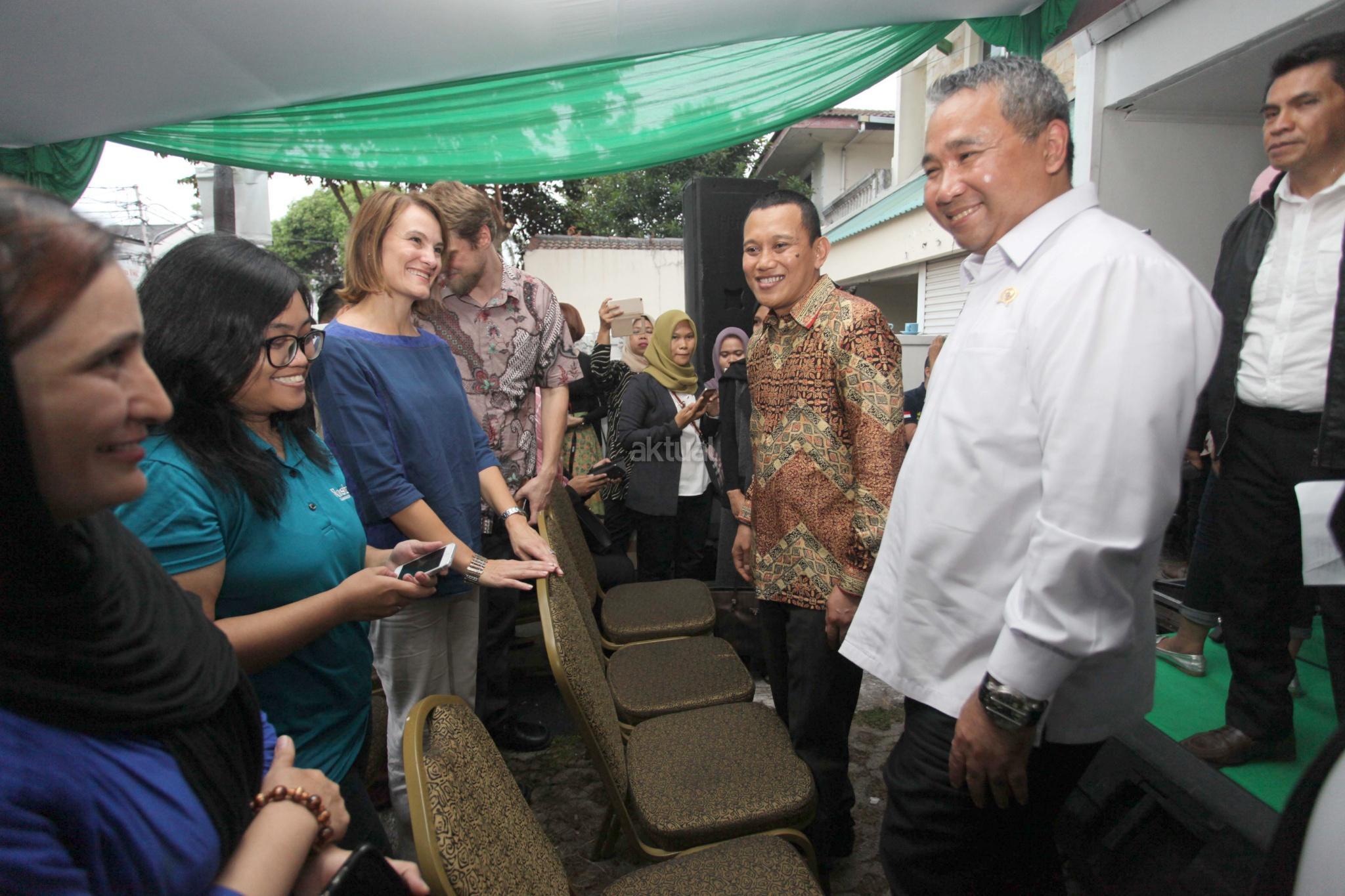 Menteri Desa, Pembangunan Daerah Tertinggal dan Transmigrasi, Eko Putro Sandjojo (kanan) bersama Sekertaris Jenderal Partai Kebangkitan Bangsa (PKB) Abdul Kadir Karding (kedua kanan) berbincang dengan para pendukung acara Penggalangan dana untuk Pengungsi Rohingnya, Jakarta, Selasa (12/9). Acara tersebut bentuk simpatik terhadap kekerasan yang melanda etnis Rohingnya di Myanmar dan dihadiri Sejumlah artis dan pengungsi dari berbagai Negara yang ada di Indonesia. AKTUAL/Tino Oktaviano