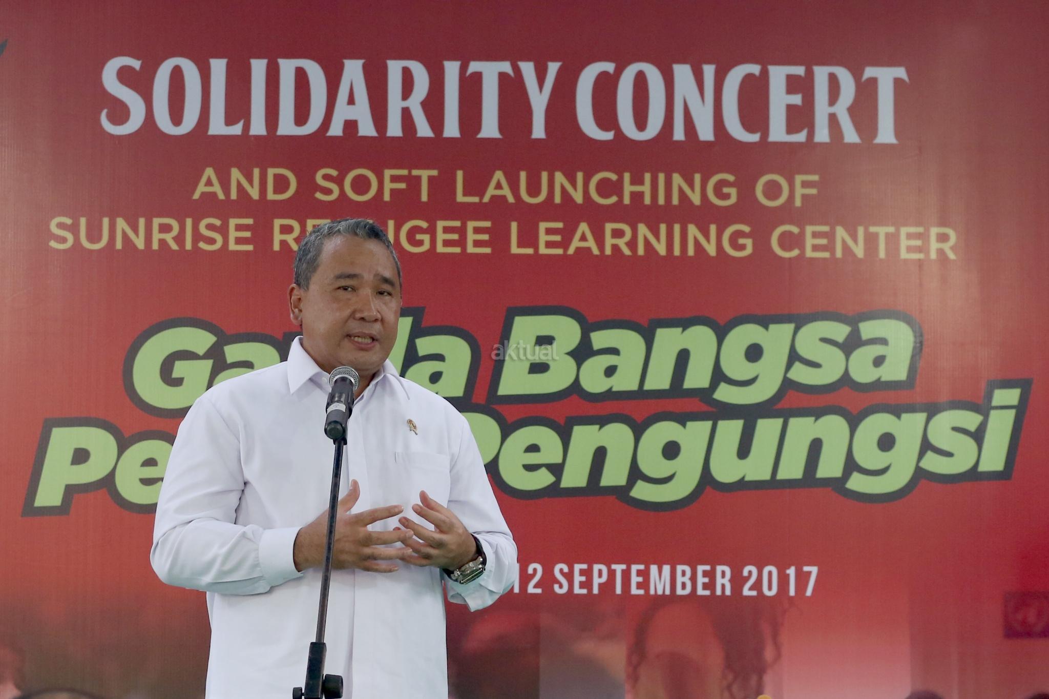 Menteri Desa, Pembangunan Daerah Tertinggal dan Transmigrasi, Eko Putro Sandjojo memberikan sambutan saat menghadiri acara Penggalangan dana untuk Pengungsi Rohingnya, Jakarta Selasa (12/9). Acara tersebut bentuk simpatik terhadap kekerasan yang melanda etnis Rohingnya di Myanmar dan dihadiri Sejumlah artis dan pengungsi dari berbagai Negara yang ada di Indonesia. AKTUAL/Tino Oktaviano