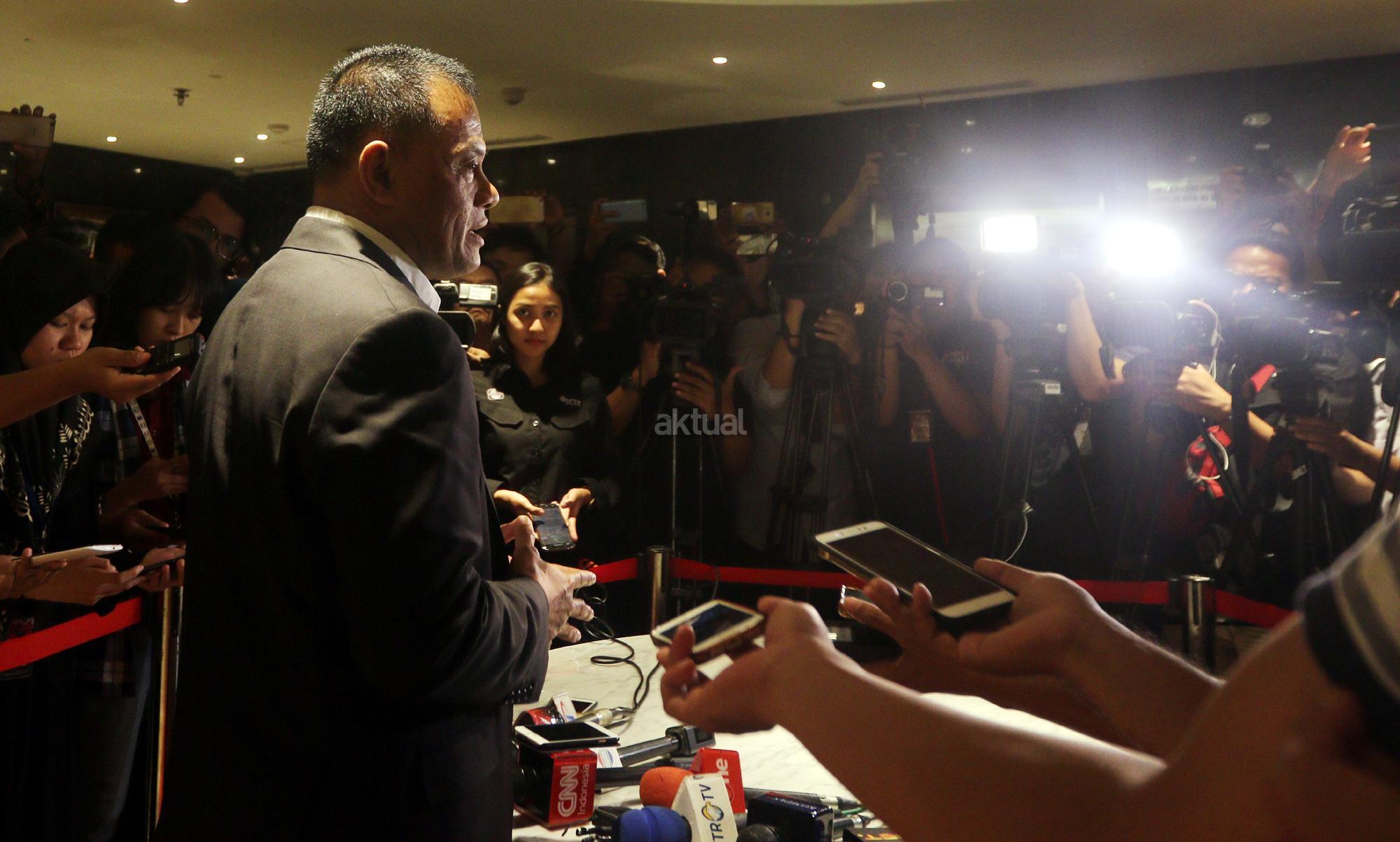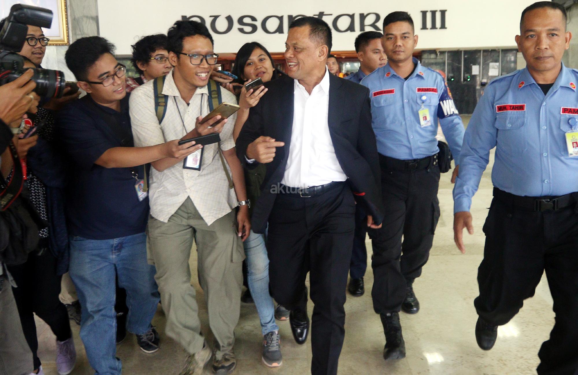 Mantan Panglima TNI Jenderal (Purn) Gatot Nurmantyo ditanya wartawan usai bertemu Ketua MPR Zulkifli Hasan di Nusantara III, Kompleks Senayan, Jakarta, Selasa (8/5/18). Dalam pertemuan tersebut keduannya akan membahas soal situasi menjelang Pilpres 2019. AKTUAL/Tino Oktaviano