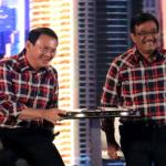 Pasangan Calon Gubernur dan Wakil Gubernur DKI Jakarta Basuki Tjahaja Purnama-Djarot Saiful Hidayat saat mengikuti Debat Calon Gubernur dan Wakil Gubernur DKI Jakarta di Jakarta, Jumat (27/1/2017). Debat calon Gubernur dan Wakil Gubernur kedua tersebut mengangkat tema reformasi birokrasi dan pengelolaan, pengawasan perkotaan.