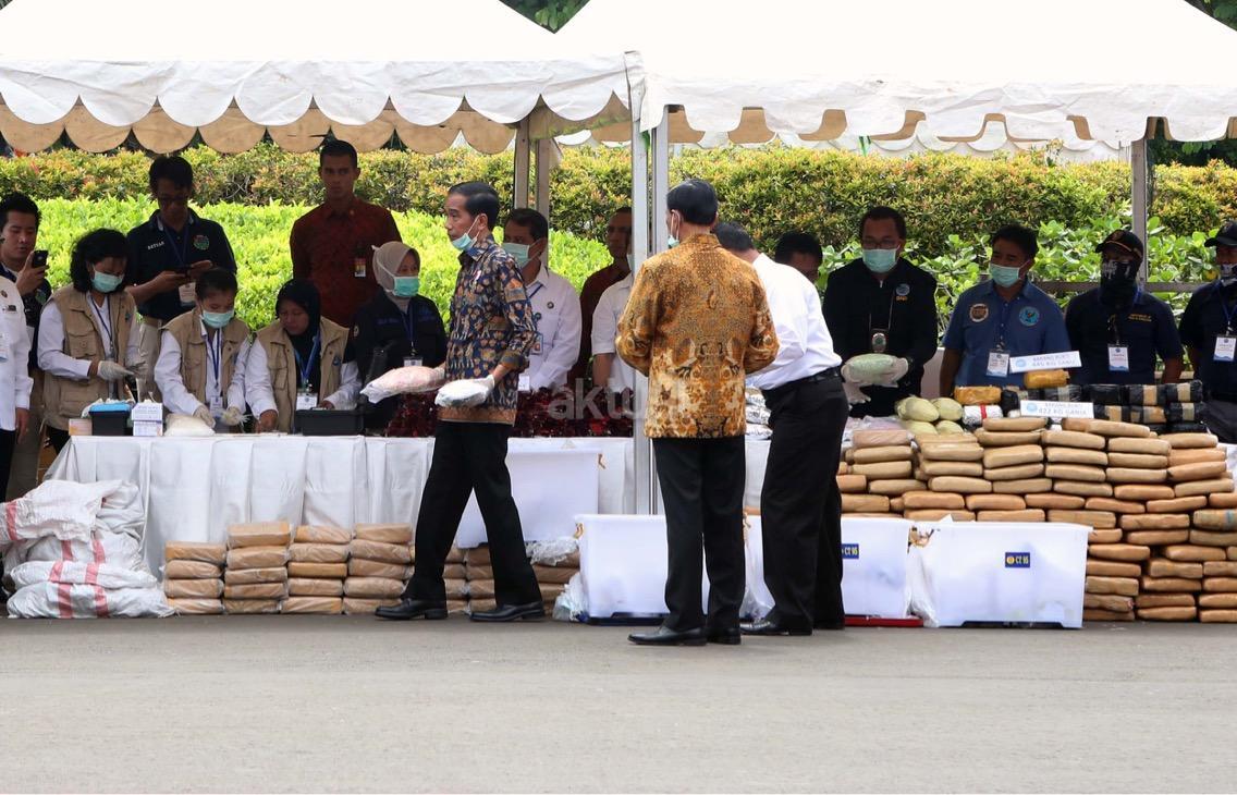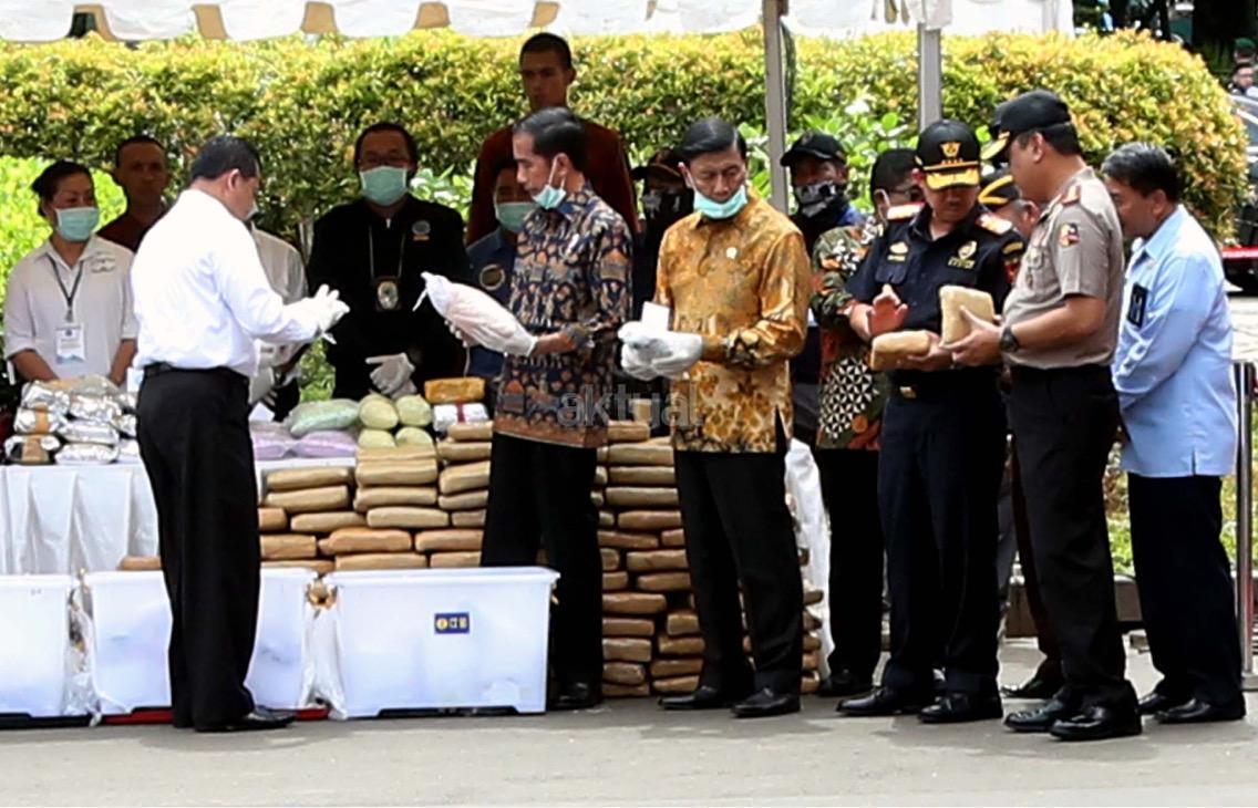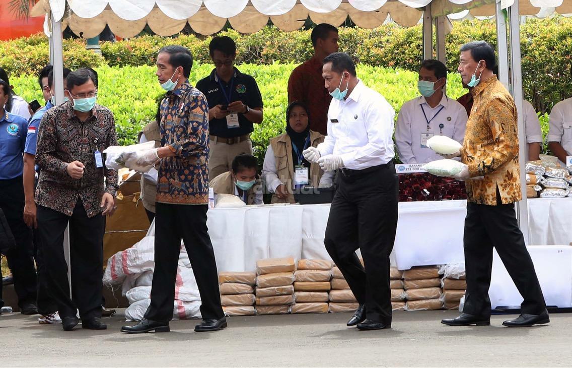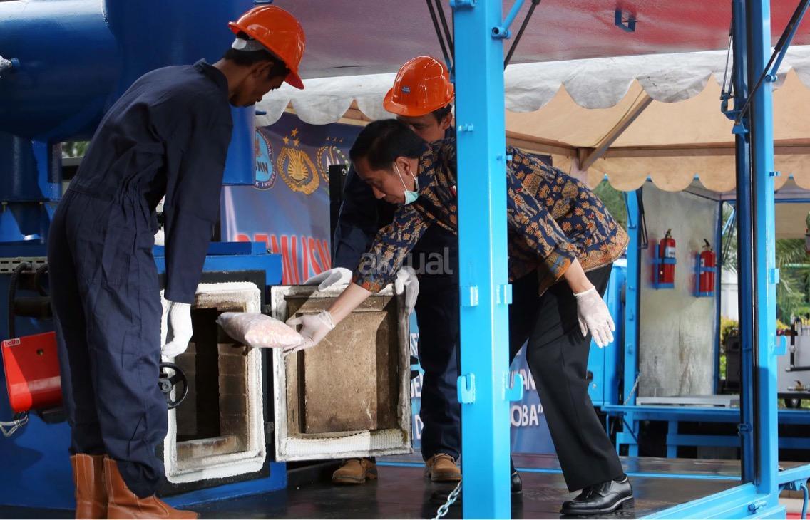 Presiden Jokowi memusnahkan barang bukti narkoba. Barang bukti yang dimusnahkan itu yakni sabu sebanyak 445 kilogram, ekstasi sebanyak 190 ribu butir, ganja kering 422 kilogram, dan happy five sebanyak 323 ribu butir. AKTUAL/Munzir