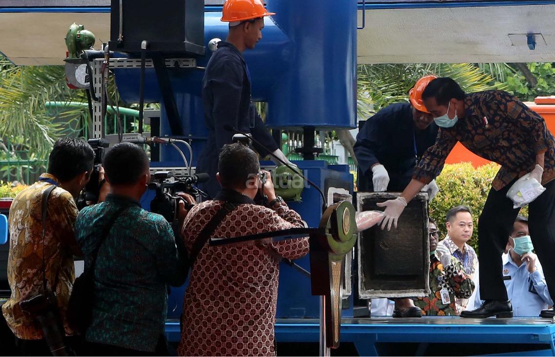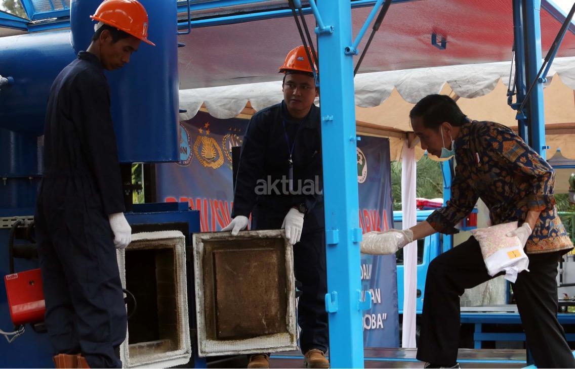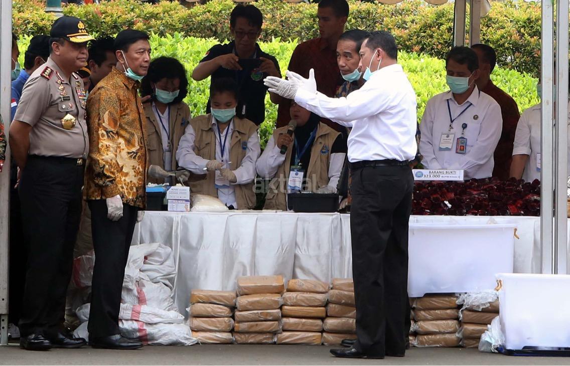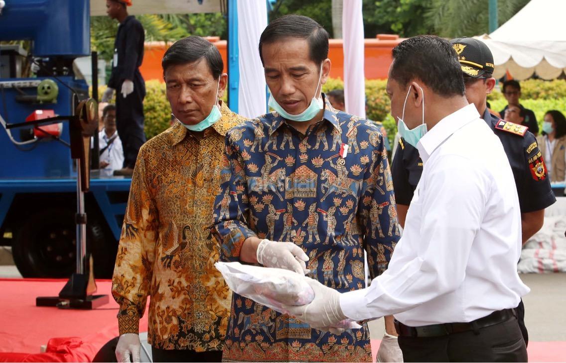 Presiden Jokowi memusnahkan barang bukti narkoba. Barang bukti yang dimusnahkan itu yakni sabu sebanyak 445 kilogram, ekstasi sebanyak 190 ribu butir, ganja kering 422 kilogram, dan happy five sebanyak 323 ribu butir. AKTUAL/Munzir