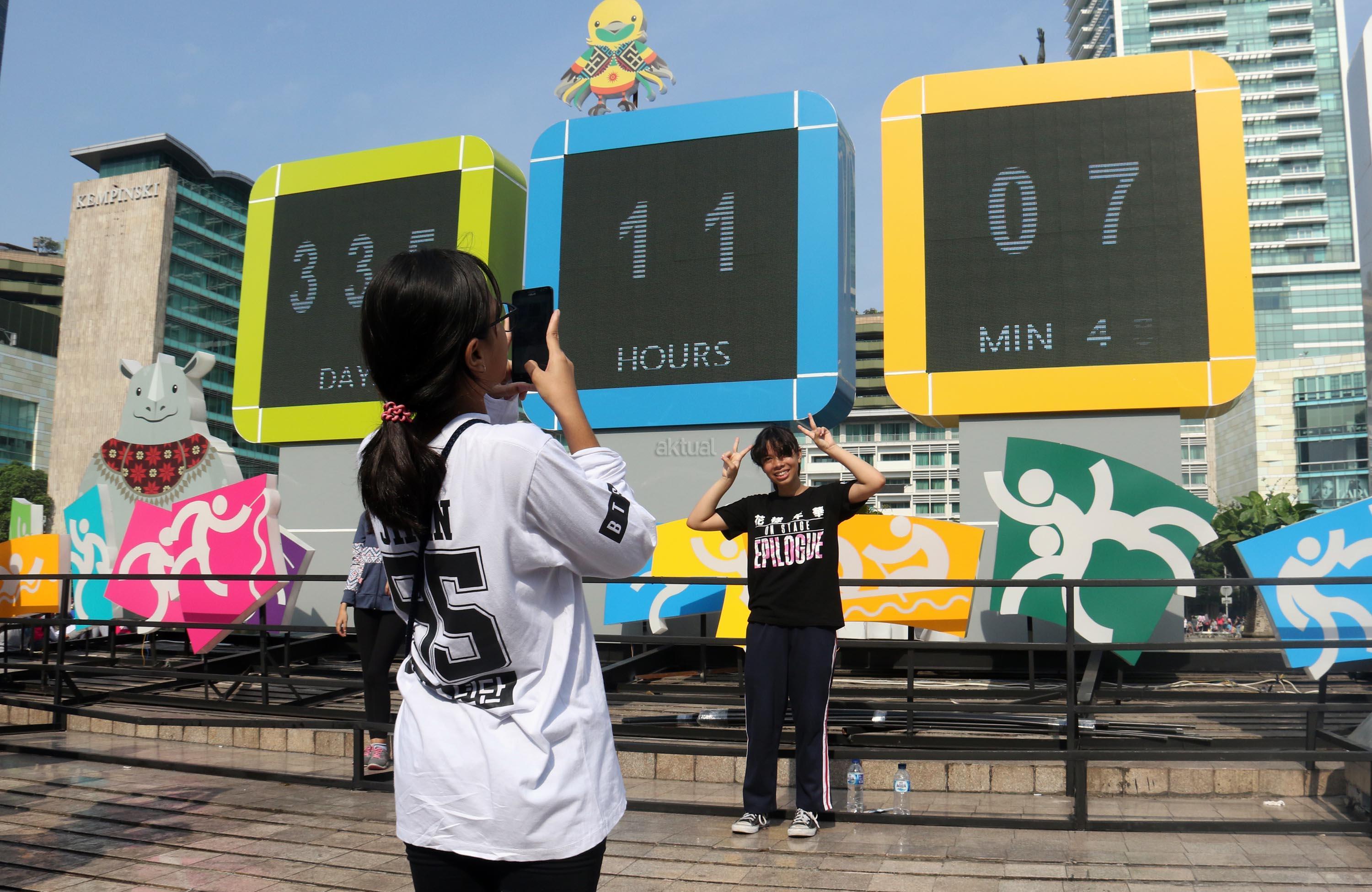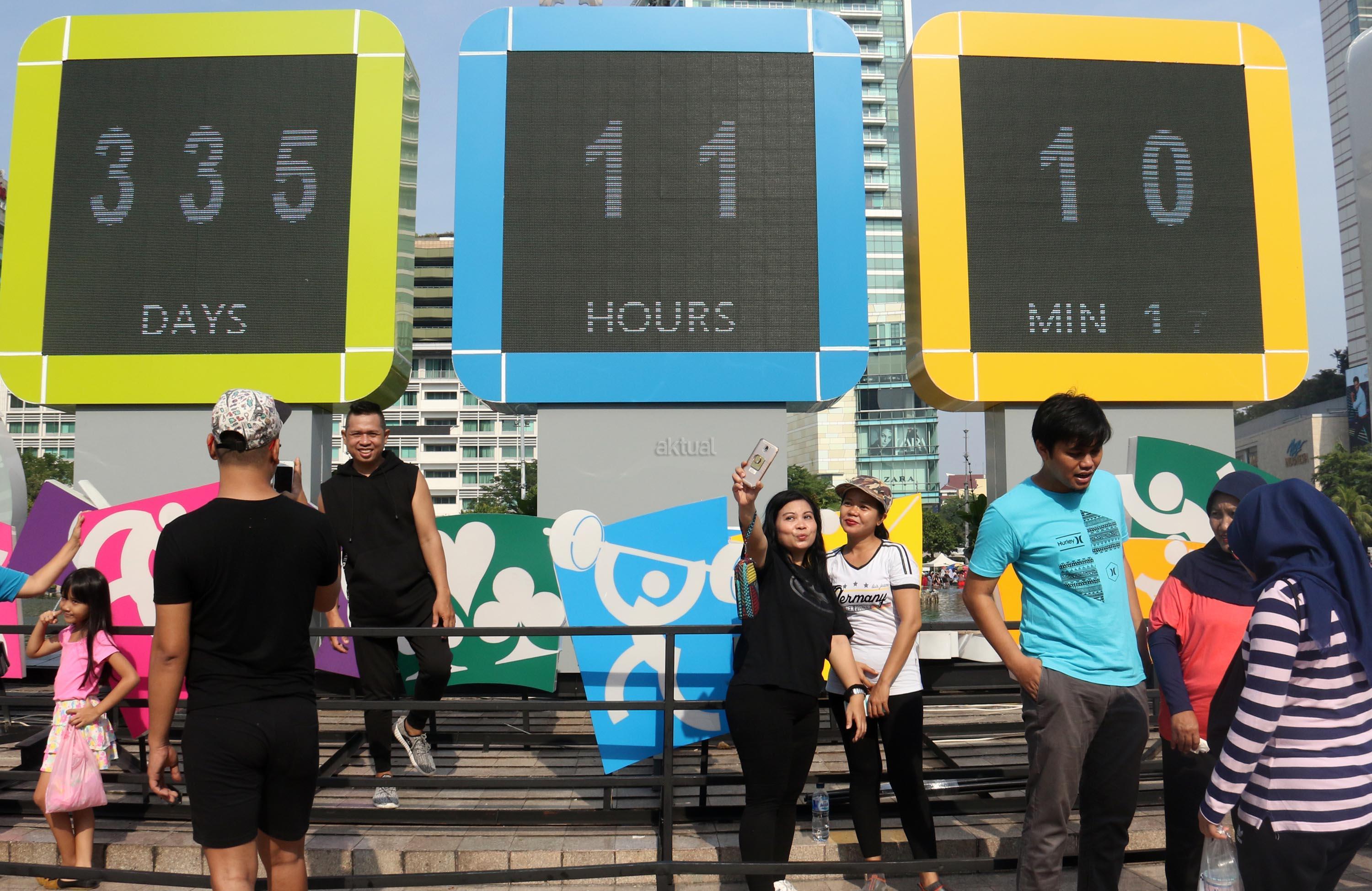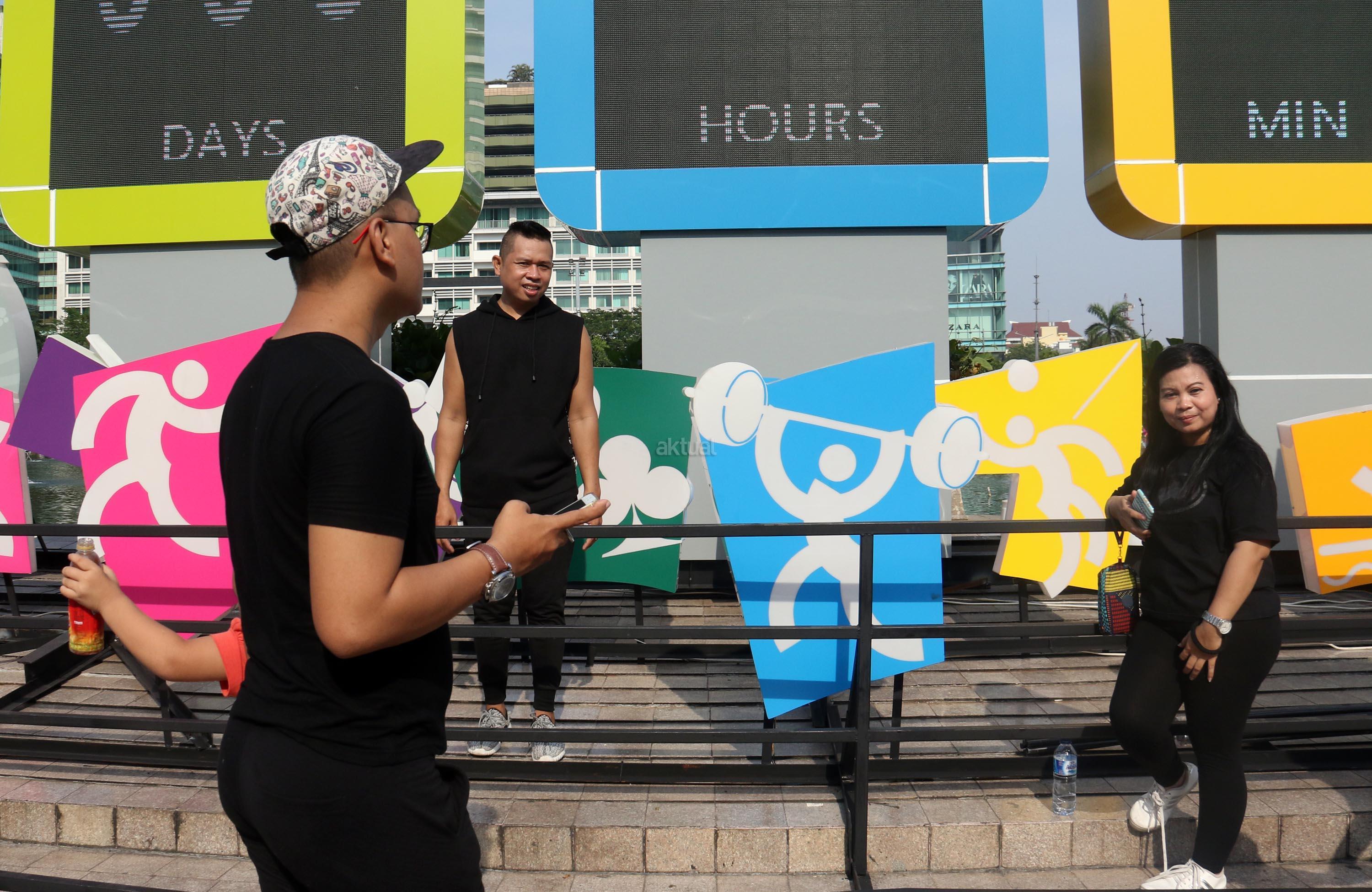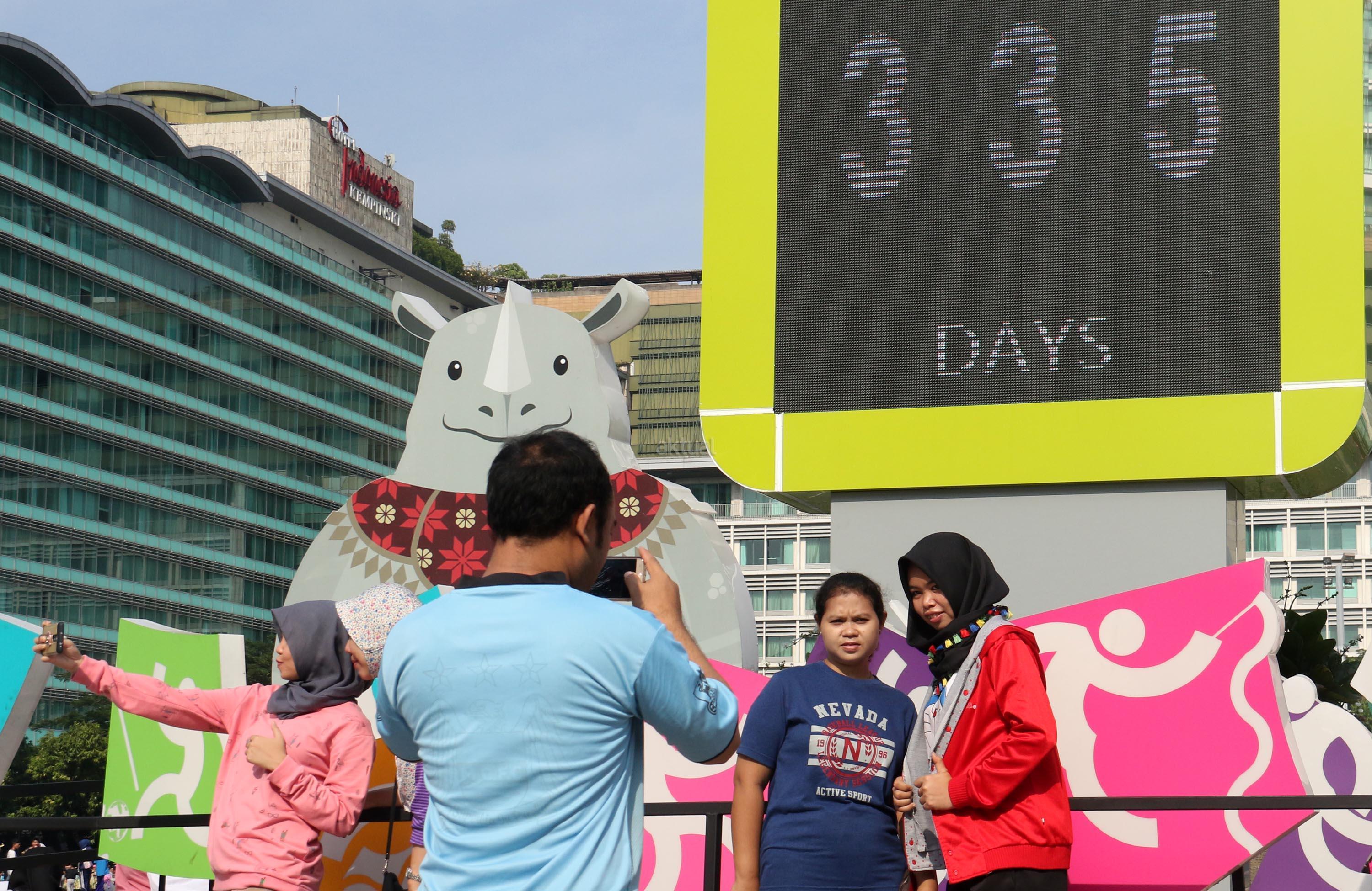 Warga berfoto dengan latar layar Countdown Asian Games 2018 saat Car Free Day di Bundaran HI, Jakarta, Minggu, (17/9/2017). Layar Countdown Asian Games 2018 ini menandai hitung mundur untuk pelaksanaan Asian Games 2018. AKTUAL/Munzir