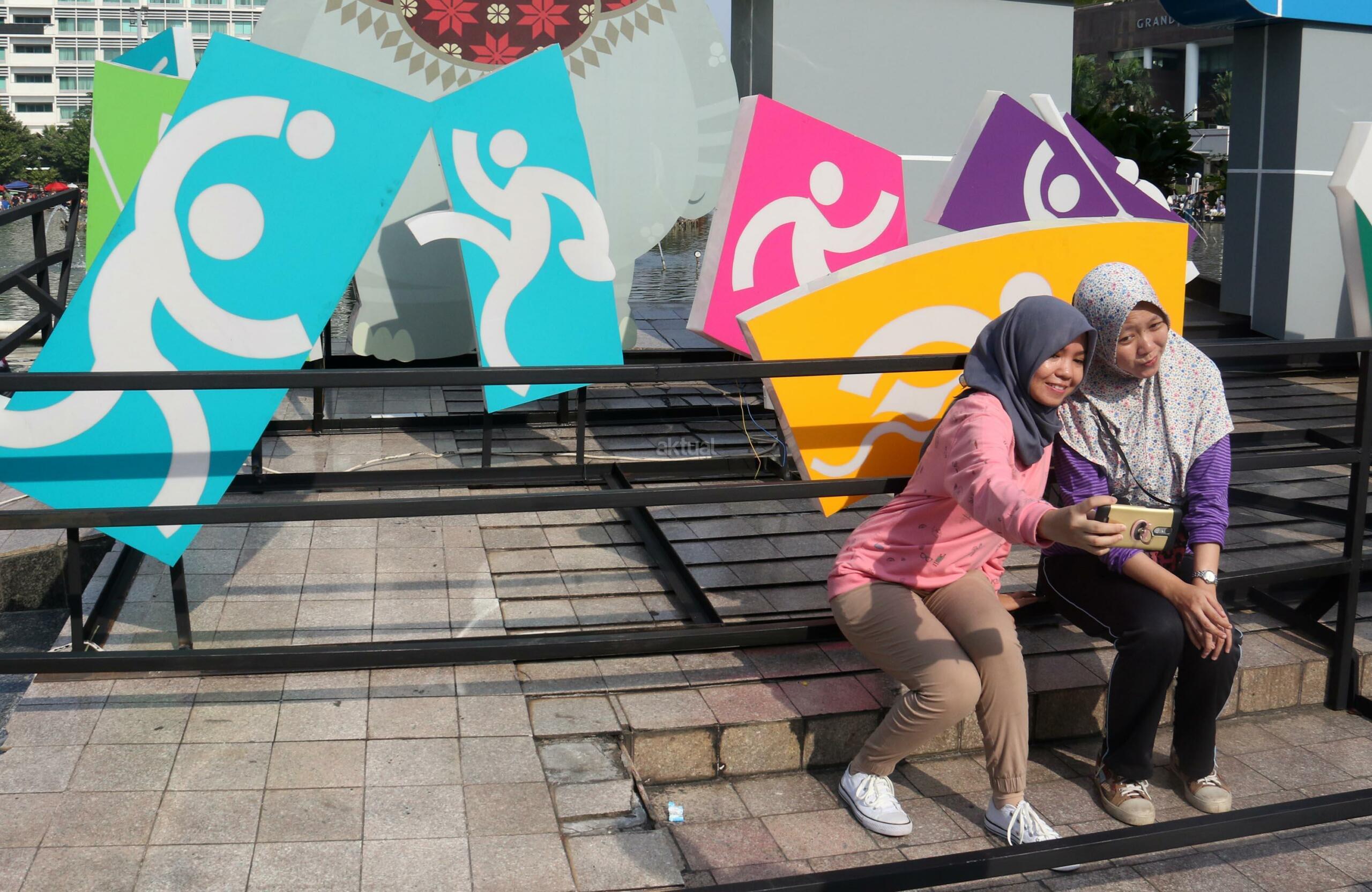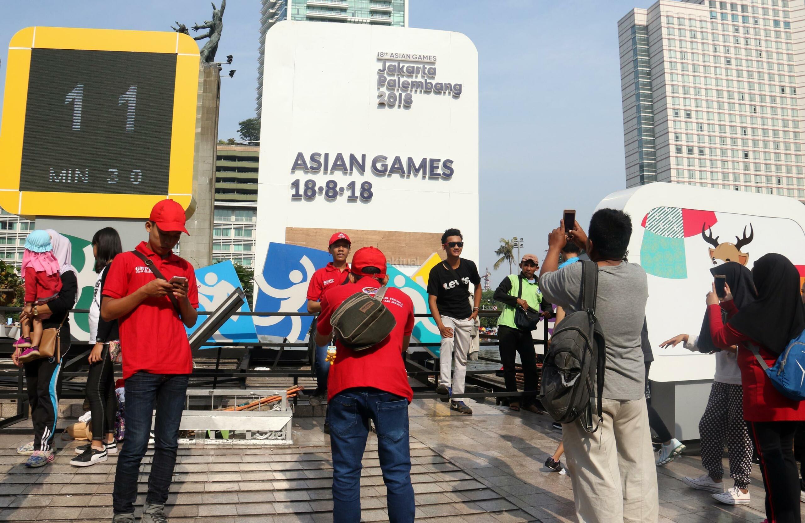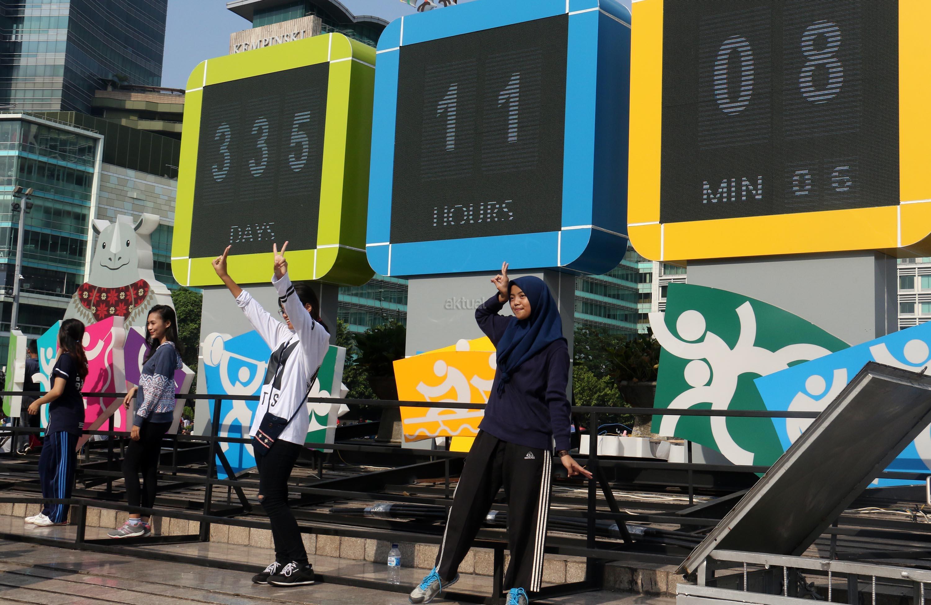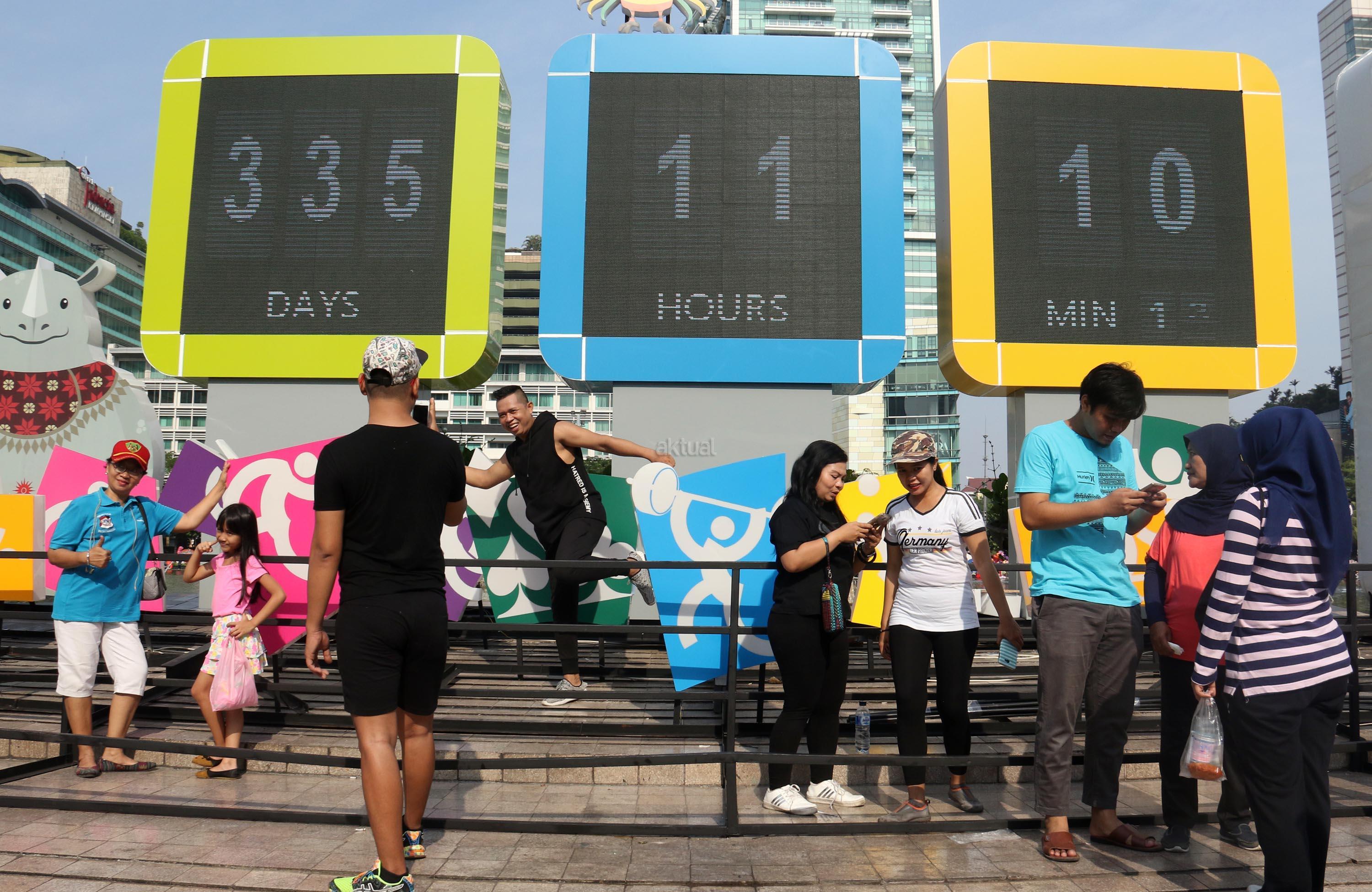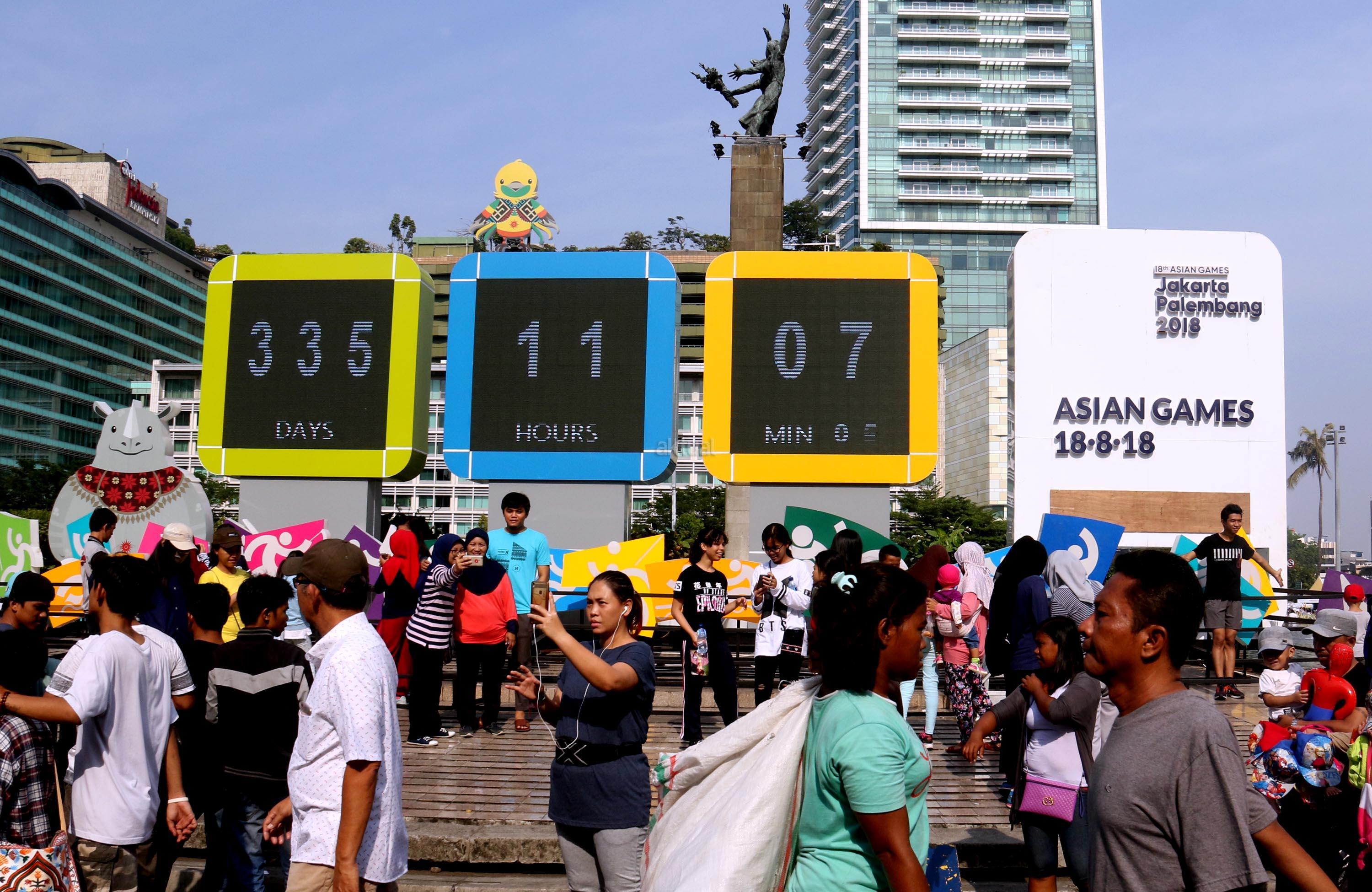 Warga berfoto dengan latar layar Countdown Asian Games 2018 saat Car Free Day di Bundaran HI, Jakarta, Minggu, (17/9/2017). Layar Countdown Asian Games 2018 ini menandai hitung mundur untuk pelaksanaan Asian Games 2018. AKTUAL/Munzir