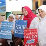 Ketua DPW PKS DKI Jakarta Bidang Perempuan dan Ketahanan Keluarga Solikhah (paling kiri) bersama isteri Bendahara Umum dan pengurus BPKK DPD PKS Jakarta Utara, menunjukkan salam 3 jari, dalam Gebyar Rumah Keluarga Indonesia (RKI) sekaligus memperingati Hari Ibu 2016 di Jakarta Utara, Sabtu (17/12/2016).