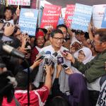 Cawagub DKI Jakarta nomor 3 Sandiaga Uno didampingi Ketua DPW PKS DKI Jakarta Bidang Perempuan dan Ketahanan Keluarga Solikhah, terlihat melayani pertanyaan dari insan media dalam Gebyar Rumah Keluarga Indonesia (RKI) sekaligus memperingati Hari Ibu 2016 di Jakarta Utara, Sabtu (17/12/2016).