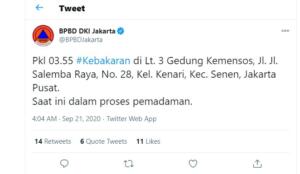 Kebakaran terjadi di lantai 3 Gedung Kemensos, Jalan Salemba Raya nomor 28, Kelurahan Kenari, Kecamatan Senen, Jakarta Pusat, Senin (21/9) pukul 03.55 WIB. Belum diketahui penyebab serta ada tidaknya korban dari insiden ini.