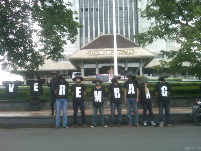 Sejumlah aktivis yang menolak pembangunan pabrik semen di Rembang sejak pukul 13.00 WIB telah melakban mulut mereka hingga pukul 15.00 WIB. Mereka juga memakai sejumlah atribut seperti topi petani dan baliho mengecam keras investasi BI terhadap pendirian pabrik semen di Rembang, Jateng. Dirinya mendesak BI dan OJK karena memiliki regulasi perbankan terkait pengawasan yang ketat.