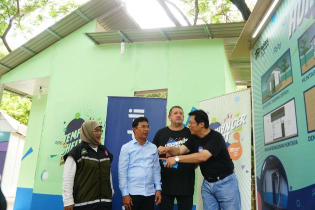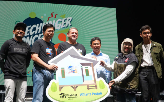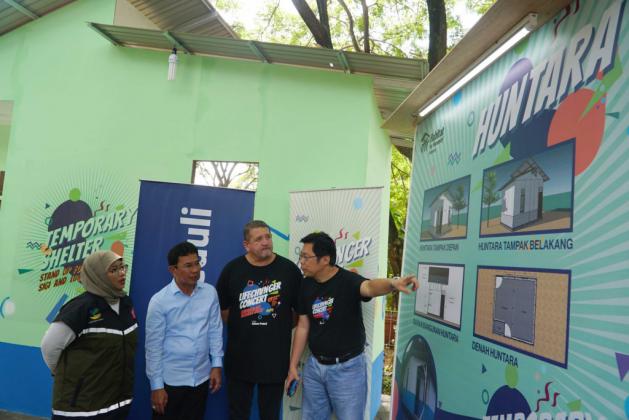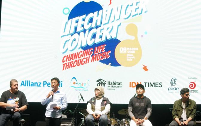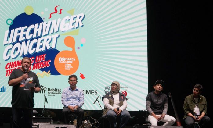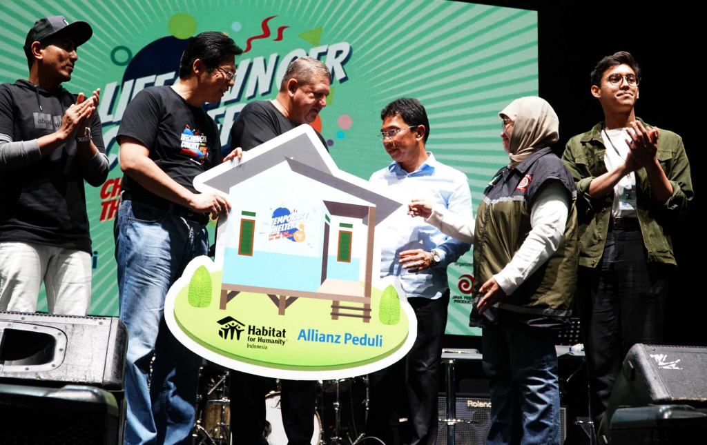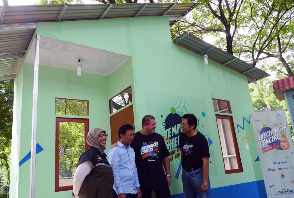 Kasubdit Kesiapsiagaan dan Mitigasi Bencana, Kemensos RI Tetrie Darwis, (kedua kanan), Bupati Sigi Muhamad Irwan Lapata (ketiga kanan), Dewan Pembina Yayasan Allianz Peduli Peter van Zyl (kedua kiri) dan National Director Habitat for Humanity Indonesia Susanto (kedua kiri) bersama artis pendukung saat penyerahan secara simbolis mock up Huntara seusai jumpa pers di Jakarta, Sabtu (9/3). Yayasan Allianz Peduli menggelar Konser Musik Lifechanger yang melibatkan 33 musisi ternama Indonesia di Allianz Ecopark, Ancol pada Sabtu 9 Maret 2019 untuk mengumpulkan donasi yang akan digunakan untuk pembangunan Huntara bagi pengungsi korban gempa Lombok & Sigi Sulawesi Tengah. AKTUAL/STR-Eko S Hilman