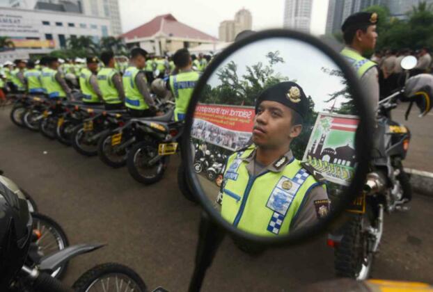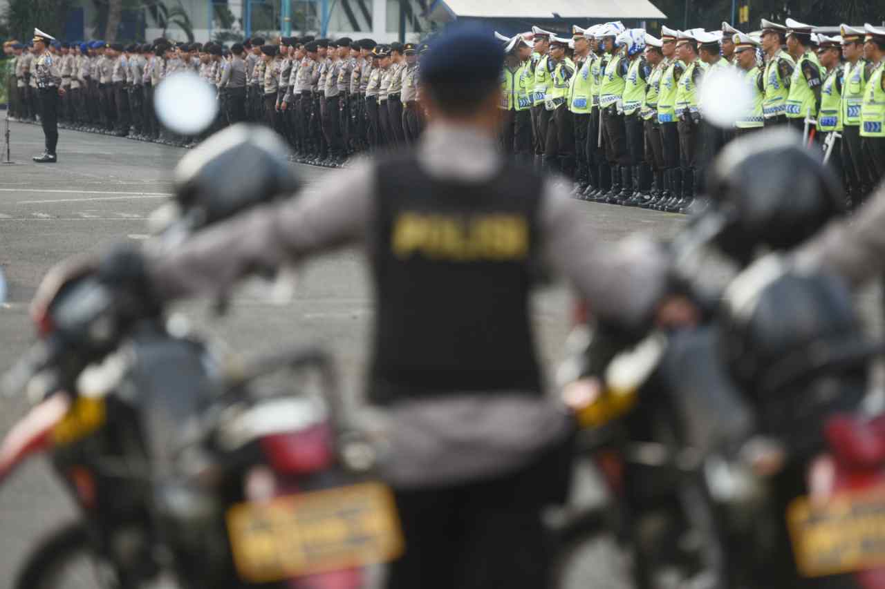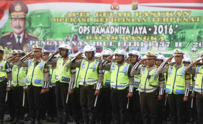 Anggota kepolisian mengikuti apel gelar pasukan pengamanan malam takbiran dan hari raya Idulfitri di Mapolda Metro Jaya, Jakarta, Selasa (5/7). Polda Metro Jaya mengerahkan 6.984 personel guna mengamankan malam takbiran dan Hari Raya Idulfitri. ANTARA FOTO/Akbar Nugroho Gumay/aww/16.