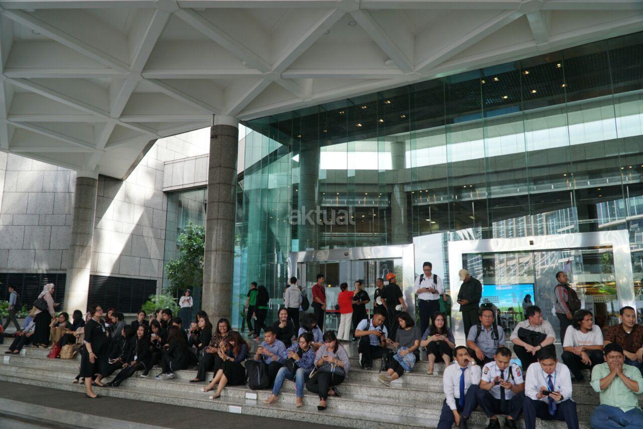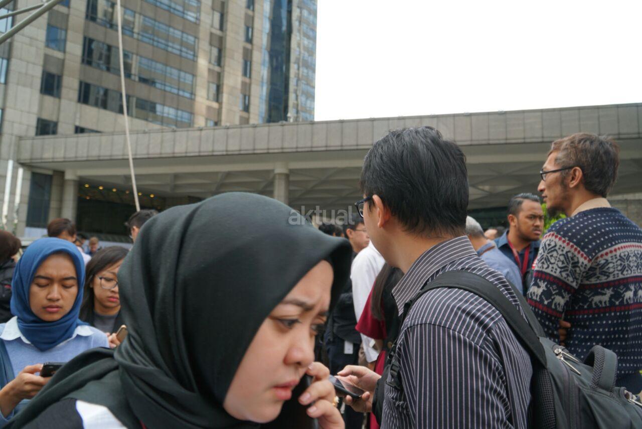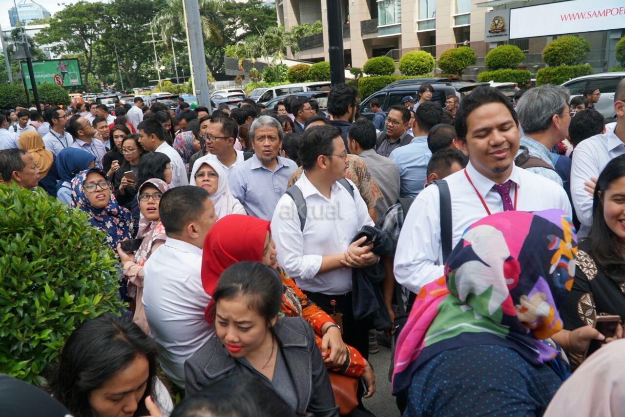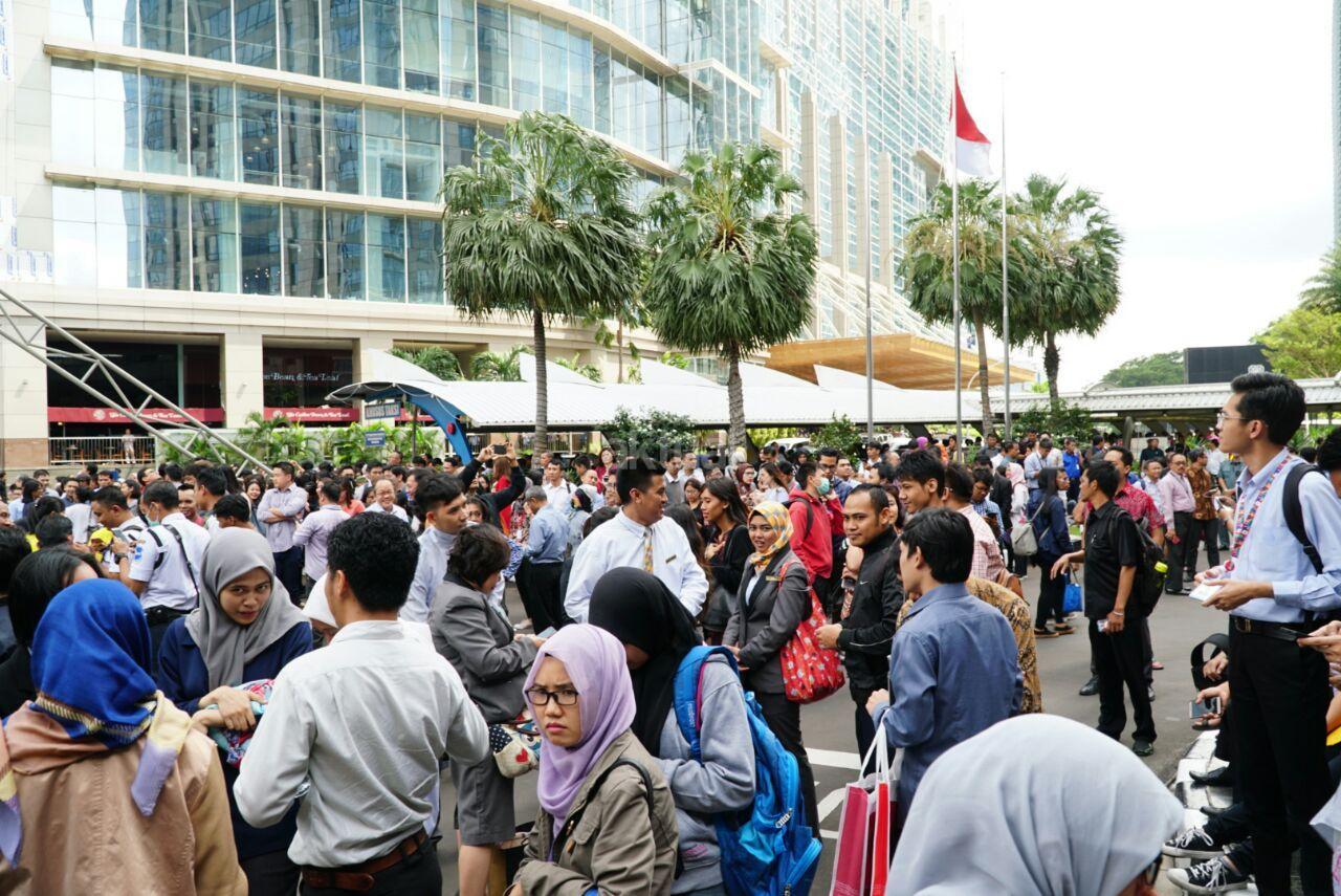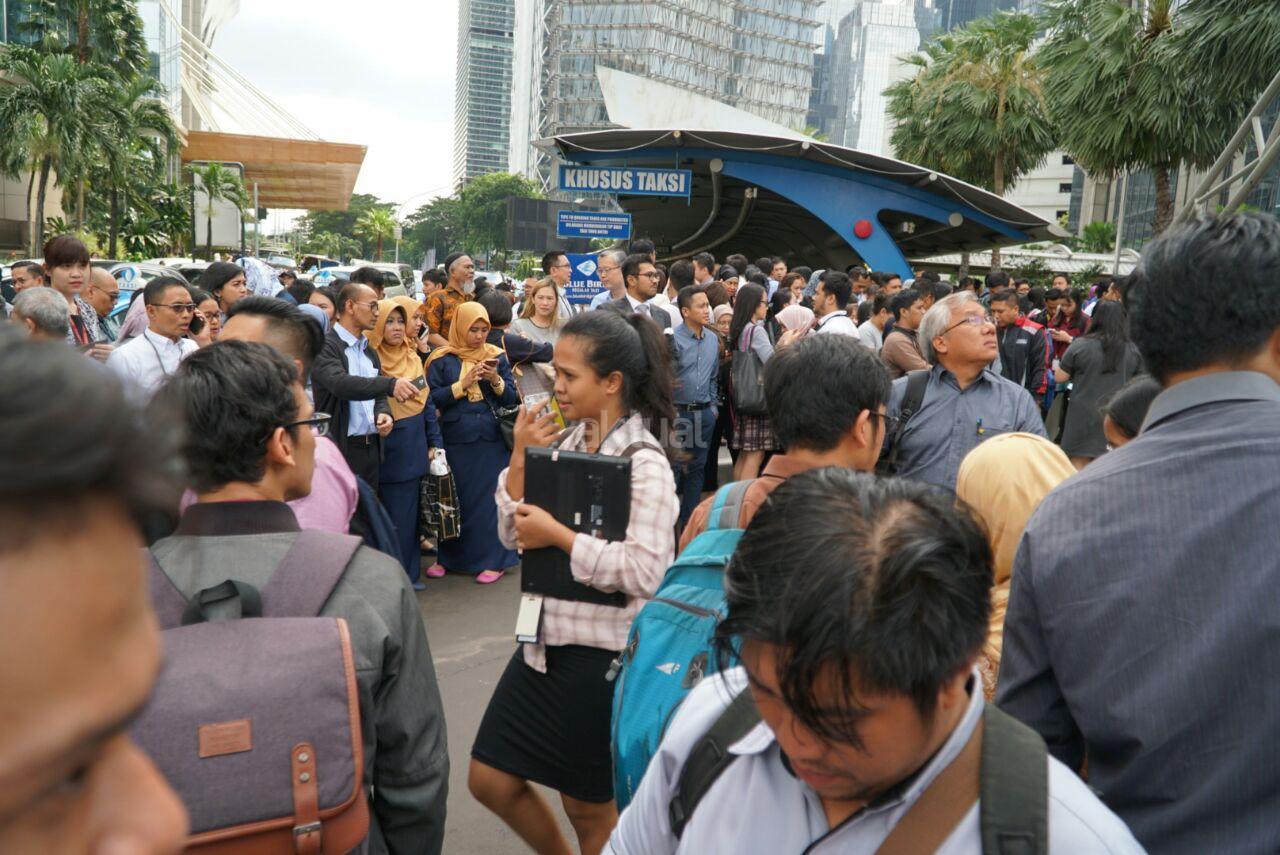 Sejumlah karyawan keluar berhamburan menyelamatkan diri saat terjadi gempa bumi di kawasan SCBD, Jakarta, Selasa (23/1/2018). BMKG menyebut gempa yang menggoyang Jakarta berpusat di Lebak Banten dengan besar 6,4 Magnitudo. Gempat tersebut tidak berpotensi tsunami. Gempa terjadi pada pukul 13.34.50, Selasa (23/1/2018), tidak hanya dirasakan di Jakarta, tetapi juga sekitar Banten, Tangerang, dan Bekasi. AKTUAL/Eko S Hilman