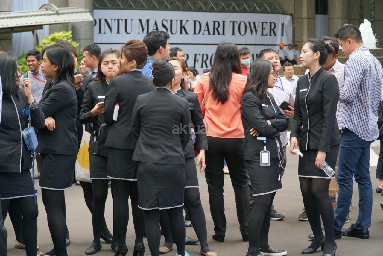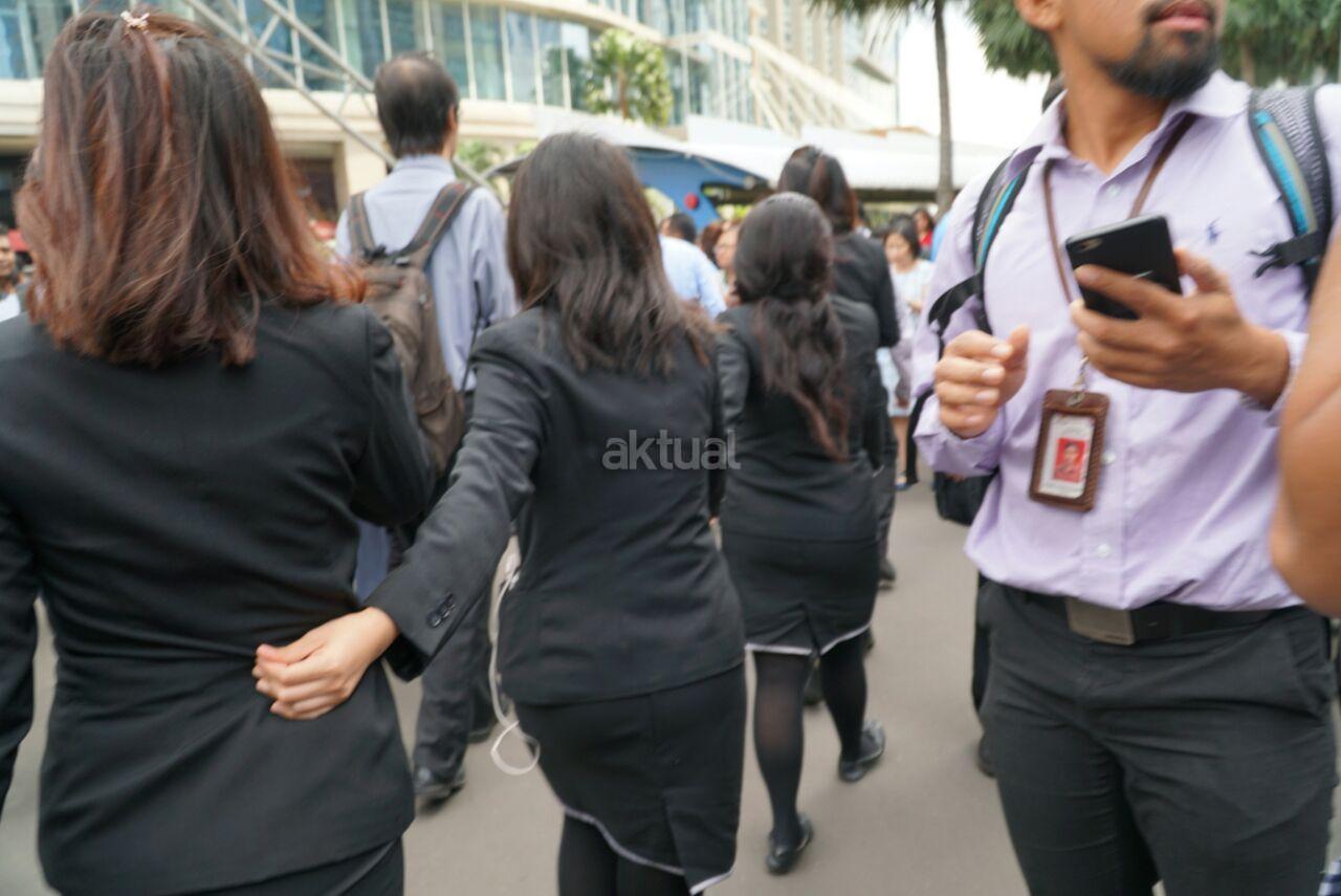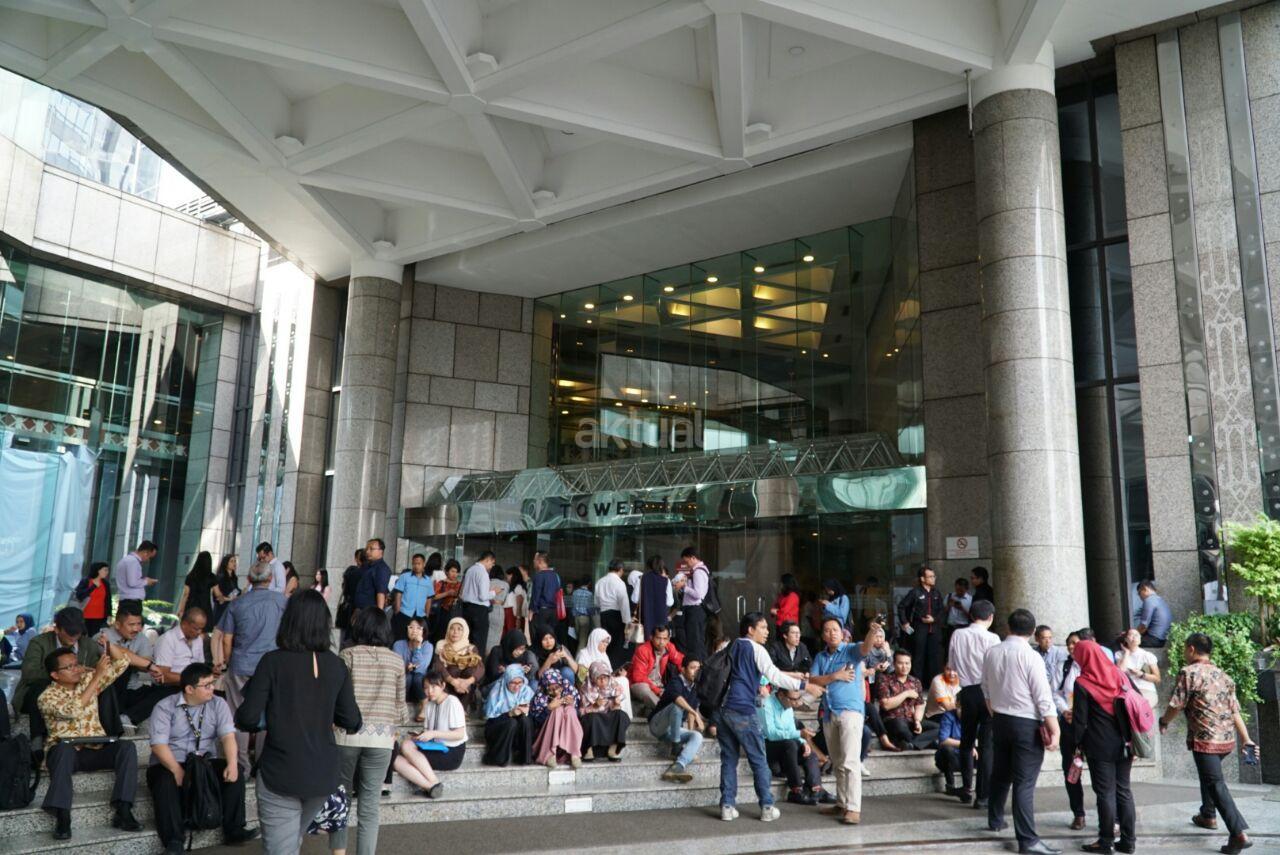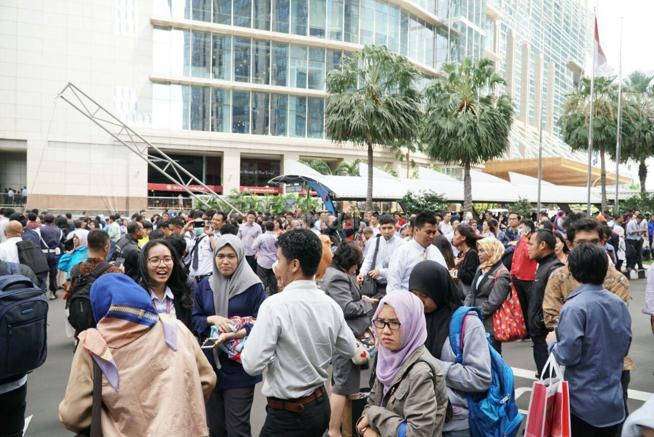 Sejumlah karyawan keluar berhamburan menyelamatkan diri saat terjadi gempa bumi di kawasan SCBD, Jakarta, Selasa (23/1/2018). BMKG menyebut gempa yang menggoyang Jakarta berpusat di Lebak Banten dengan besar 6,4 Magnitudo. Gempat tersebut tidak berpotensi tsunami. Gempa terjadi pada pukul 13.34.50, Selasa (23/1/2018), tidak hanya dirasakan di Jakarta, tetapi juga sekitar Banten, Tangerang, dan Bekasi. AKTUAL/Eko S Hilman