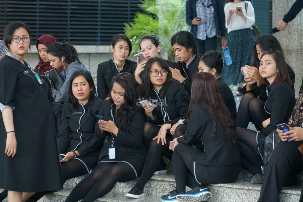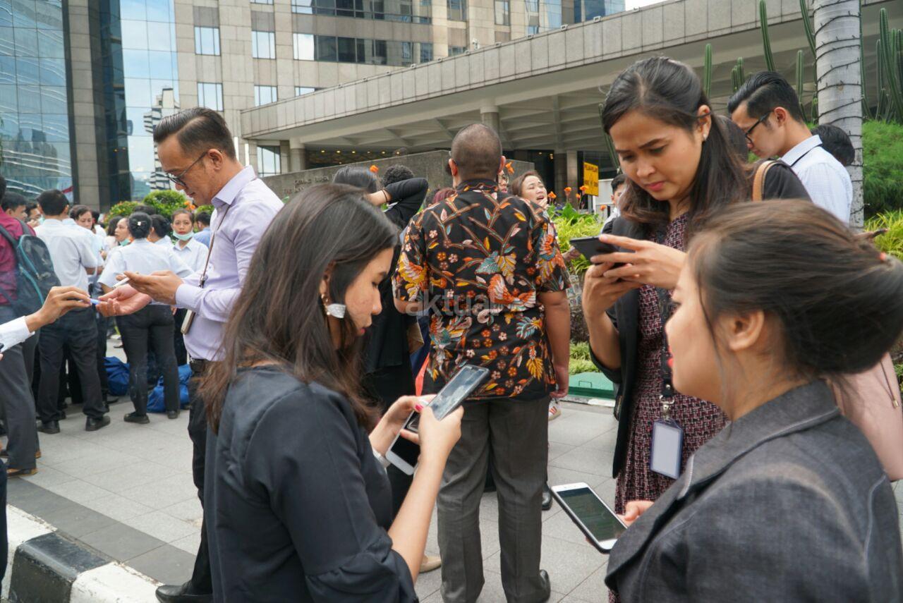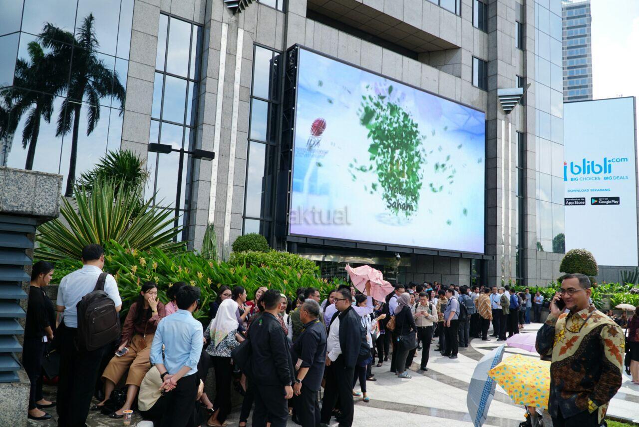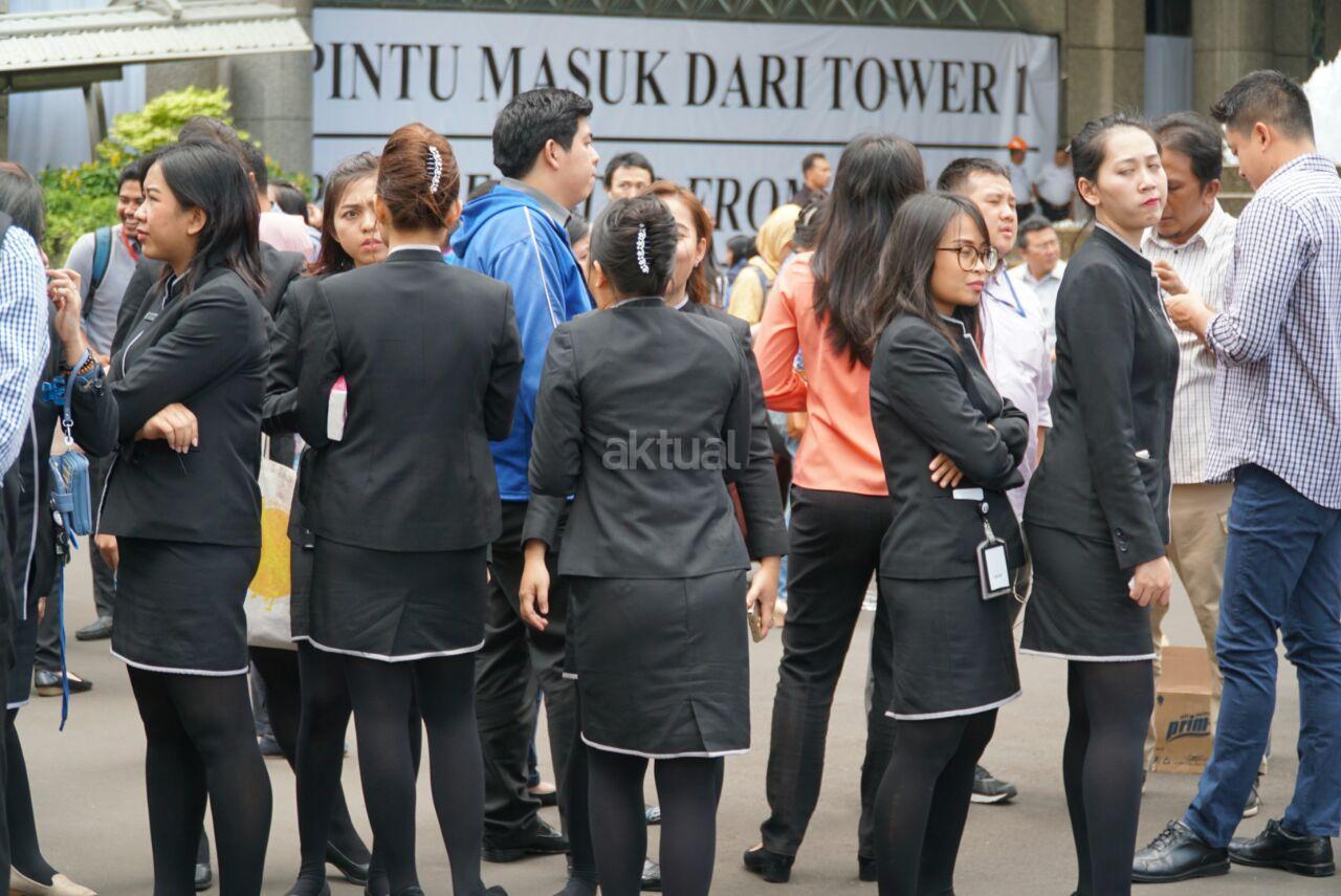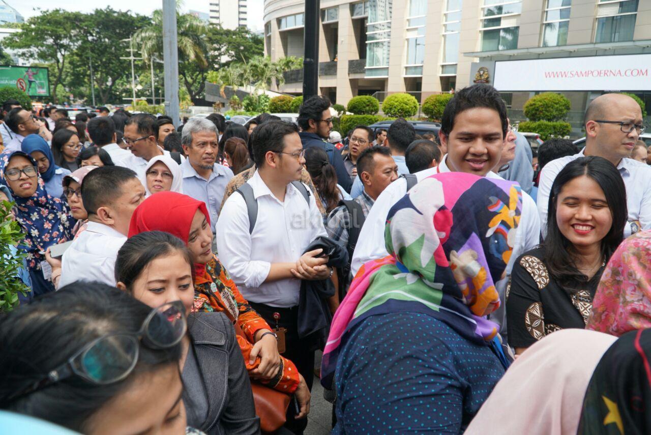 Sejumlah karyawan keluar berhamburan menyelamatkan diri saat terjadi gempa bumi di kawasan SCBD, Jakarta, Selasa (23/1/2018). BMKG menyebut gempa yang menggoyang Jakarta berpusat di Lebak Banten dengan besar 6,4 Magnitudo. Gempat tersebut tidak berpotensi tsunami. Gempa terjadi pada pukul 13.34.50, Selasa (23/1/2018), tidak hanya dirasakan di Jakarta, tetapi juga sekitar Banten, Tangerang, dan Bekasi. AKTUAL/Eko S Hilman