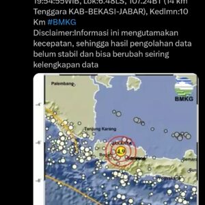 Episentrum gempa berada di di 14 kilometer tenggara Kabupaten Bekasi, Jawa Barat.