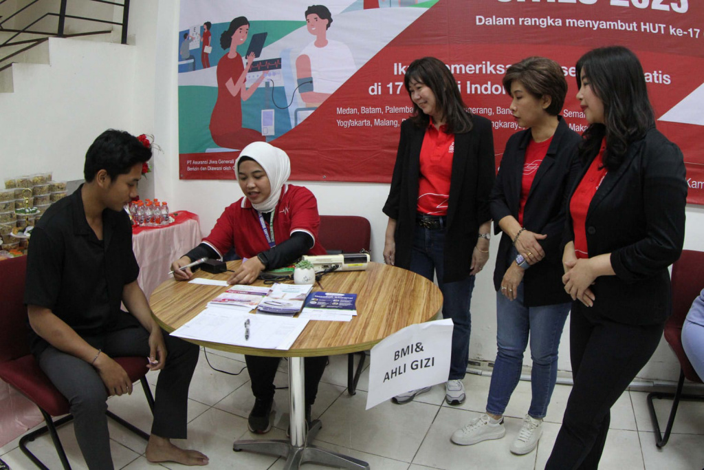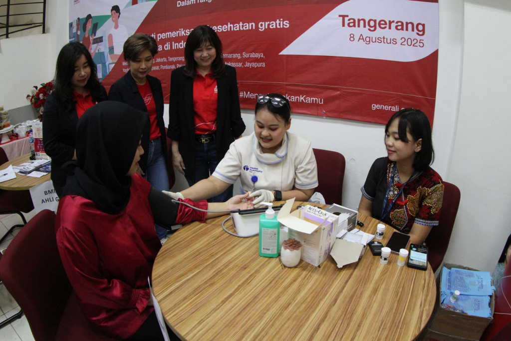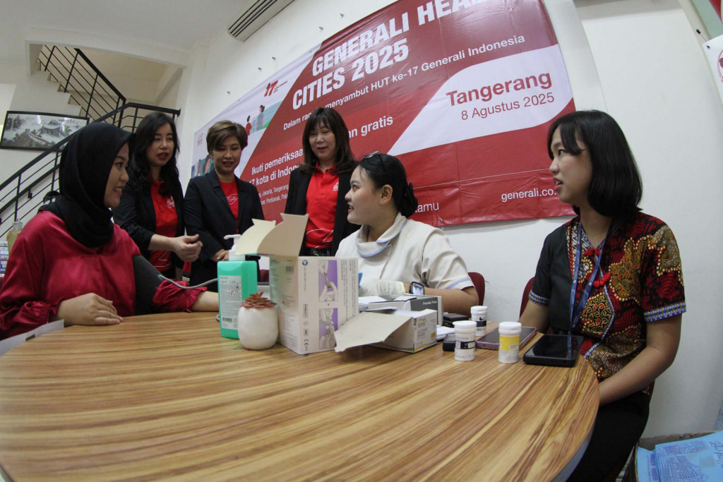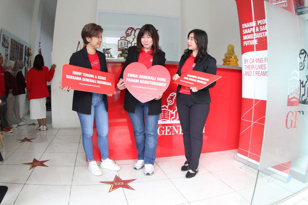 Direktur dan Chief Agency Officer Jutany Japit (berdiri kanan) bersama Chief Corporate Solution Netty Chan (berdiri tengah) dan Chief Marketing Officer Elia C. Wijaya (berdiri kiri) saat hadir dalam Generali Health Cities di Kota Tangerang, Banten, Jumat, (8/2025). Generali Health Cities merupakan wujud kepedulian Generali Indonesia pada kesehatan masyarakat sekaligus dalam rangkaian ulang tahun perusahaan ke-17. Roadshow Generali Health Cities berlangsung di 17 kota, selama bulan Juni, Juli dan Agustus. Aktual/TINO OKTAVIANO