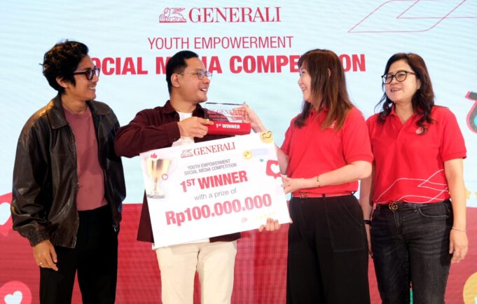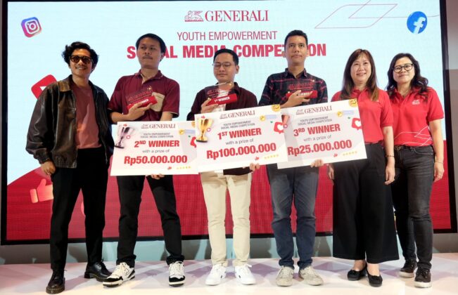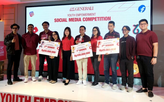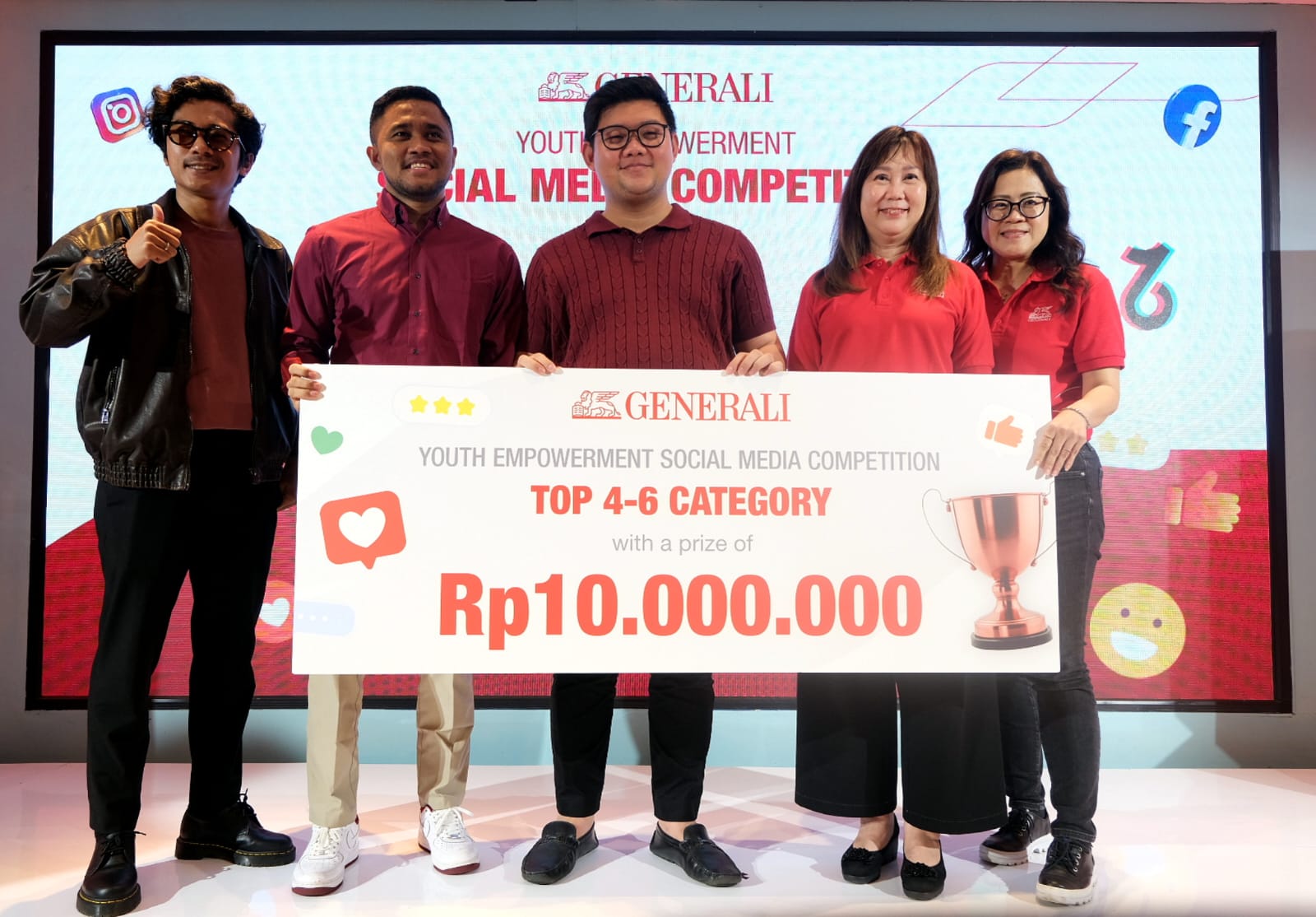 Director Chief Agency Officer Generali Indonesia, Jutany Japit (kedua kanan) didampingi Chief Product Management and Marketing Officer Generali Indonesia, Jong Wie Siu (kanan) bersama Digital Creator and Al Tech Educator sekaligus juri kompetisi Ajazil Hawaris foto bersama pemenang Youth Empowerment Social Media Competition Generali Indonesia.