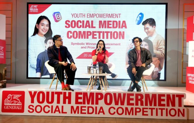 Chief Product Management and Marketing Officer Generali Indonesia, Jong Wie Siu (tengah) dan Digital Creator and Al Tech Educator sekaligus juri kompetisi, Ajazil Hawaris (kanan) saat menyampaikan ulasan seputar Youth Empowerment Social Media Competition, sebuah inisiatif yang mengajak generasi muda dan content creator untuk menciptakan konten edukasi keuangan, khususnya terkait pentingnya proteksi asuransi.
